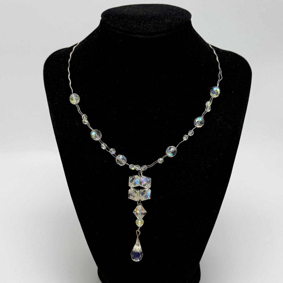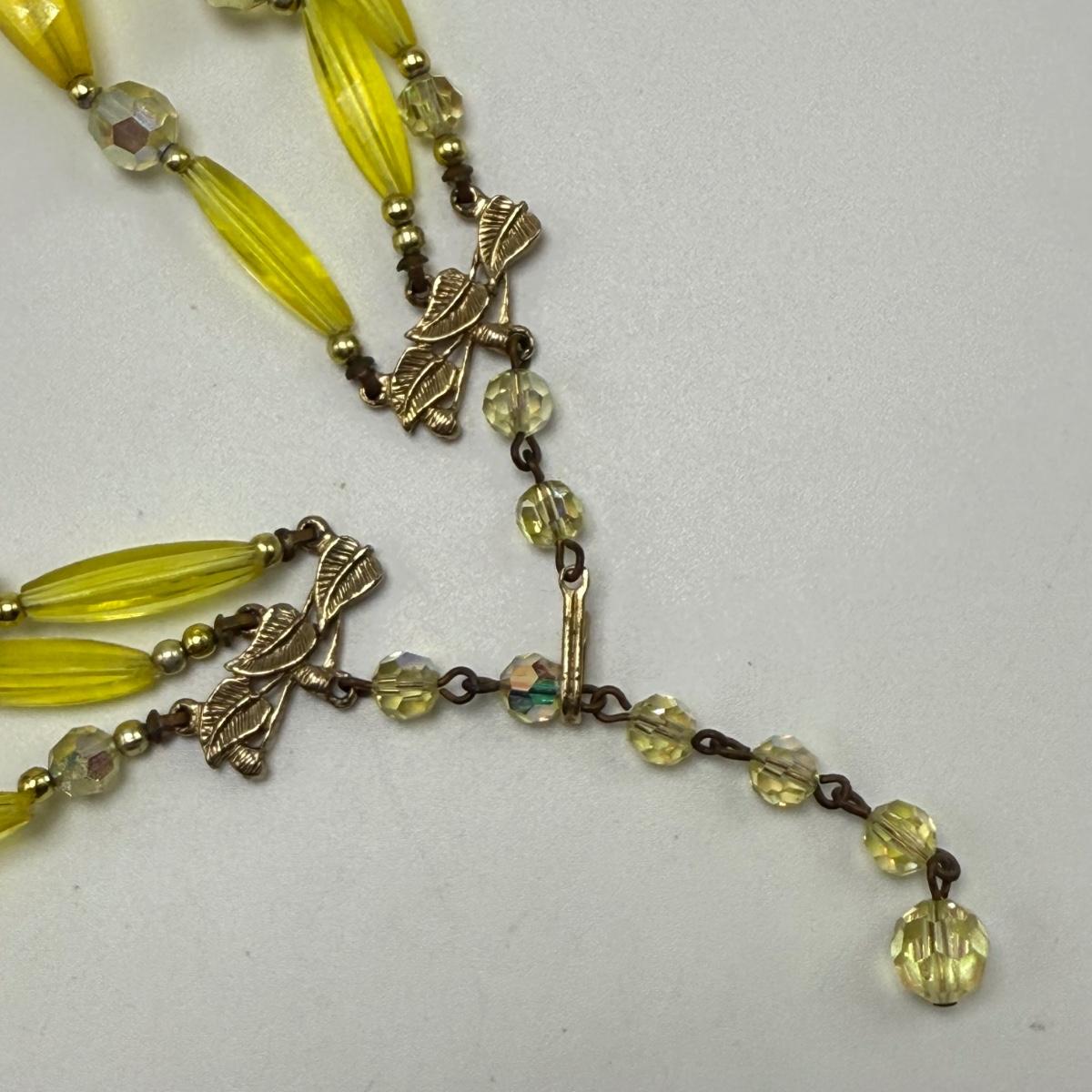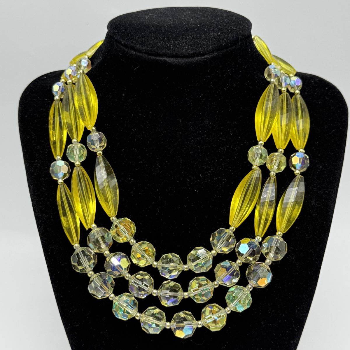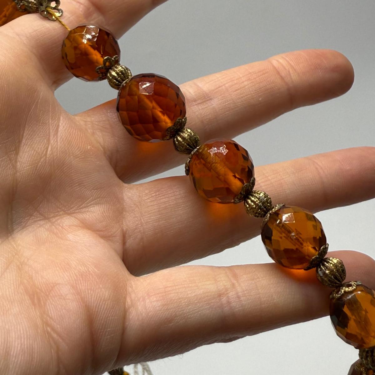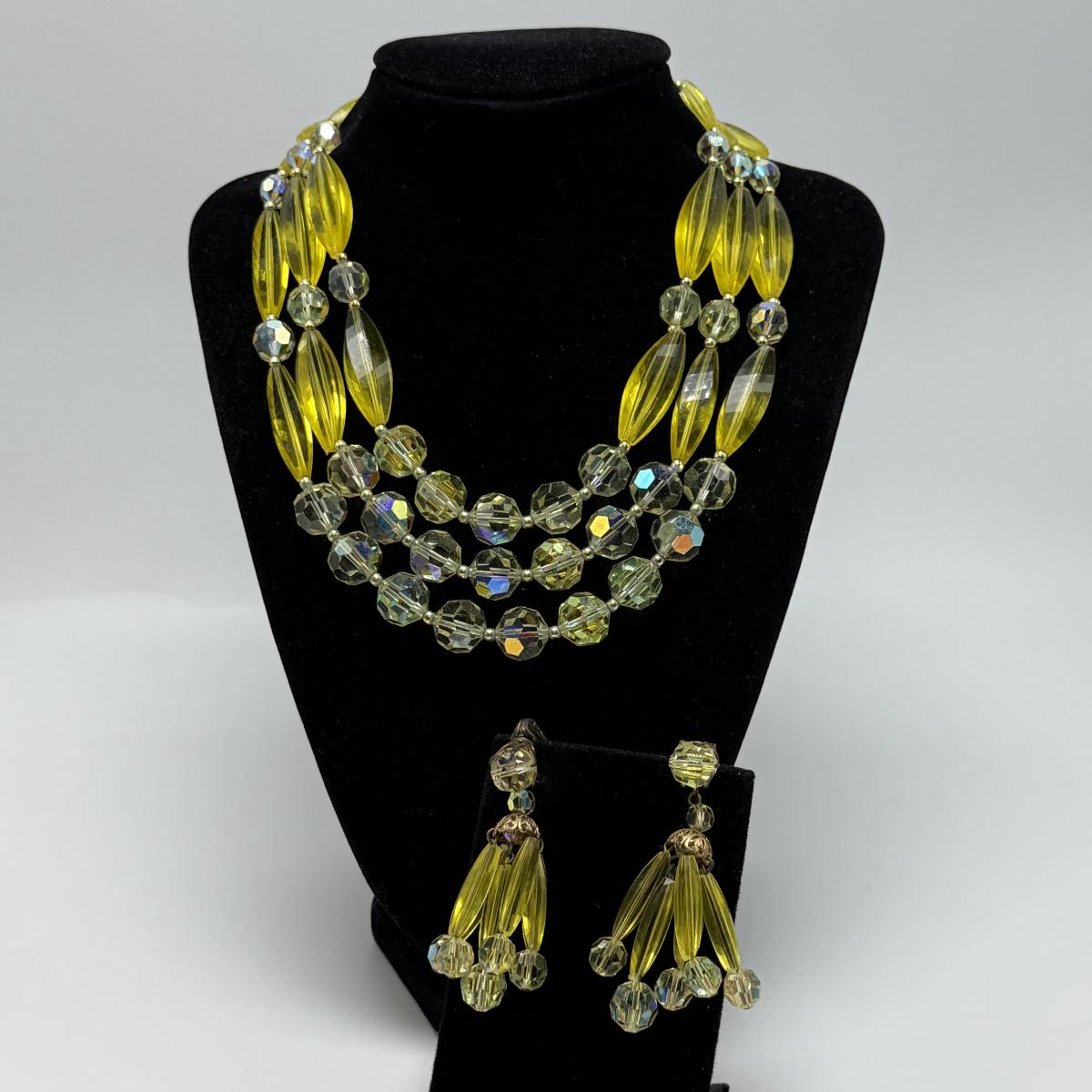 Seven vintage beaded necklaces. One has a matching pair of clip-on earrings. A few of the necklaces have previous price tags with descriptions attached. We cannot verify the information on the tags. One clasp is stamped “Sterling”. The longest necklace, showed doubled up, is approximately 54“. The pink multi-strand necklace needs a new clasp.