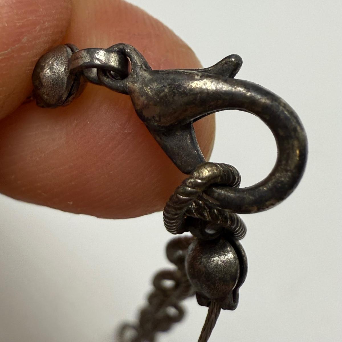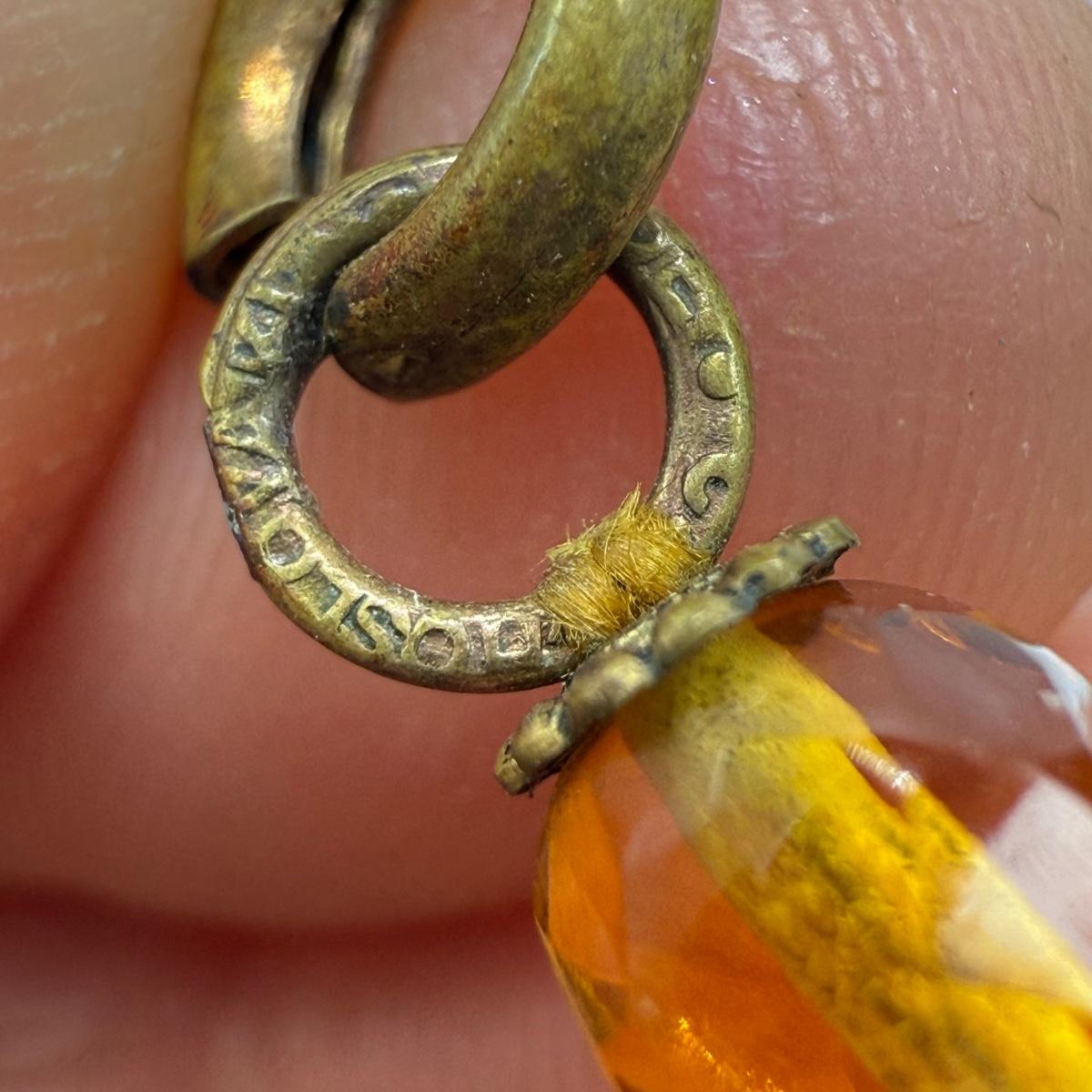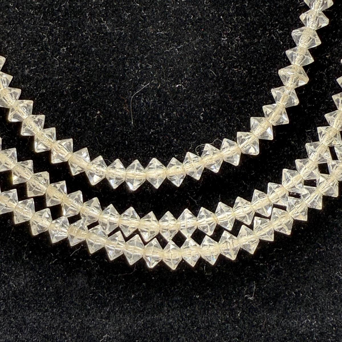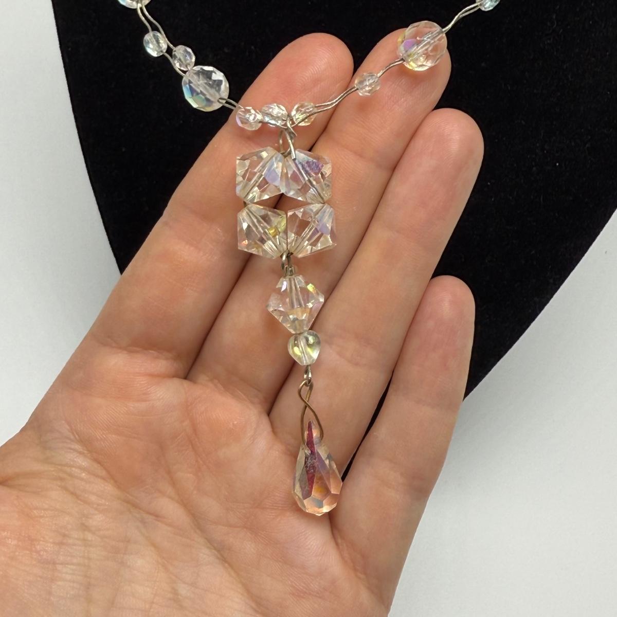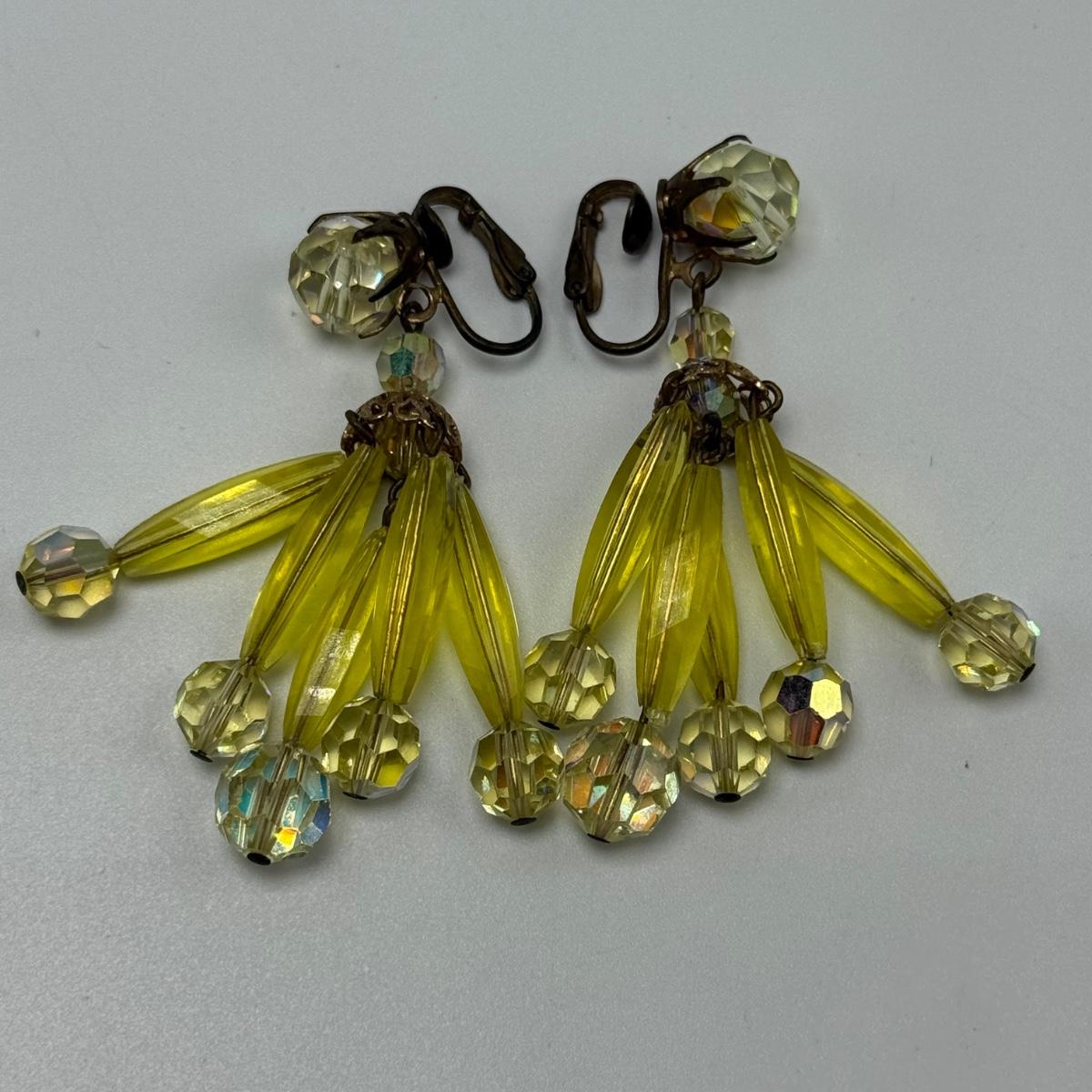 Seven vintage beaded necklaces. One has a matching pair of clip-on earrings. A few of the necklaces have previous price tags with descriptions attached. We cannot verify the information on the tags. One clasp is stamped “Sterling”. The longest necklace, showed doubled up, is approximately 54“. The pink multi-strand necklace needs a new clasp.