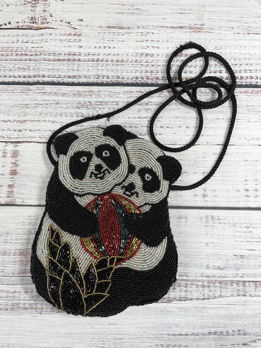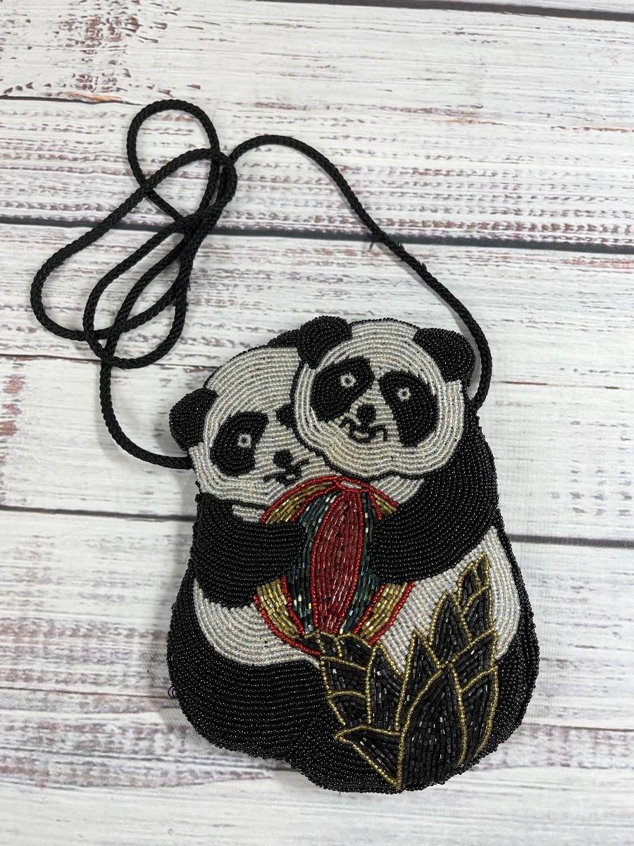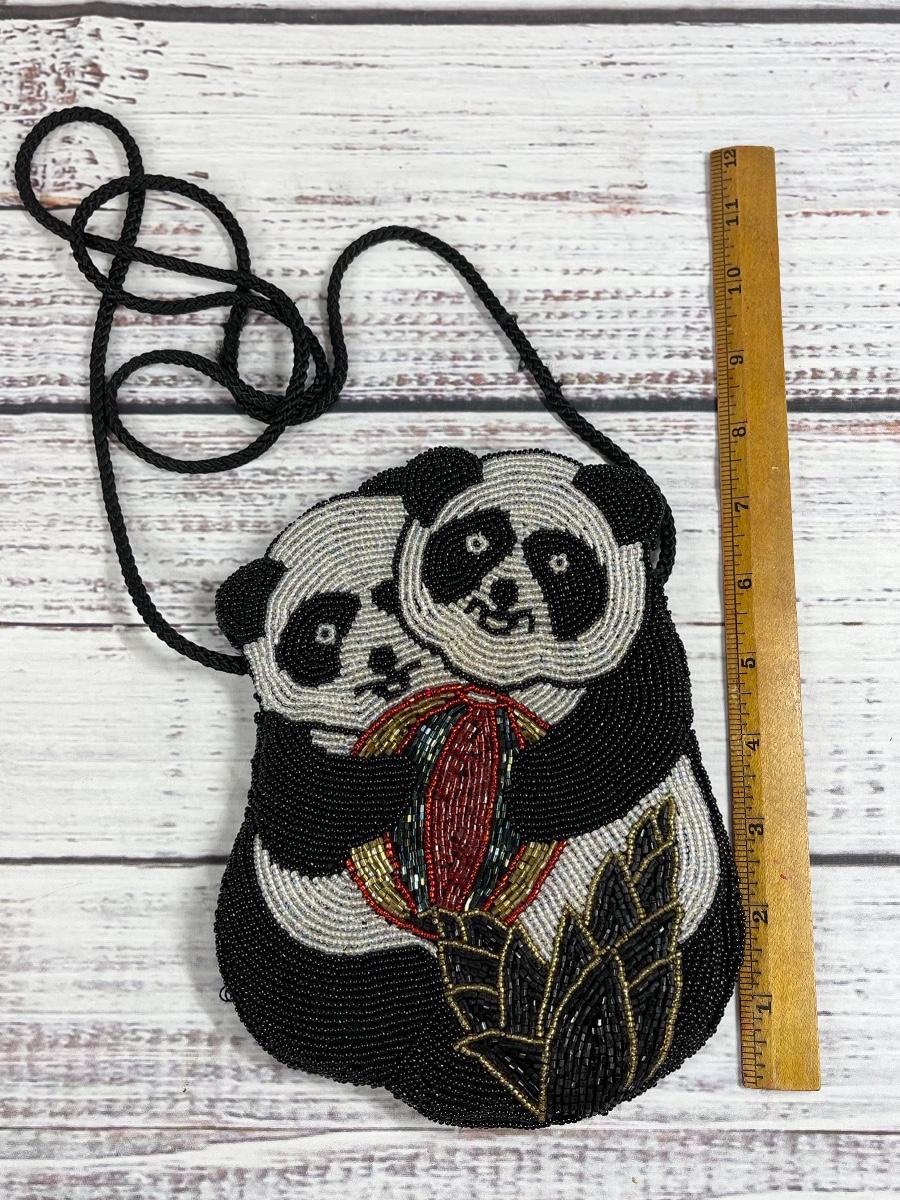 Hole on the side of the bag. Picture of the pandas are in perfect condition. Purse is about 7” tall.