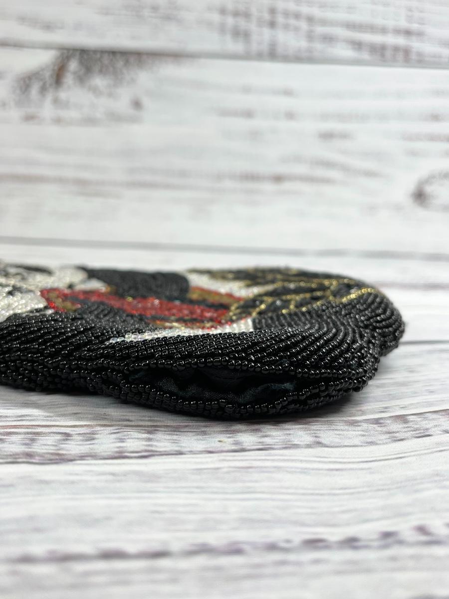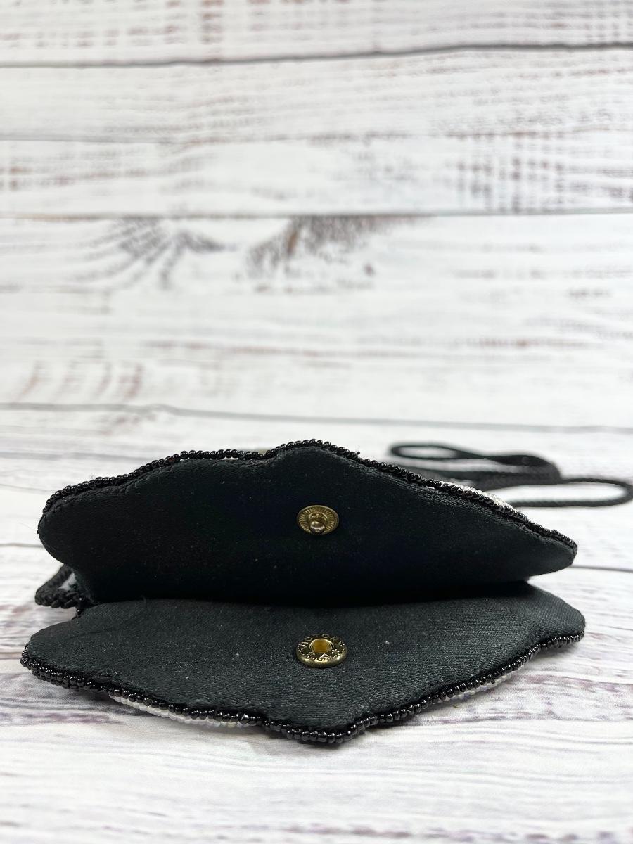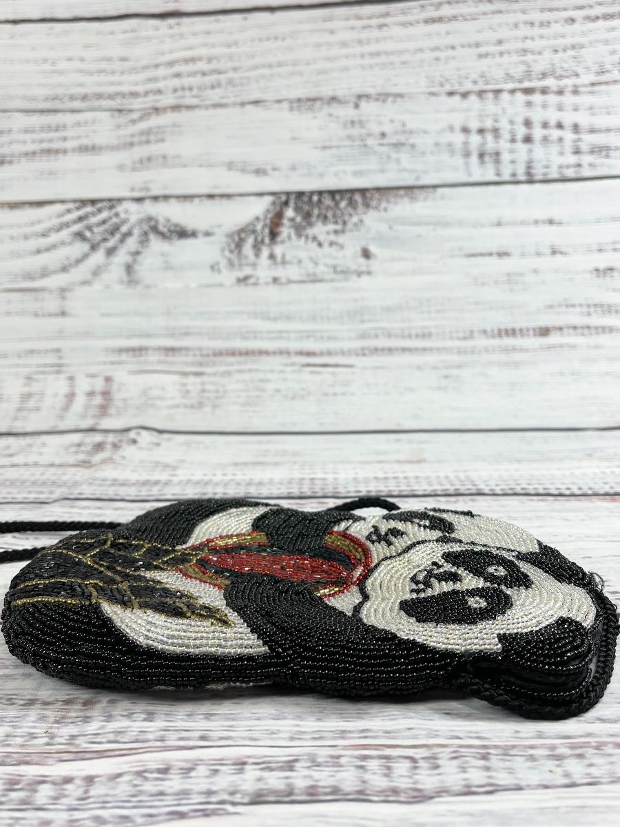 Hole on the side of the bag. Picture of the pandas are in perfect condition. Purse is about 7” tall.