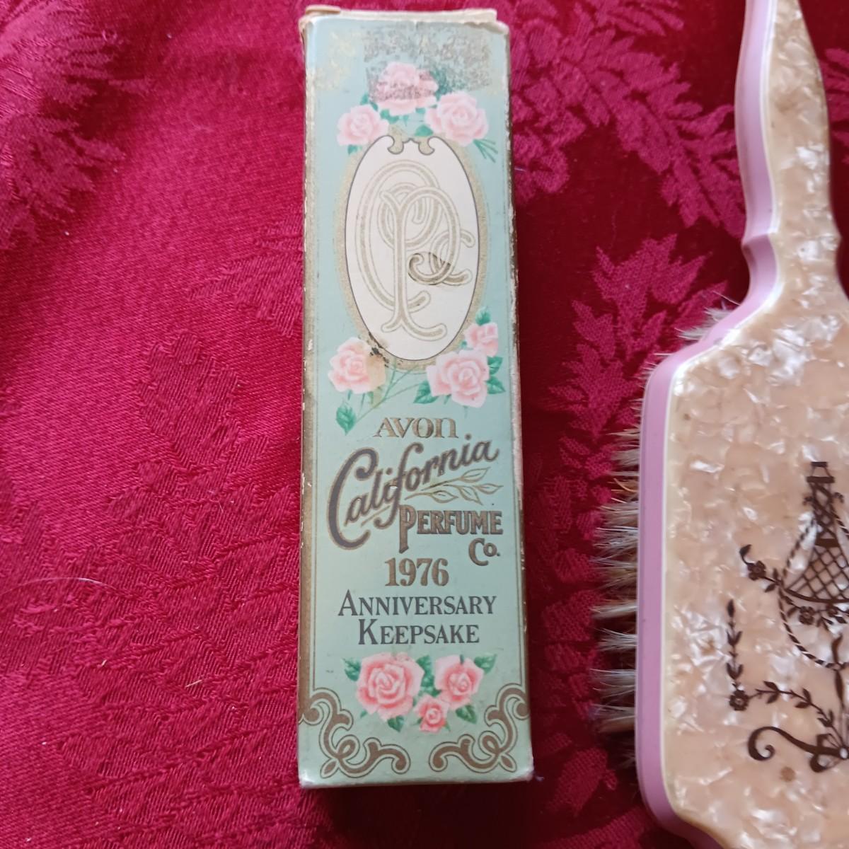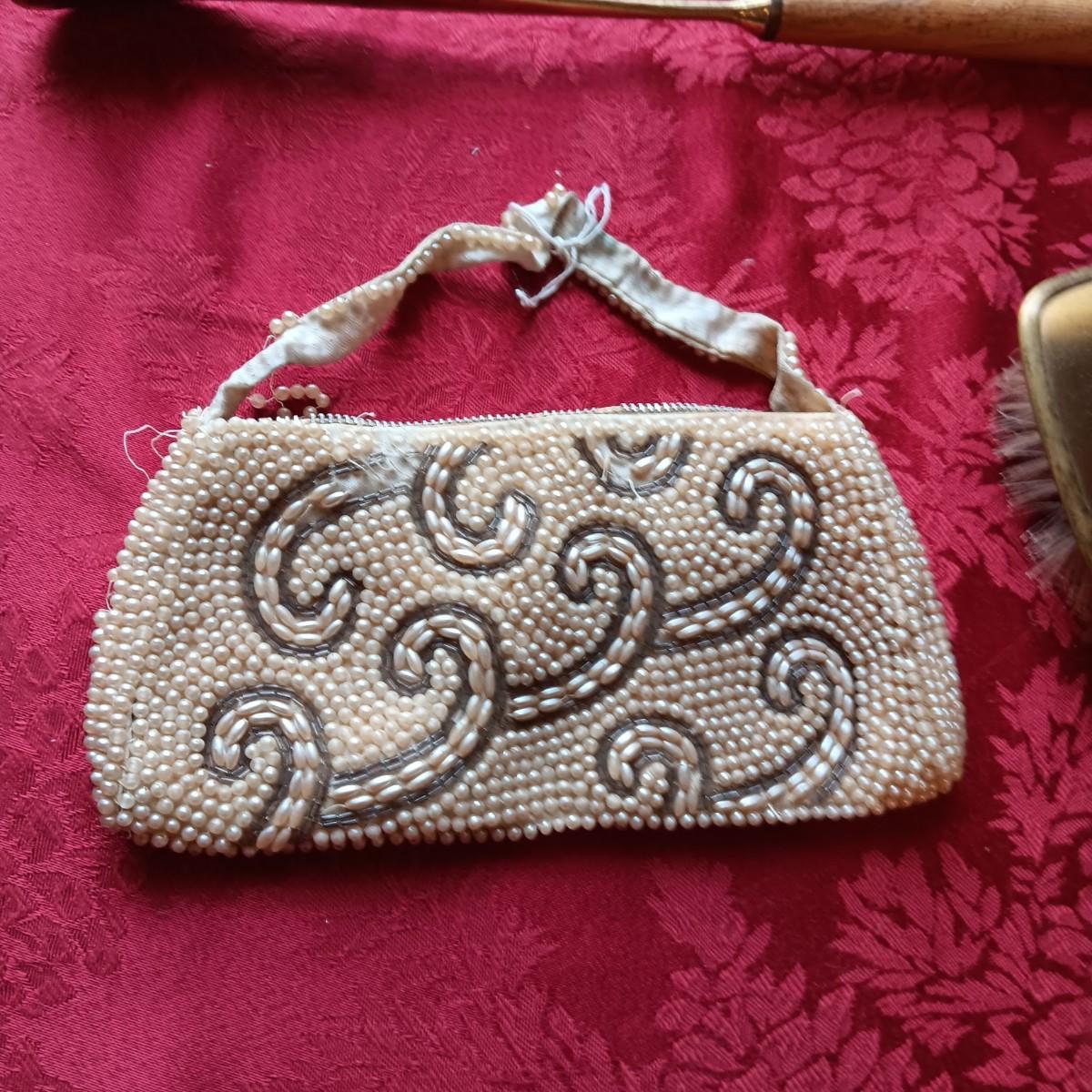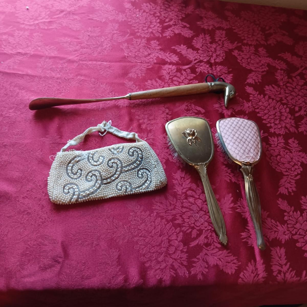 VINTAGE BEADED PURSE IN NEED OF REPAIR, OLD HAIR BRUSHES, DUCK HEAD SHOE HORN AND OLD AVON PERFUME