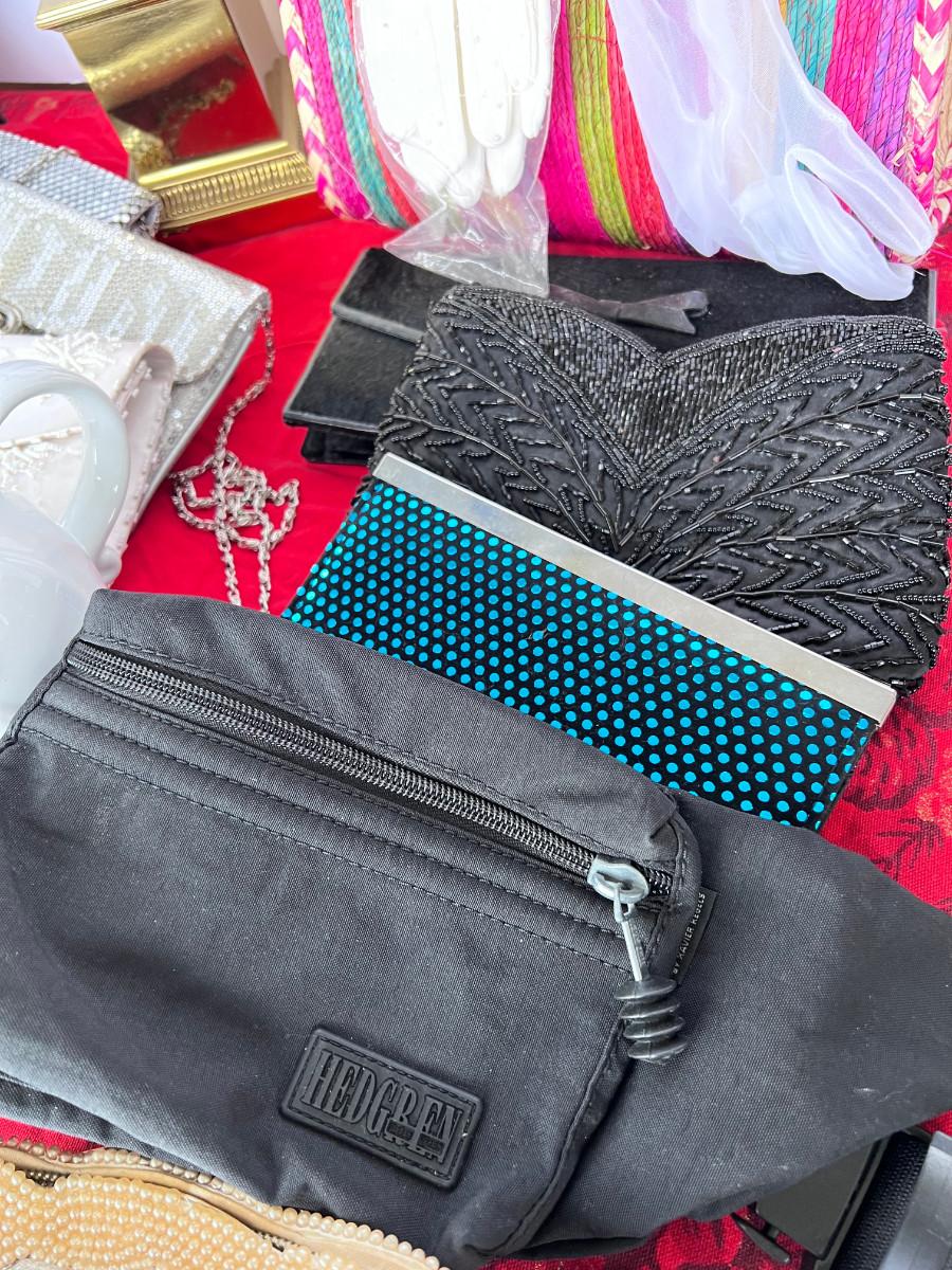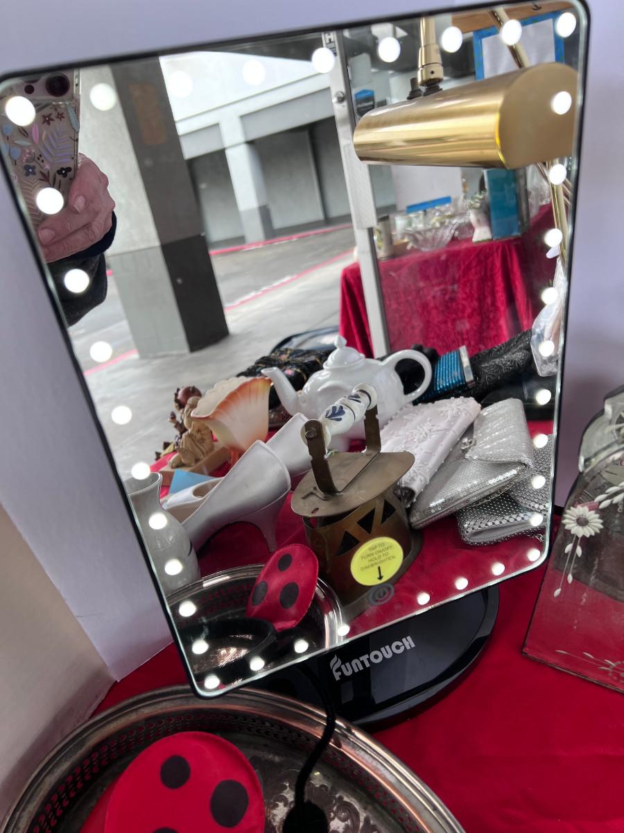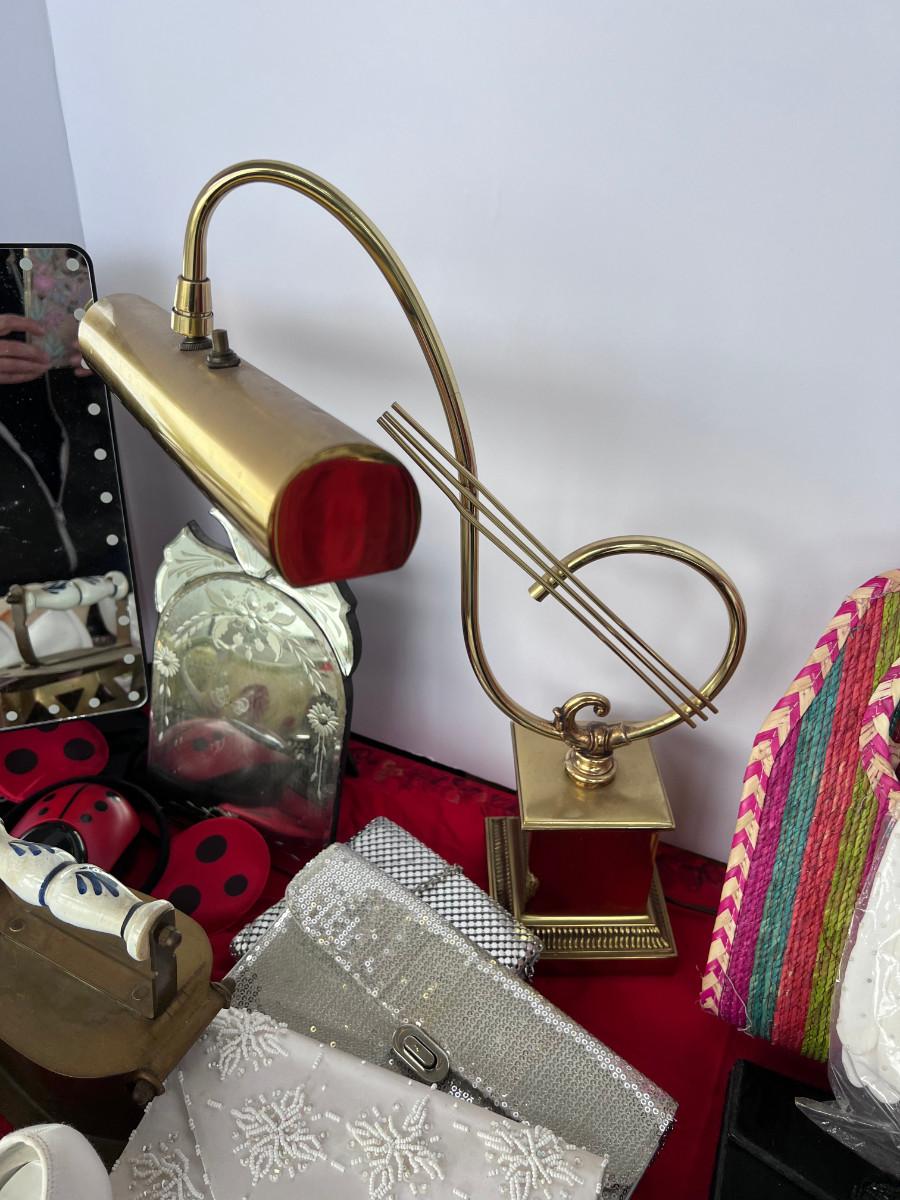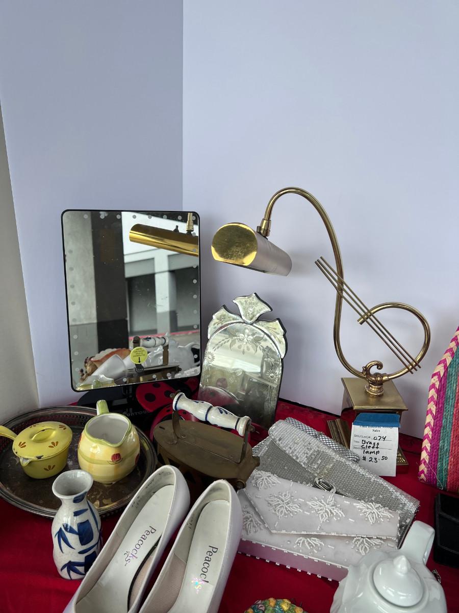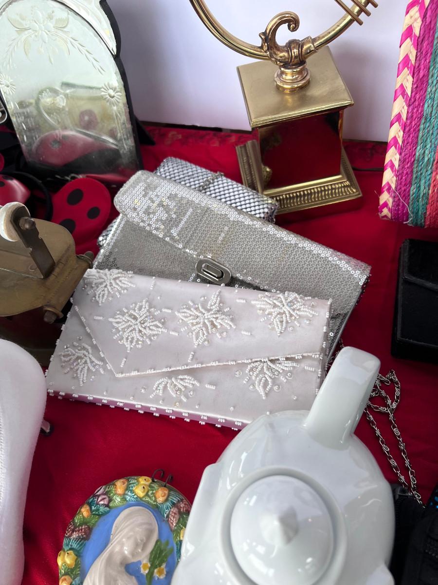 Vintage beaded purses, Mirrors, brass Musical Cleft light