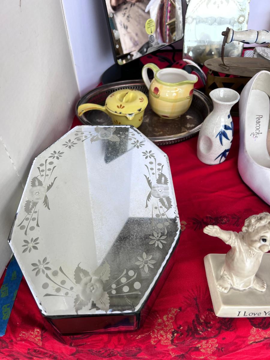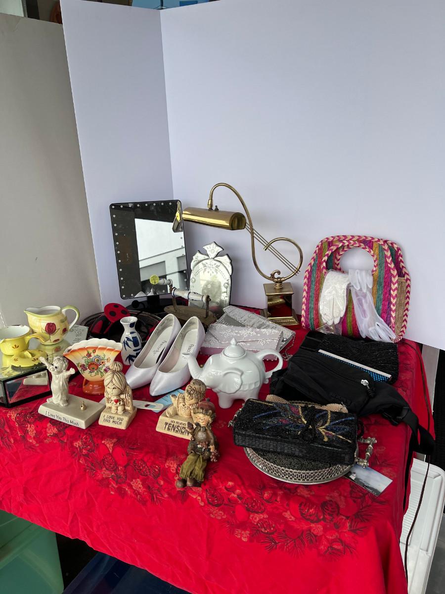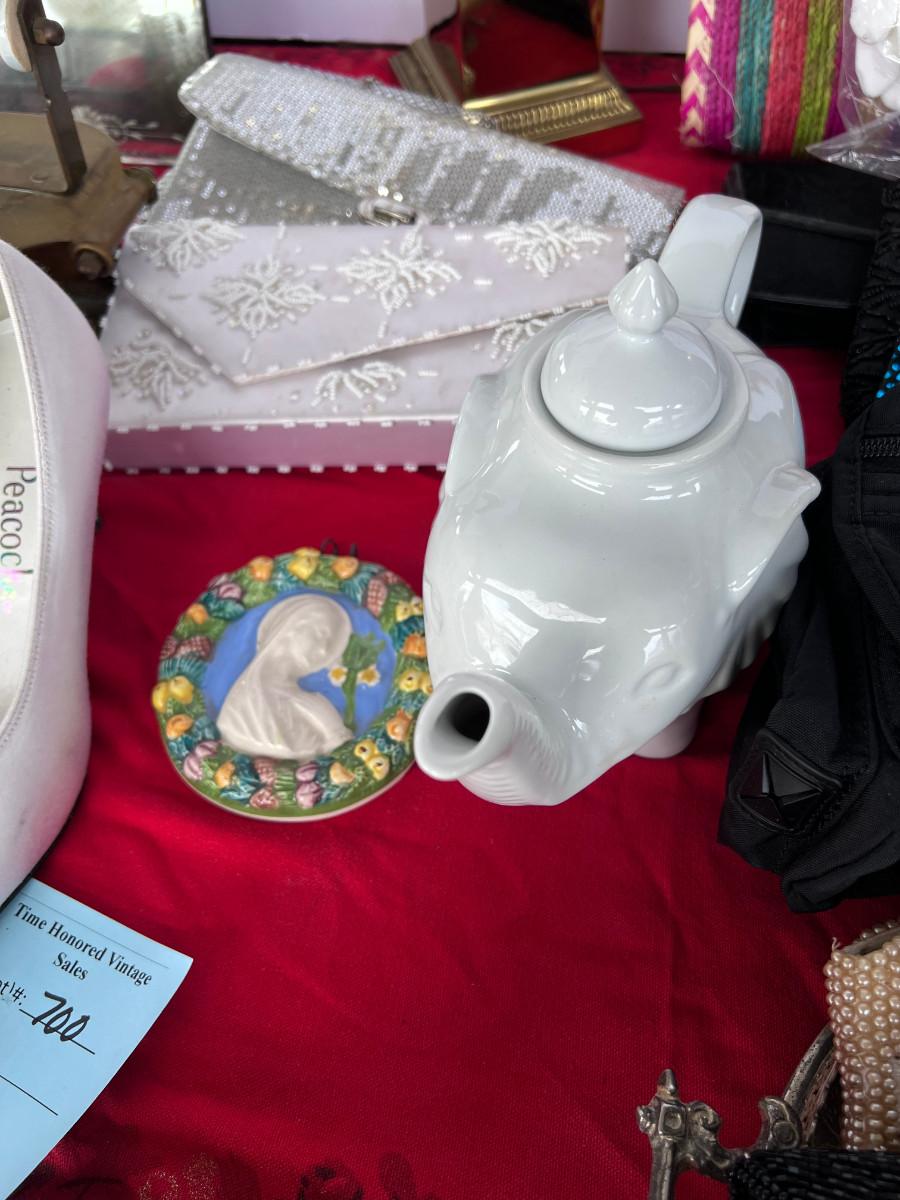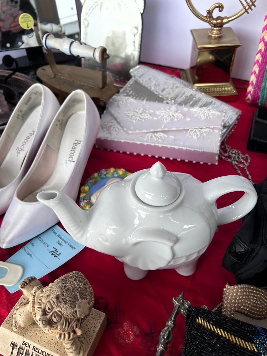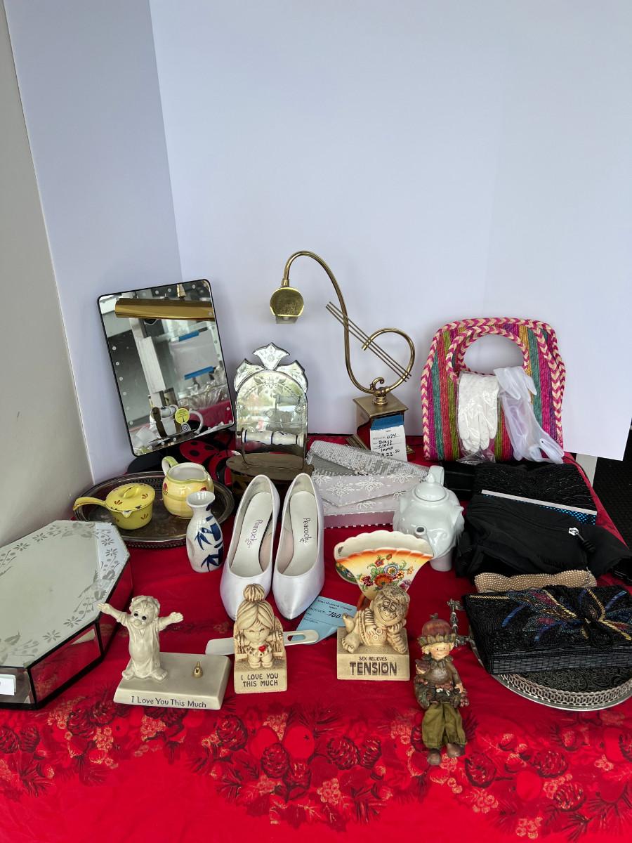 Lot of vintage collectibles good condition, evening gloves, 1950s mirrored jewelry box, white satin pumps, 1970s kitsch figurines. Vintage enamel pot, ceramic pitcher, elephant tea pot. beaded purses. This lot can be shipped but be aware heavy and breakable so will be double boxed.