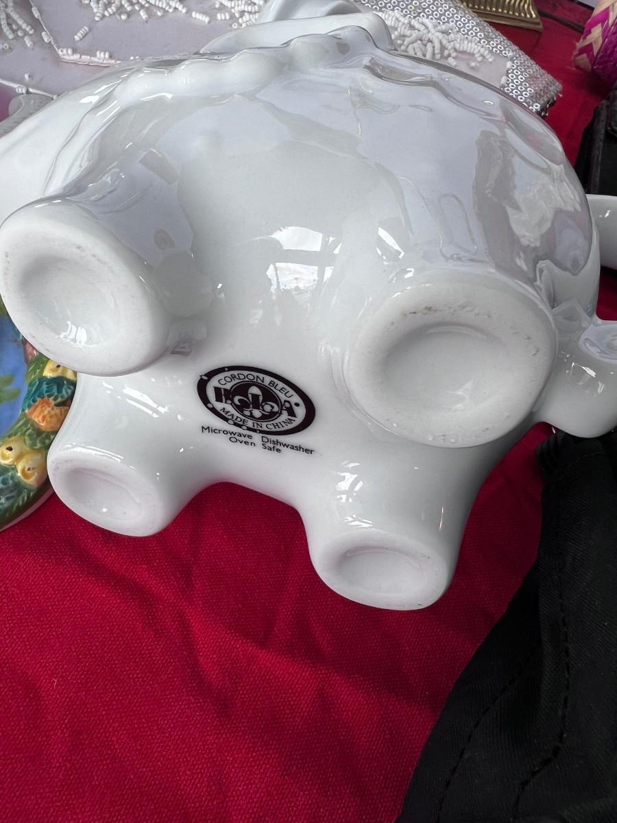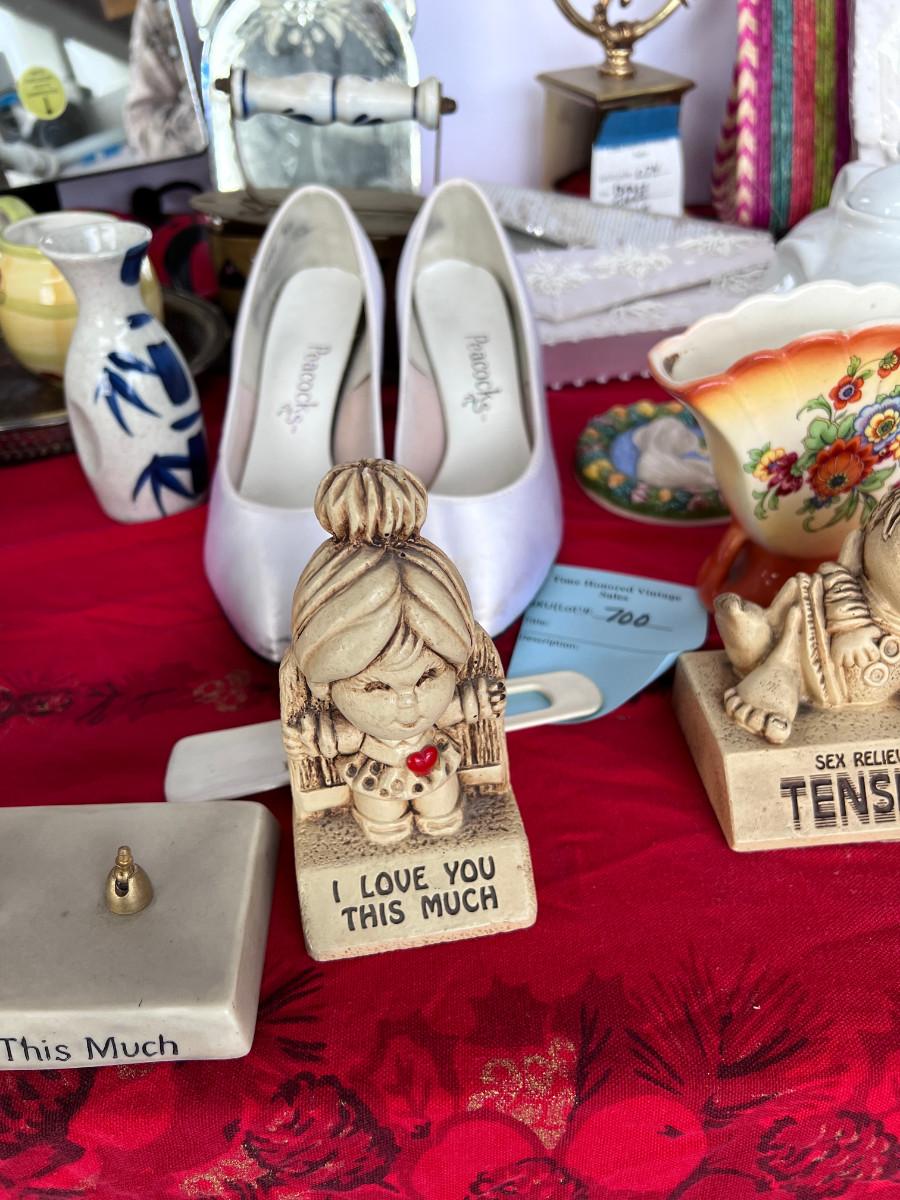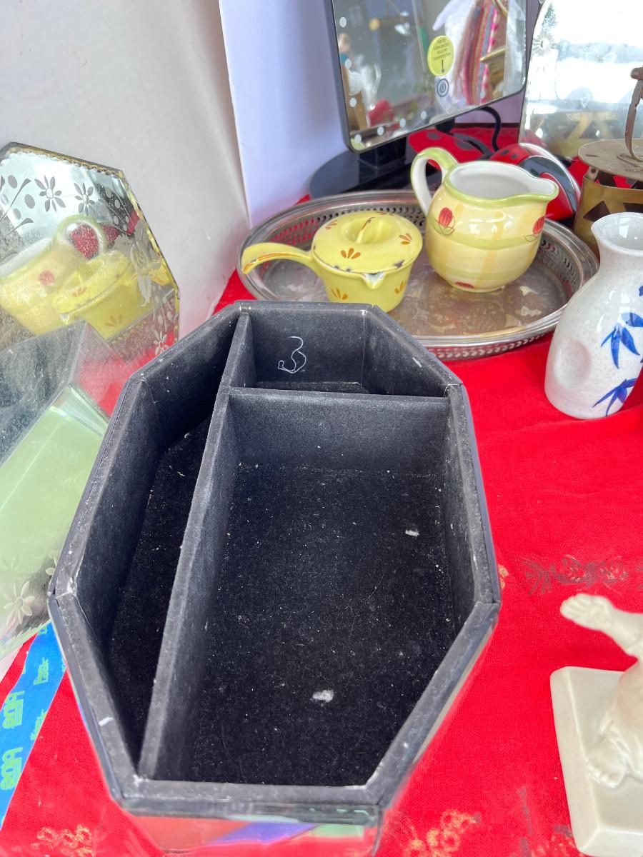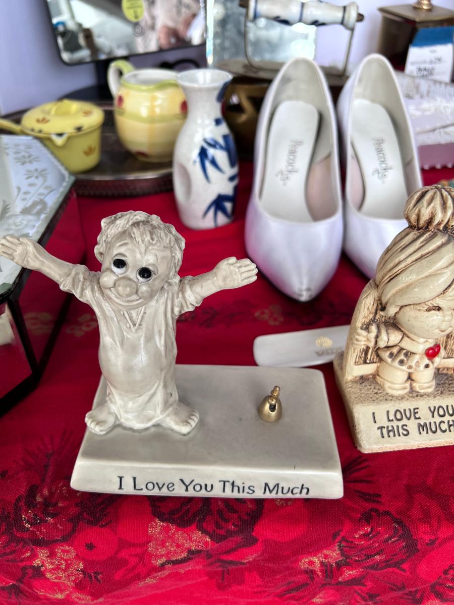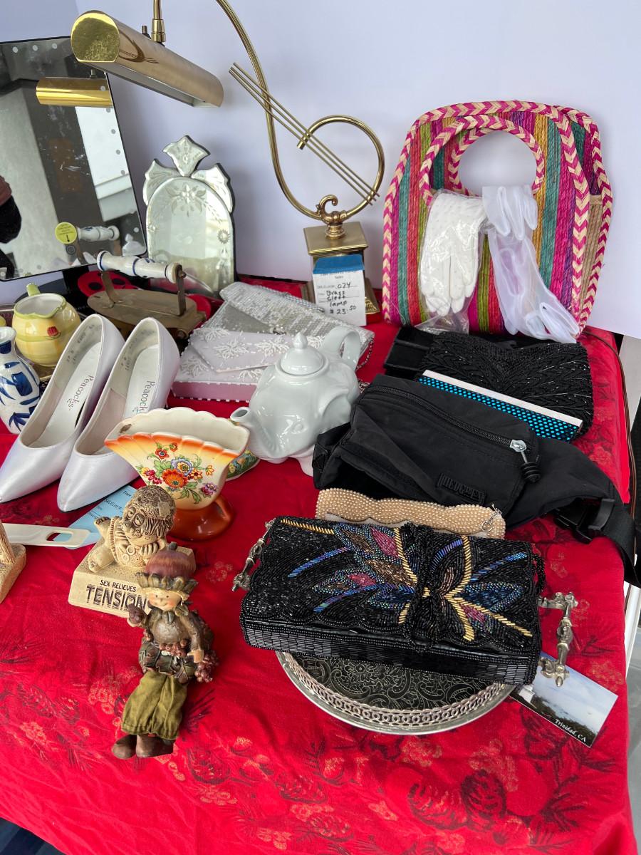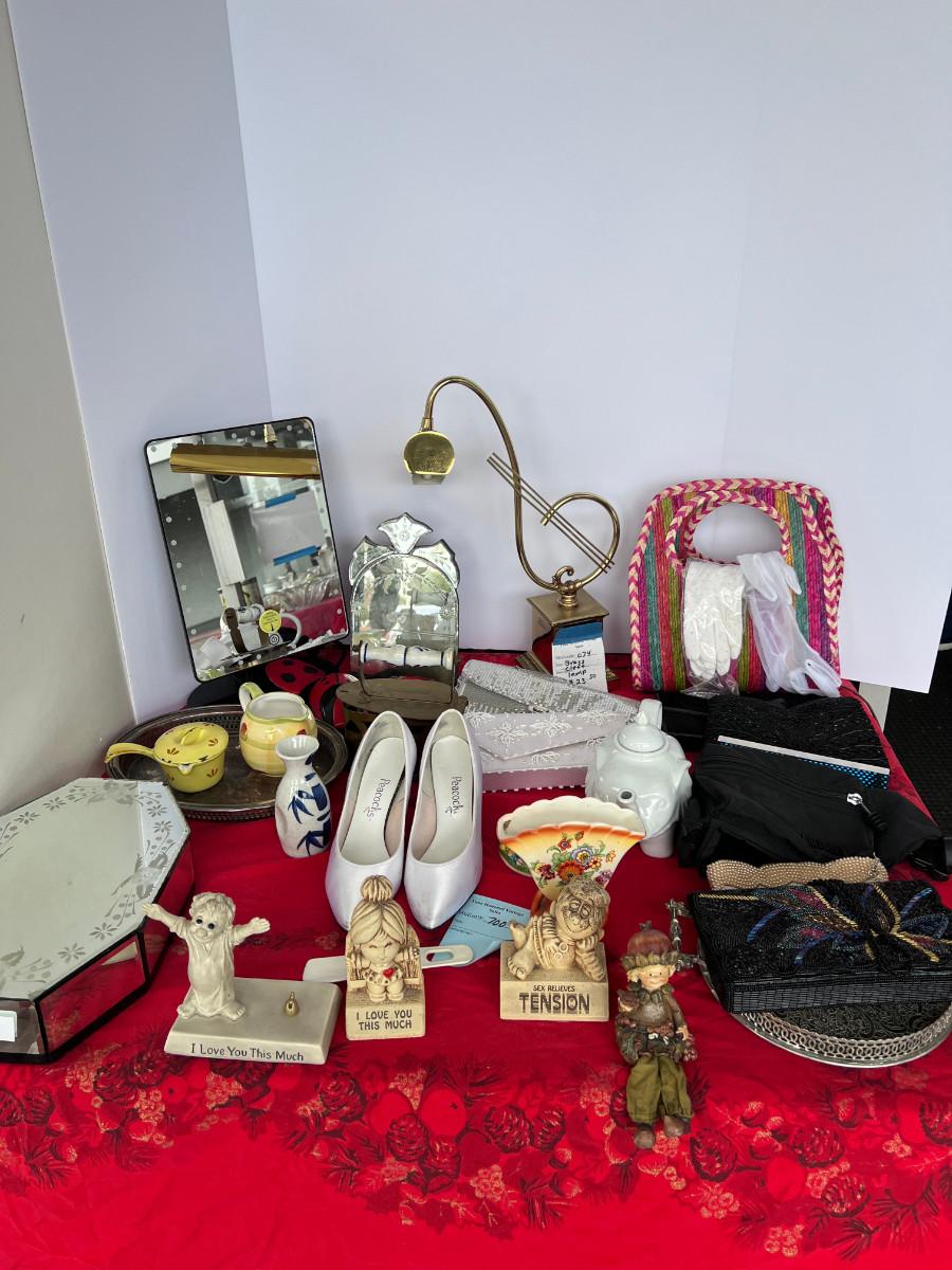 Lot of vintage collectibles good condition, evening gloves, 1950s mirrored jewelry box, white satin pumps, 1970s kitsch figurines. Vintage enamel pot, ceramic pitcher, elephant tea pot. beaded purses. This lot can be shipped but be aware heavy and breakable so will be double boxed.