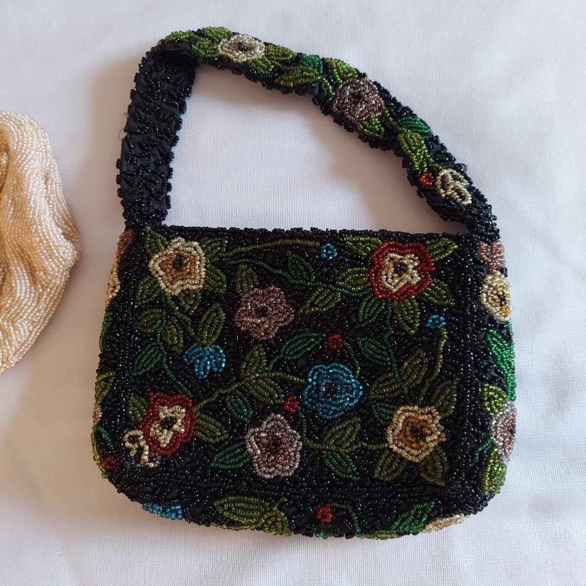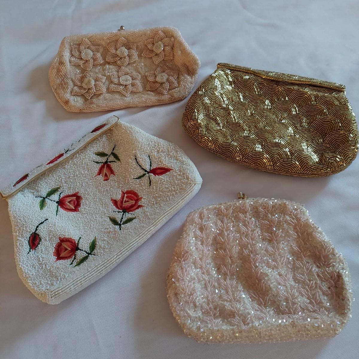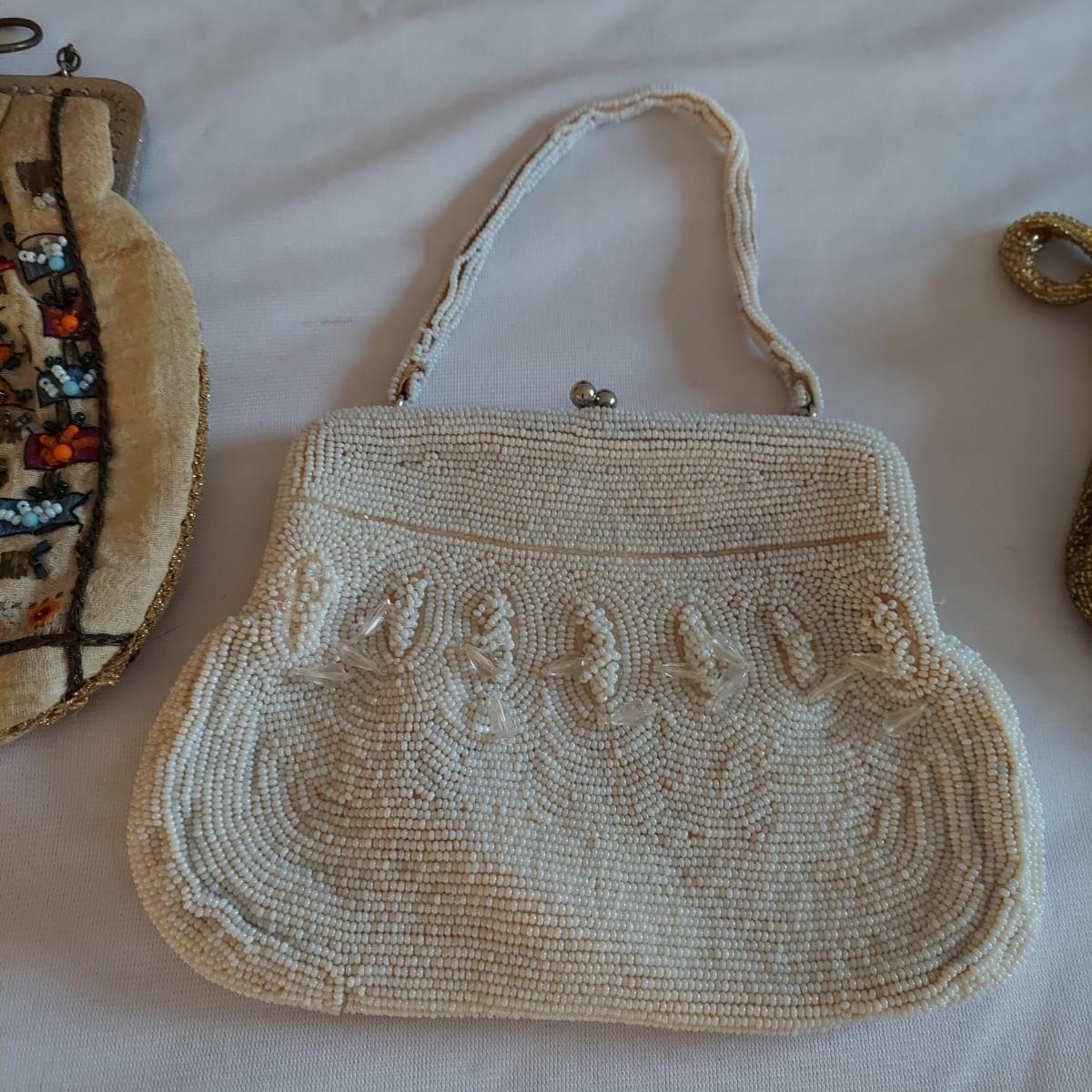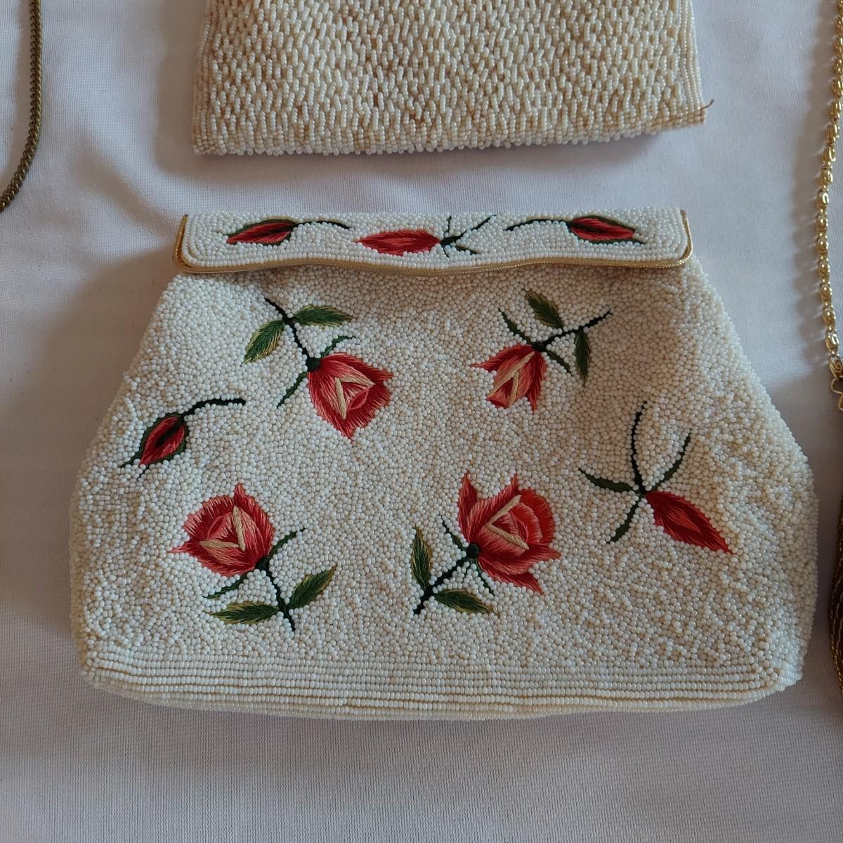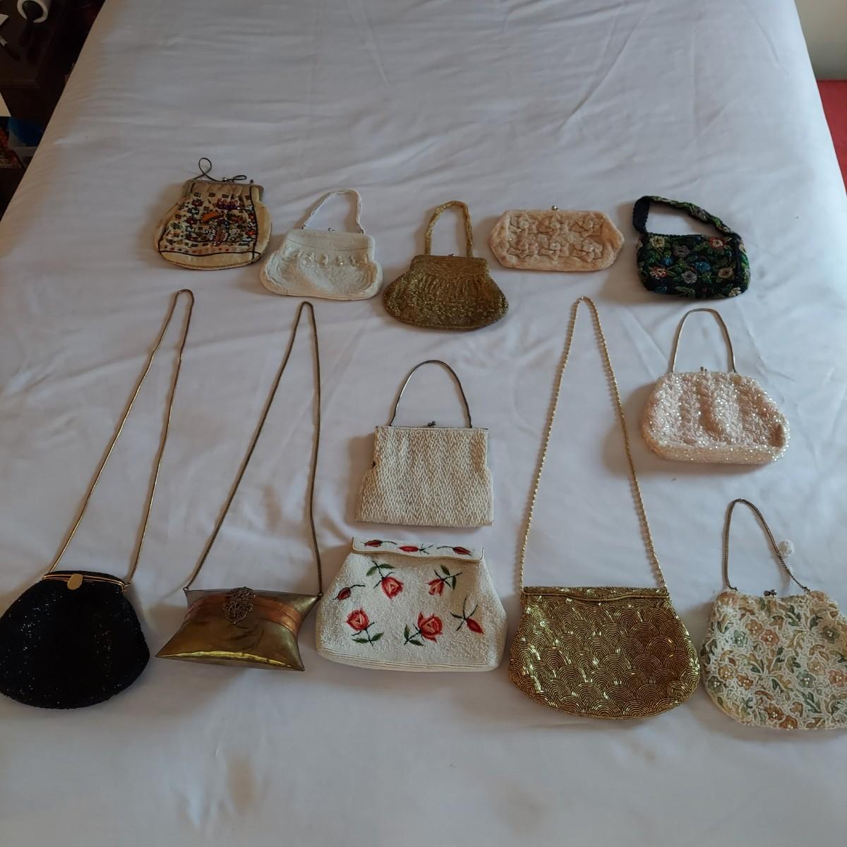 Lot includes 12 vintage beaded evening bags. The rose clutch is 10" x 7"H. Some have stains or loose beads. The rose bag has a broken handle. Please see photos. Shipping available