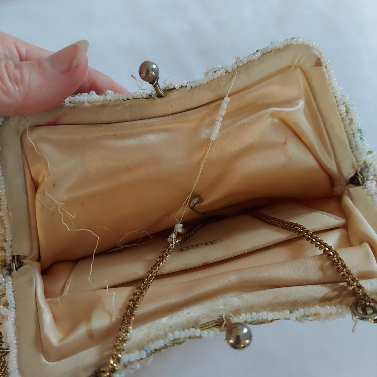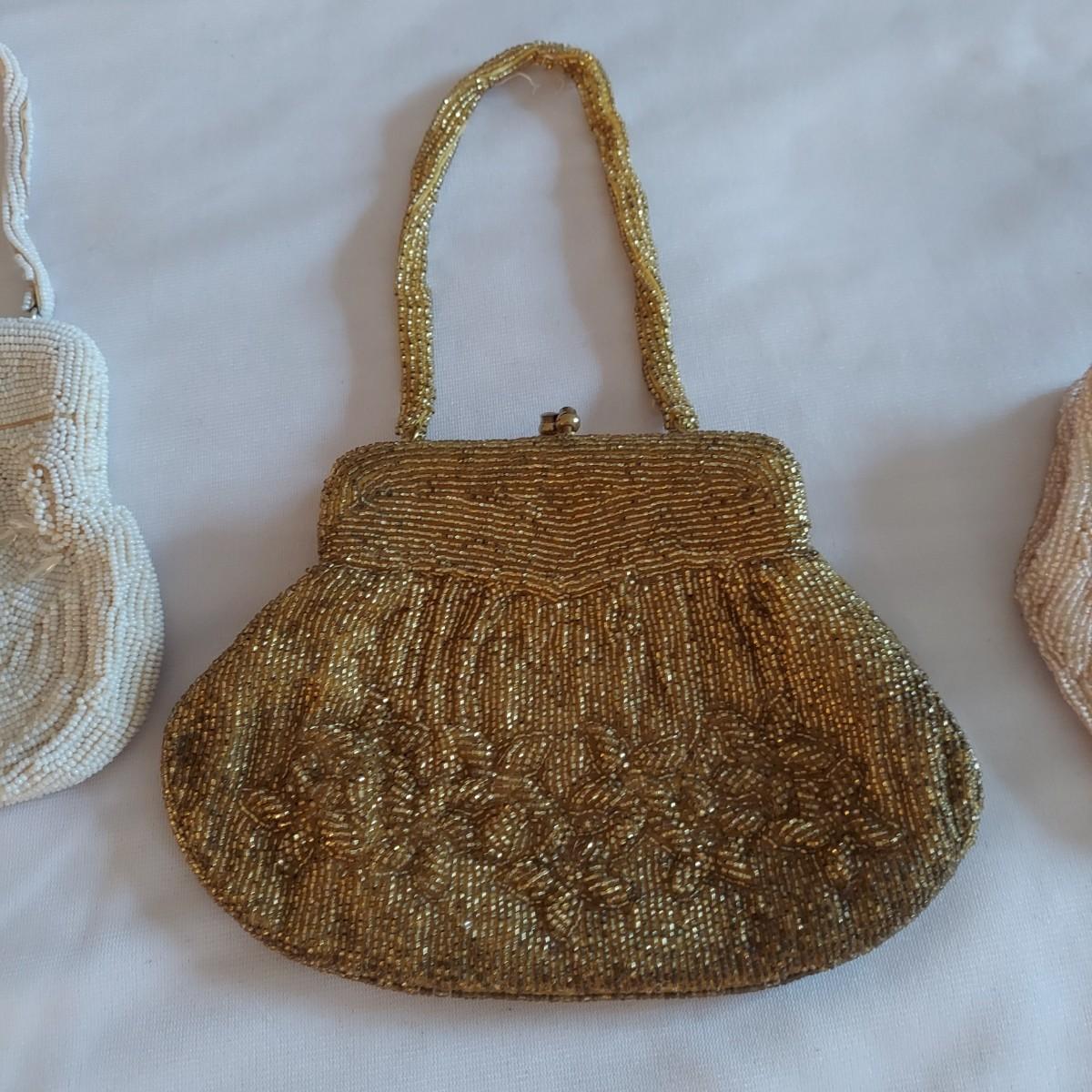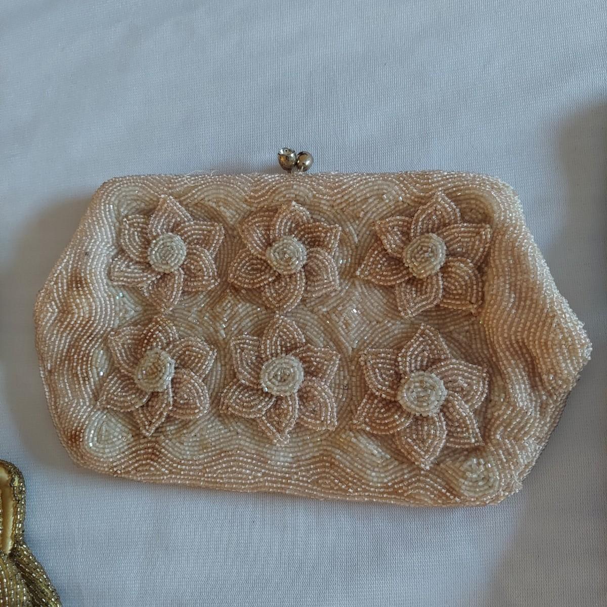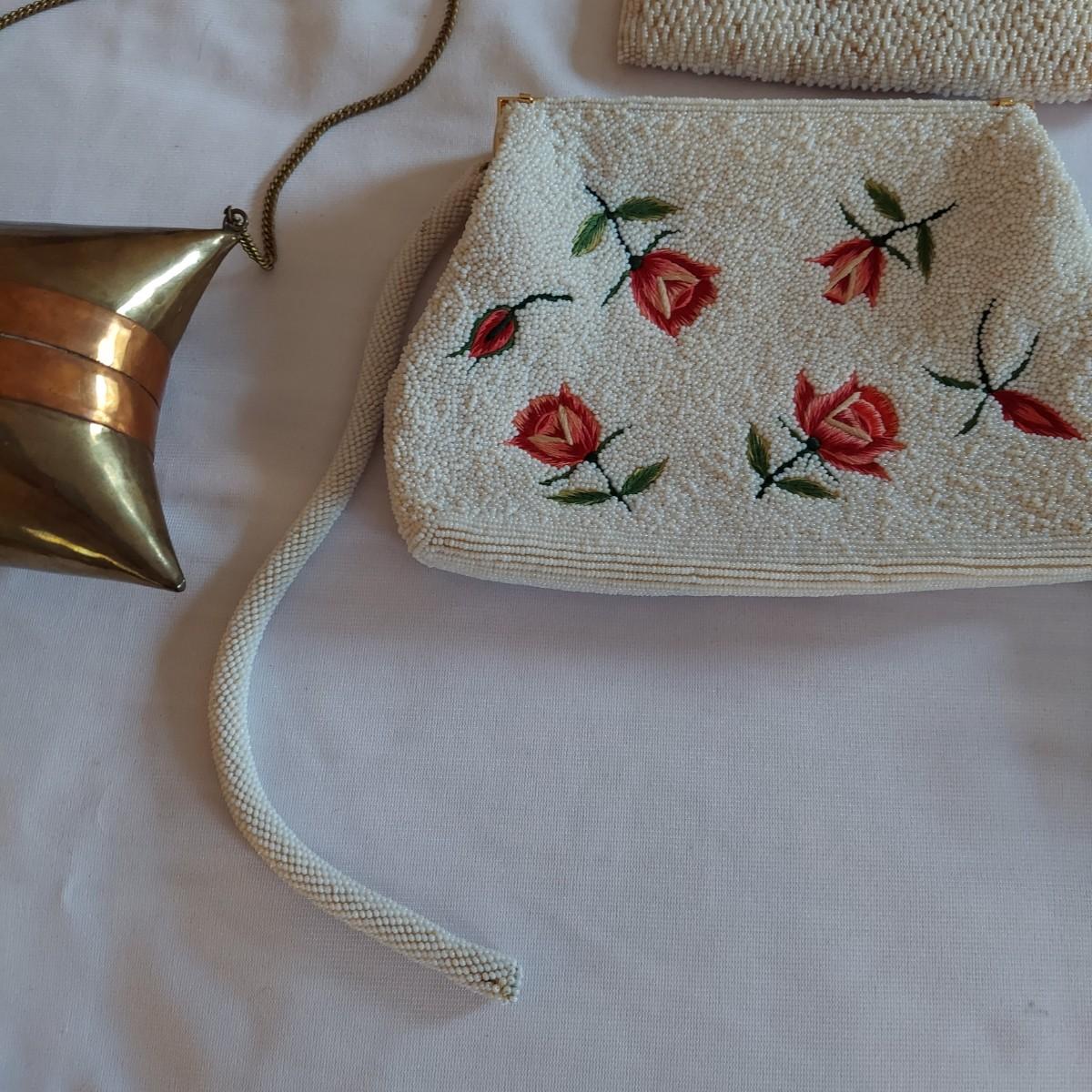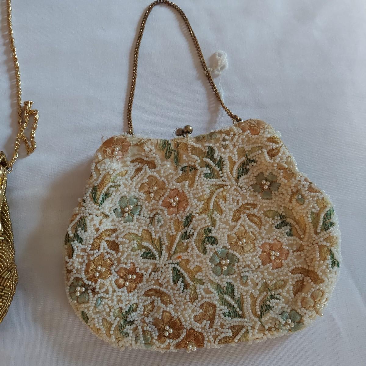 Lot includes 12 vintage beaded evening bags. The rose clutch is 10" x 7"H. Some have stains or loose beads. The rose bag has a broken handle. Please see photos. Shipping available