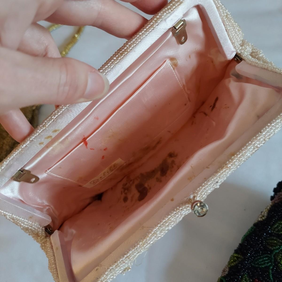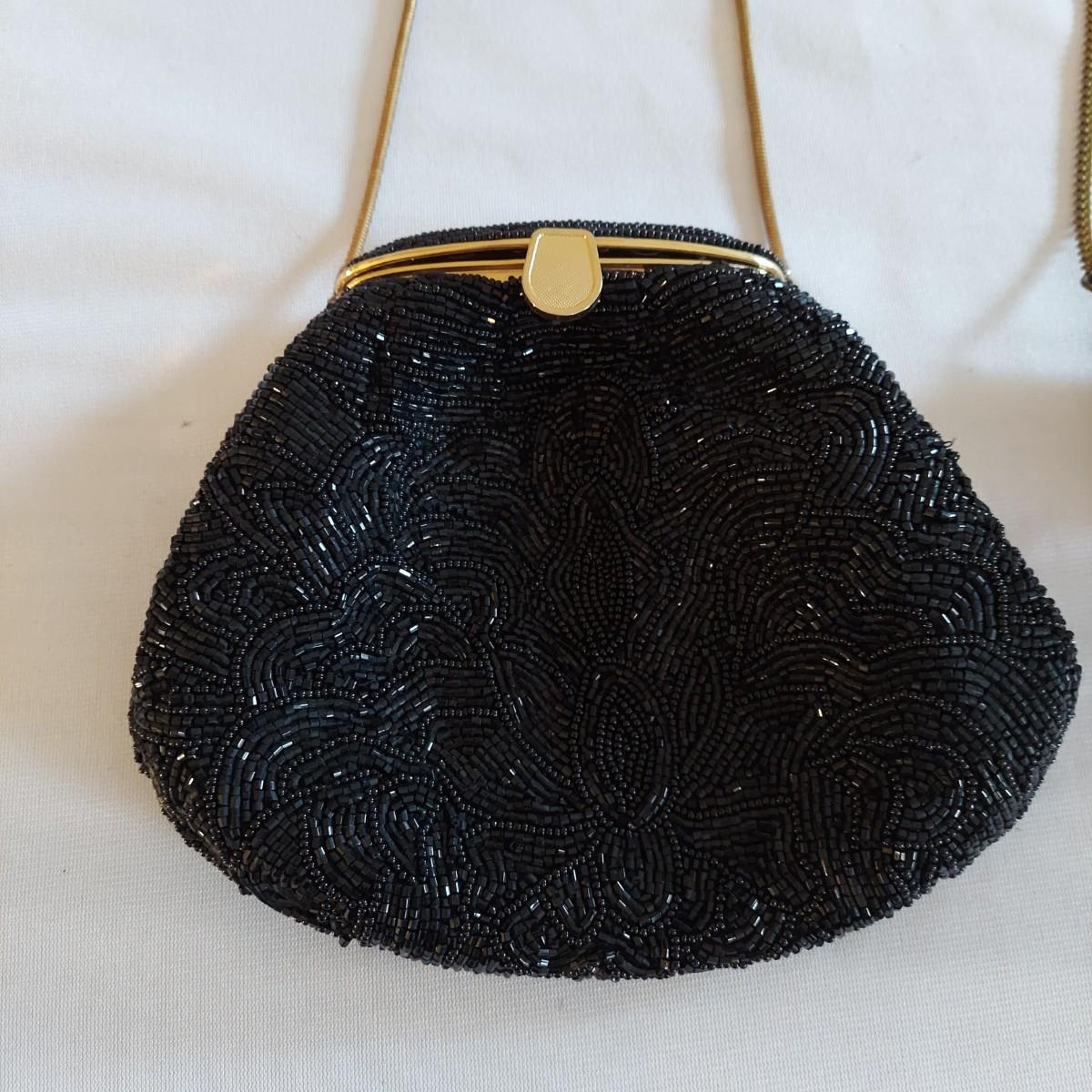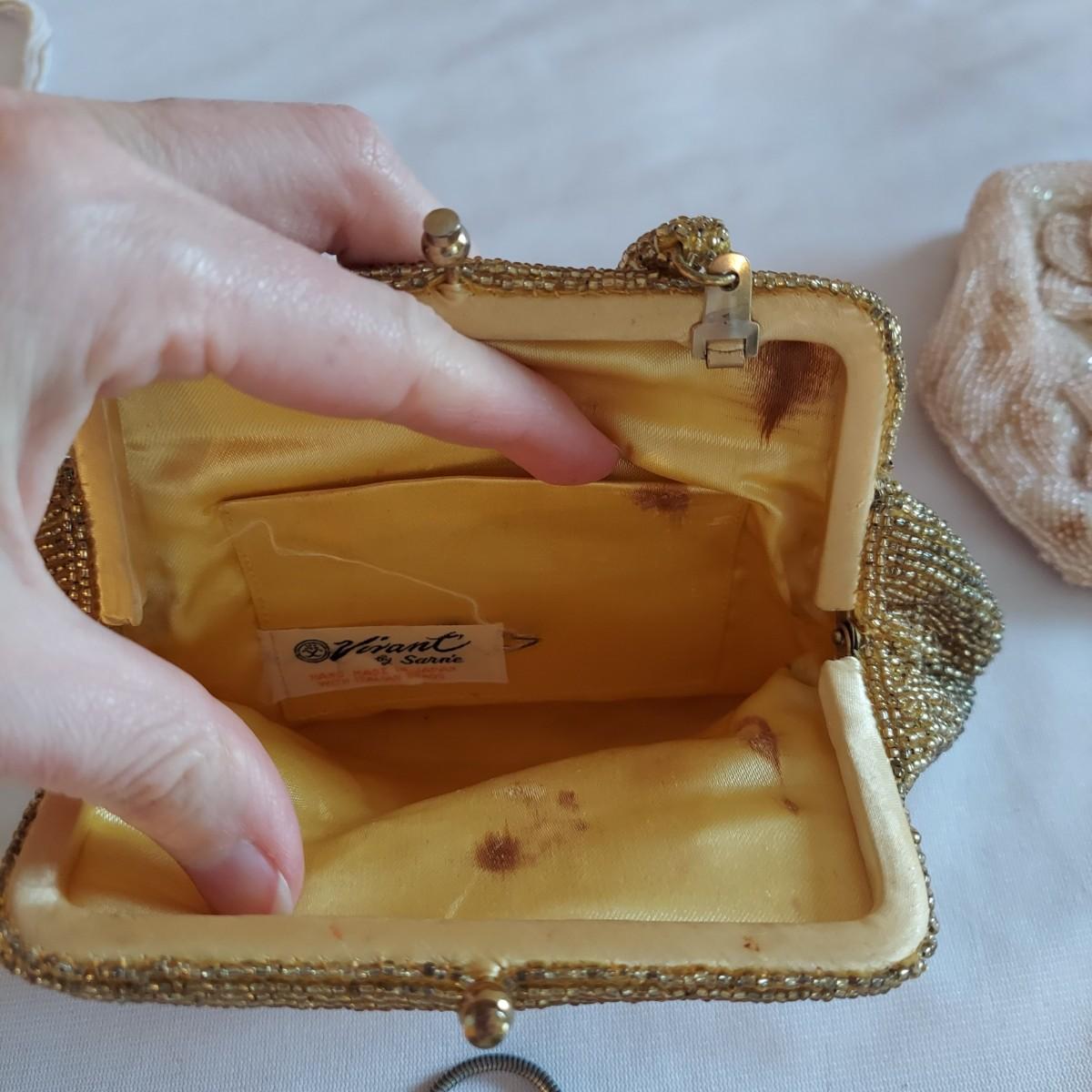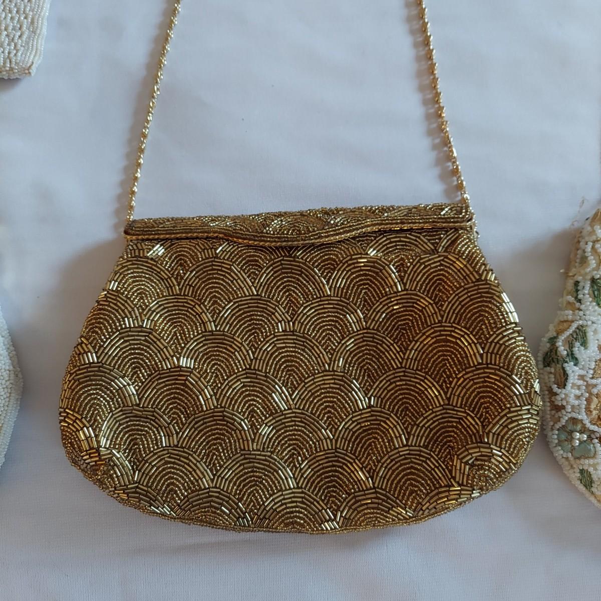 Lot includes 12 vintage beaded evening bags. The rose clutch is 10" x 7"H. Some have stains or loose beads. The rose bag has a broken handle. Please see photos. Shipping available