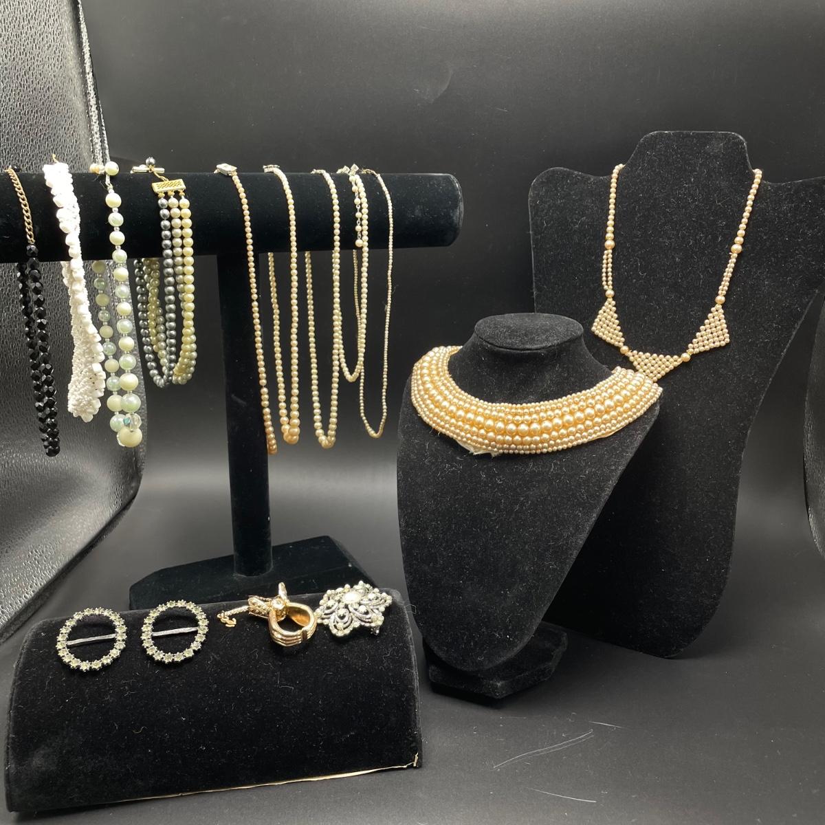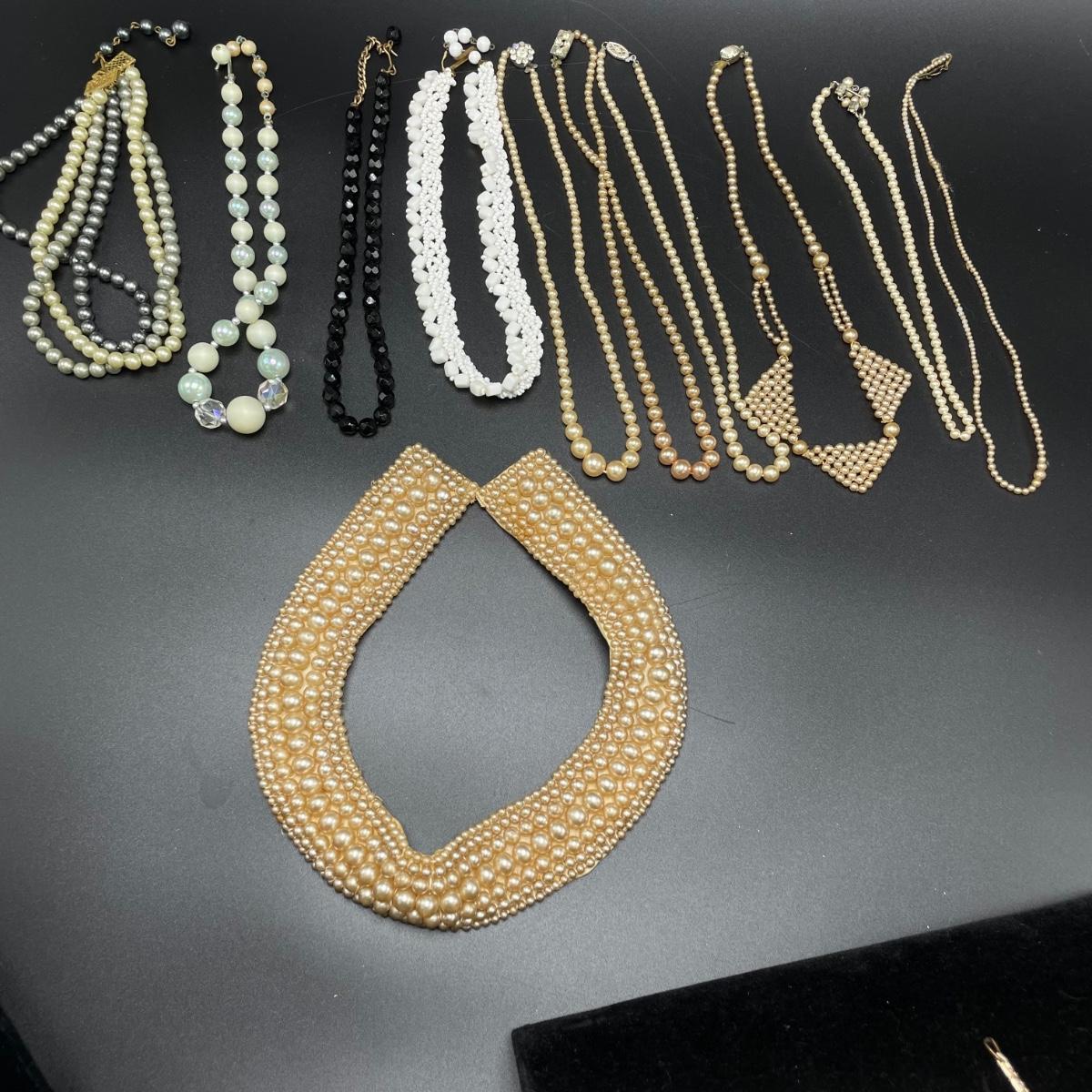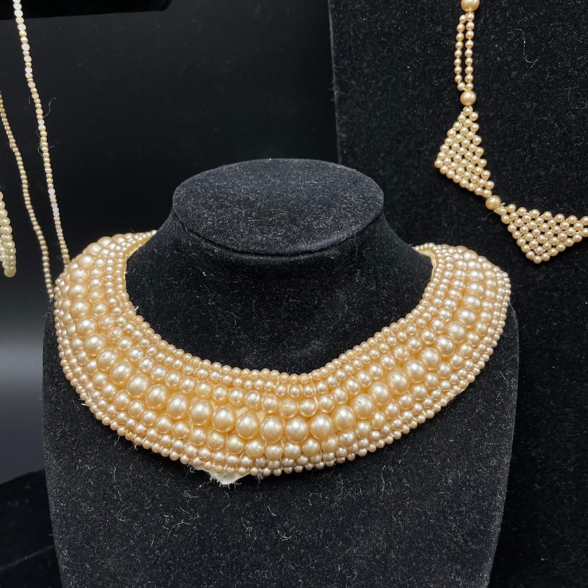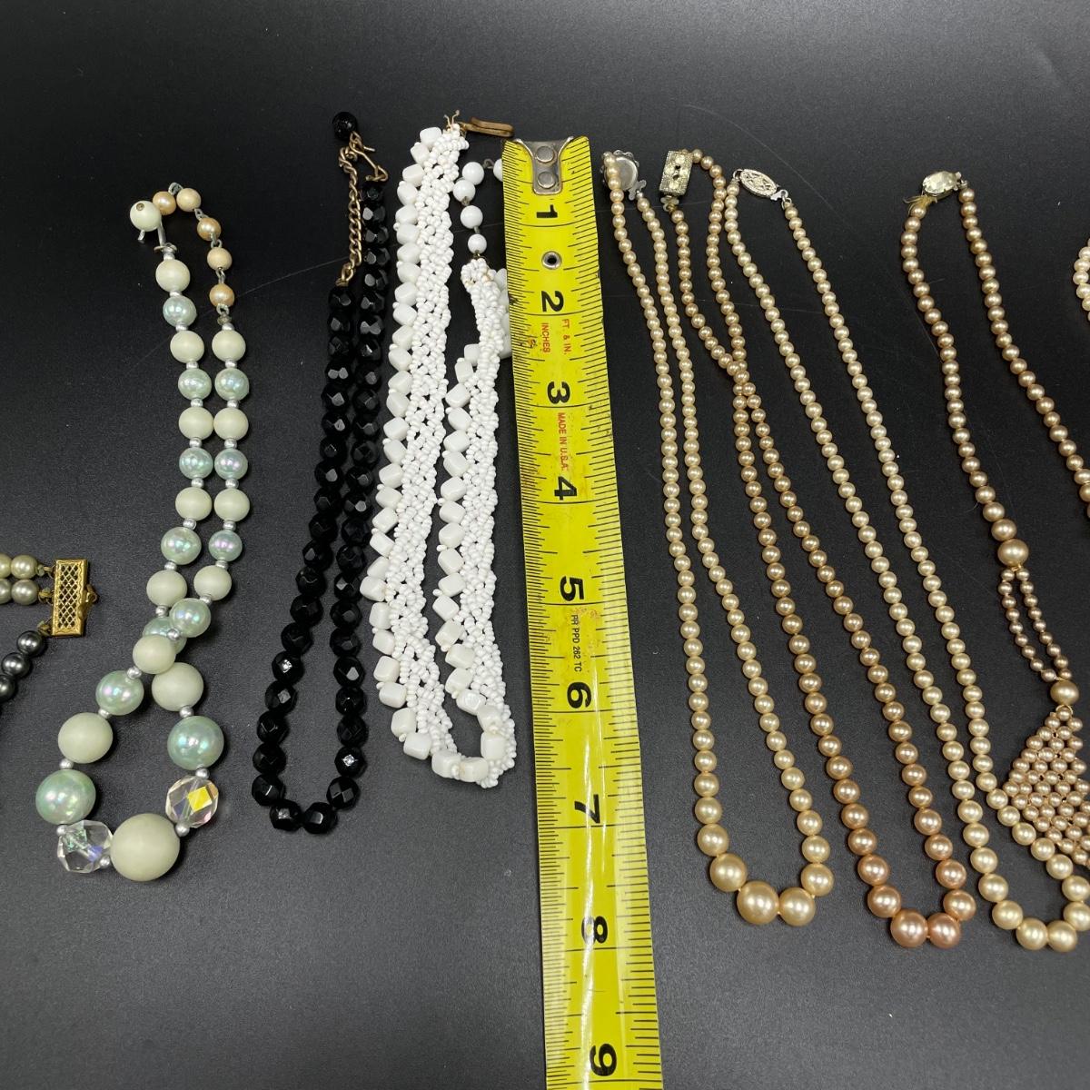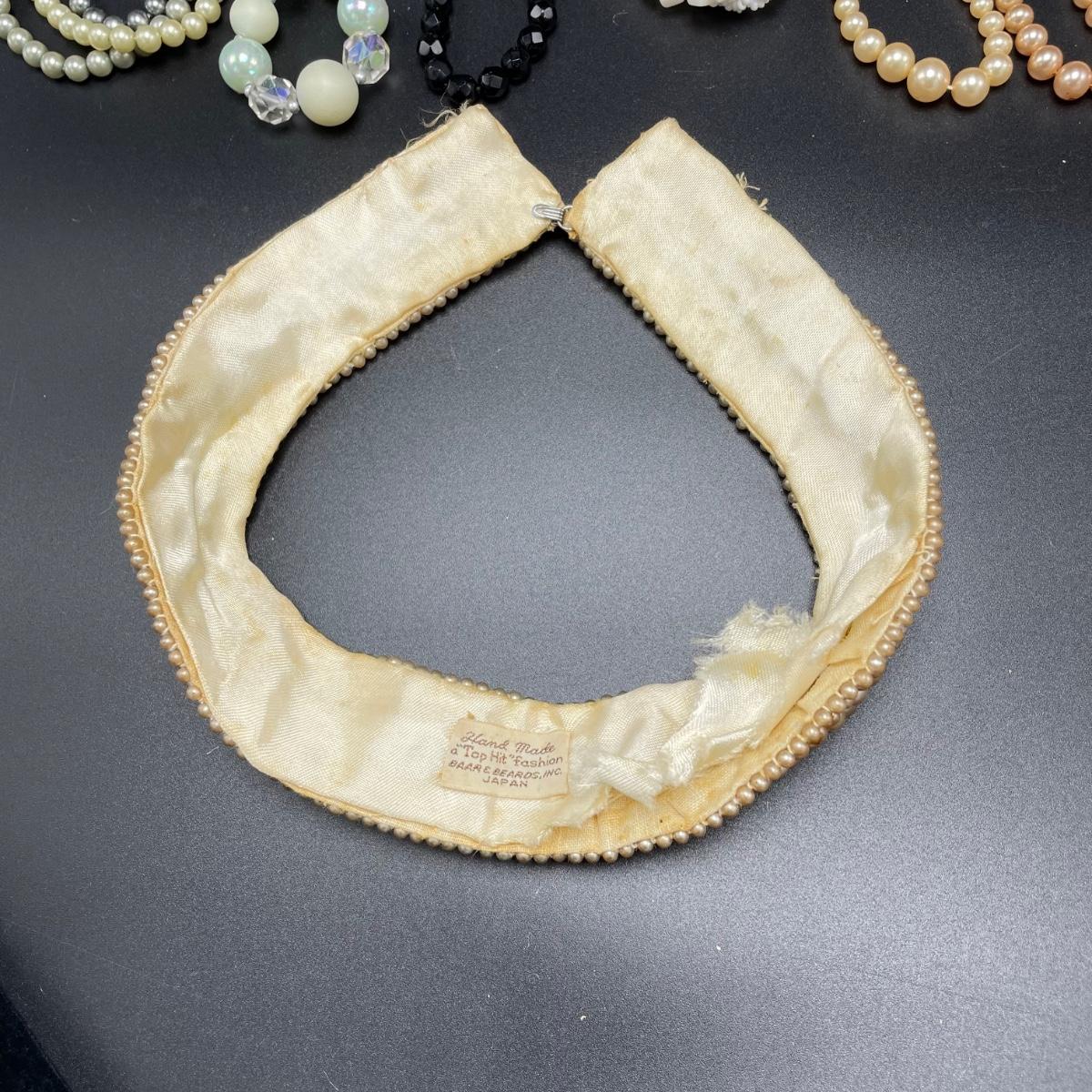 Ten vintage beaded and pearl choker necklaces, with a pearled collar by Baar and Beards, Inc., a brooch, a set of matching scarf ring clips, and a hand-shaped clip. The chokers vary between 12” and 15”, the 12” would fit a petite neck. See images. Shipping available.