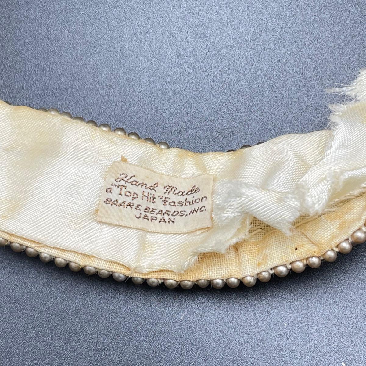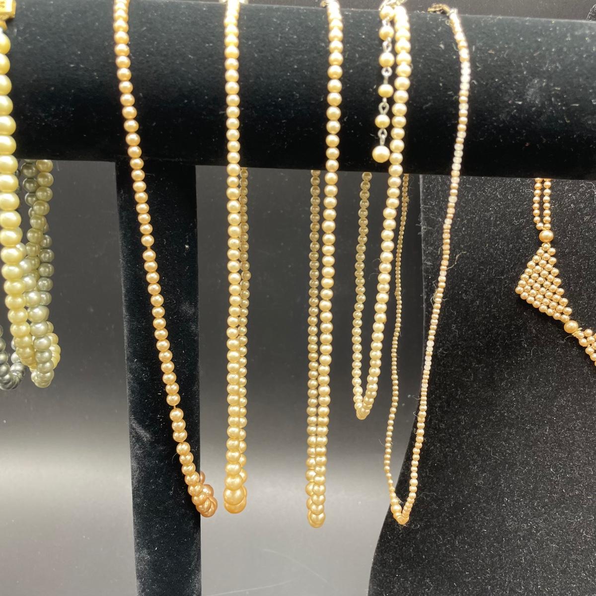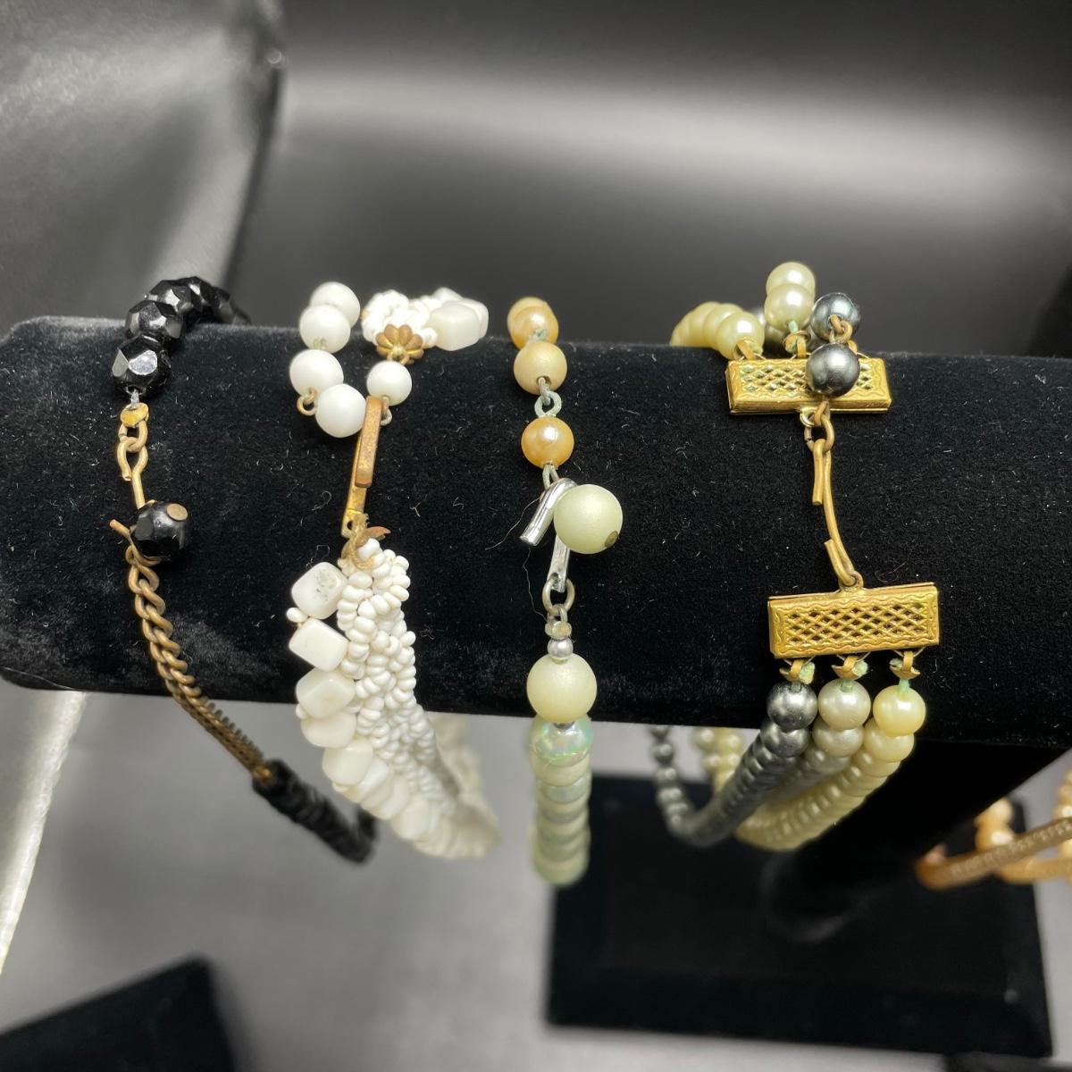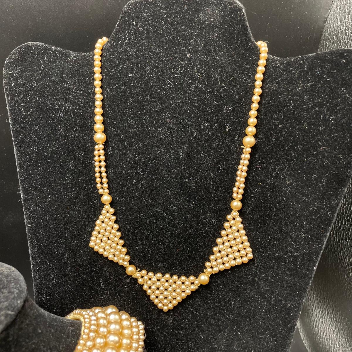Ten vintage beaded and pearl choker necklaces, with a pearled collar by Baar and Beards, Inc., a brooch, a set of matching scarf ring clips, and a hand-shaped clip. The chokers vary between 12” and 15”, the 12” would fit a petite neck. See images. Shipping available.