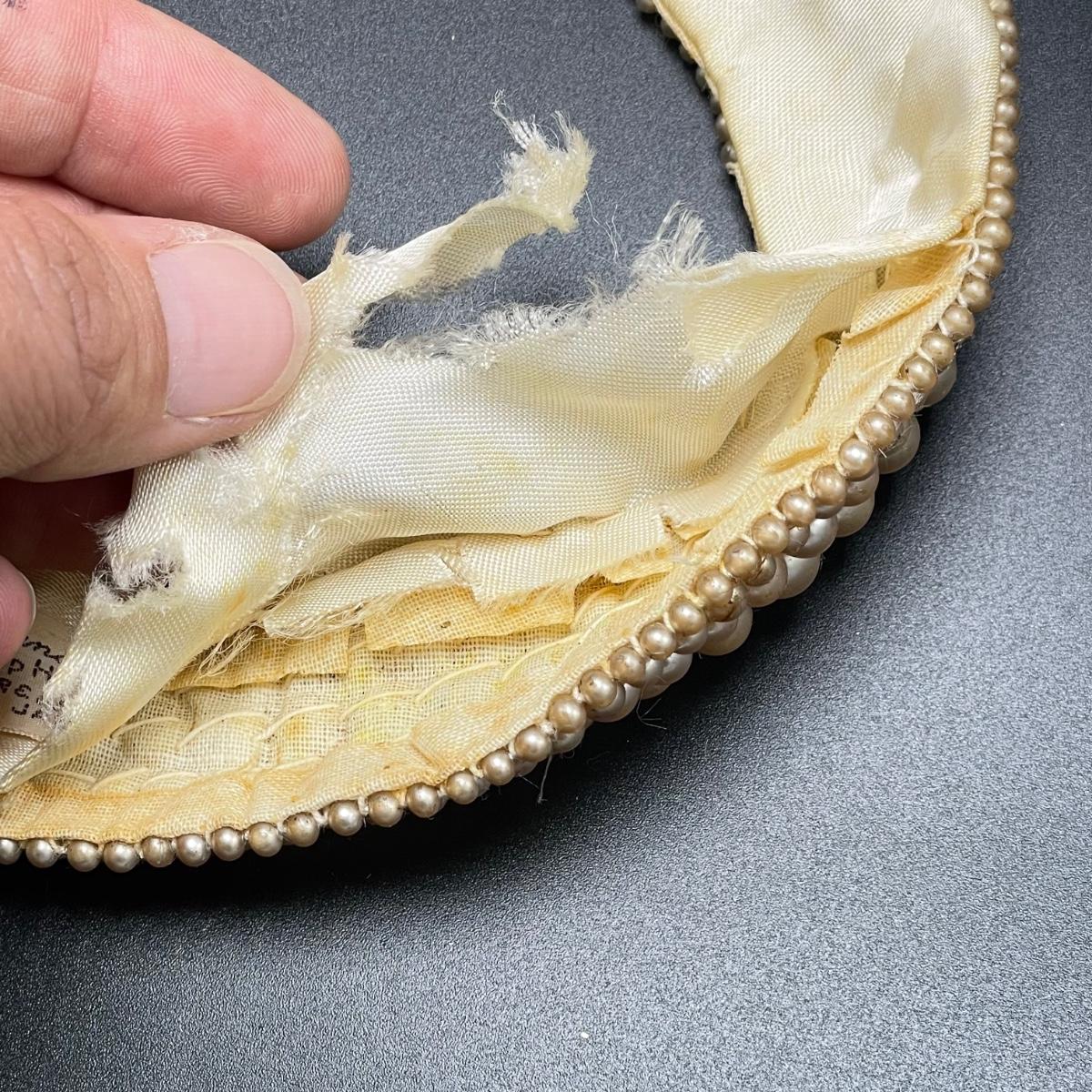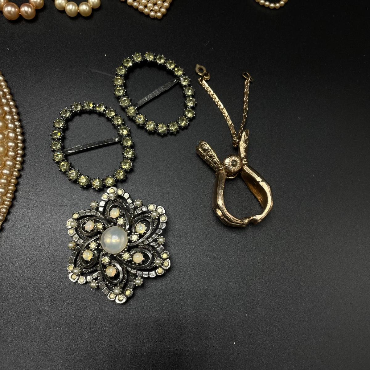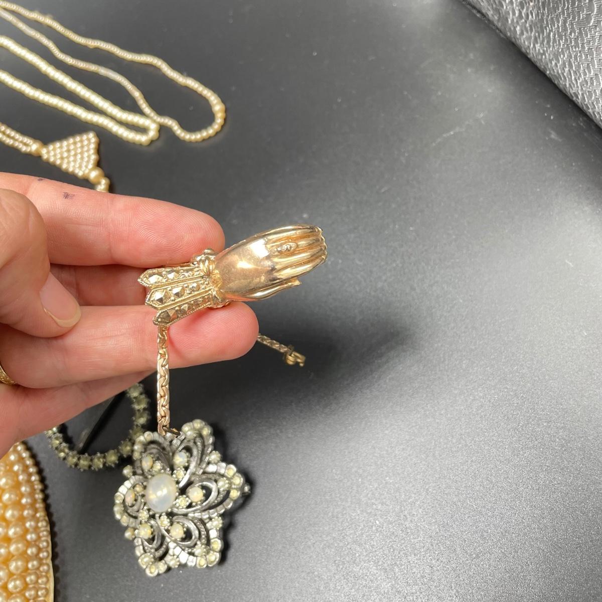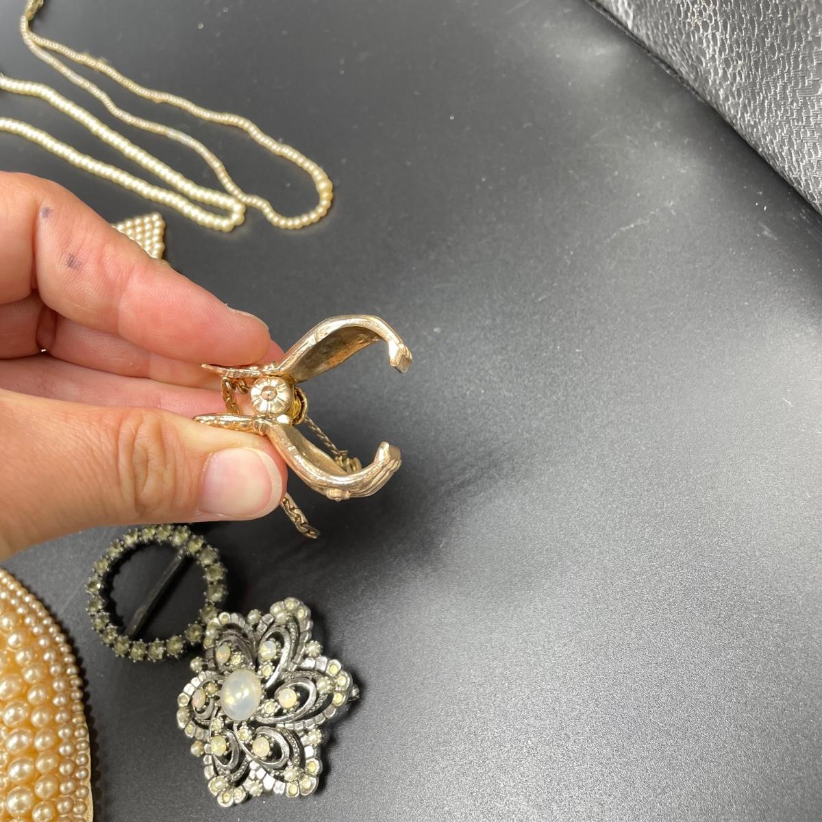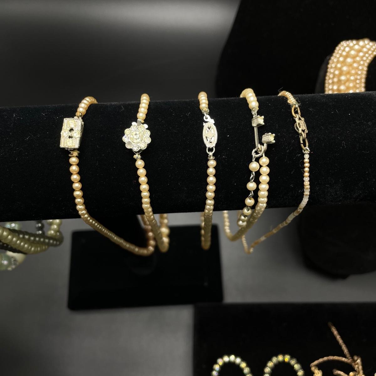 Ten vintage beaded and pearl choker necklaces, with a pearled collar by Baar and Beards, Inc., a brooch, a set of matching scarf ring clips, and a hand-shaped clip. The chokers vary between 12” and 15”, the 12” would fit a petite neck. See images. Shipping available.