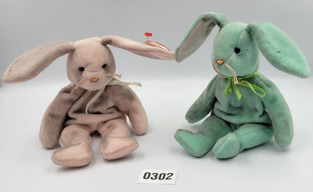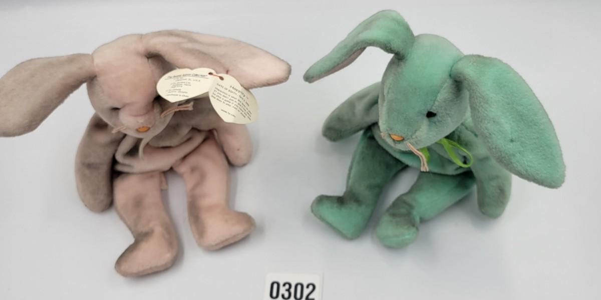 The green colored bunny is missing its Ty tag. Hoppity's tag is intact