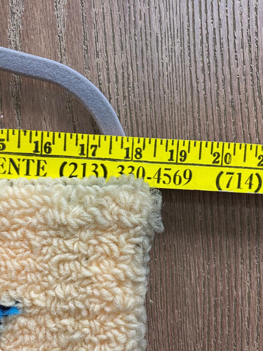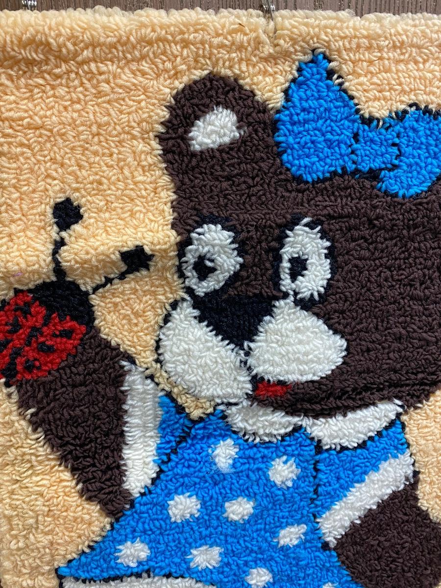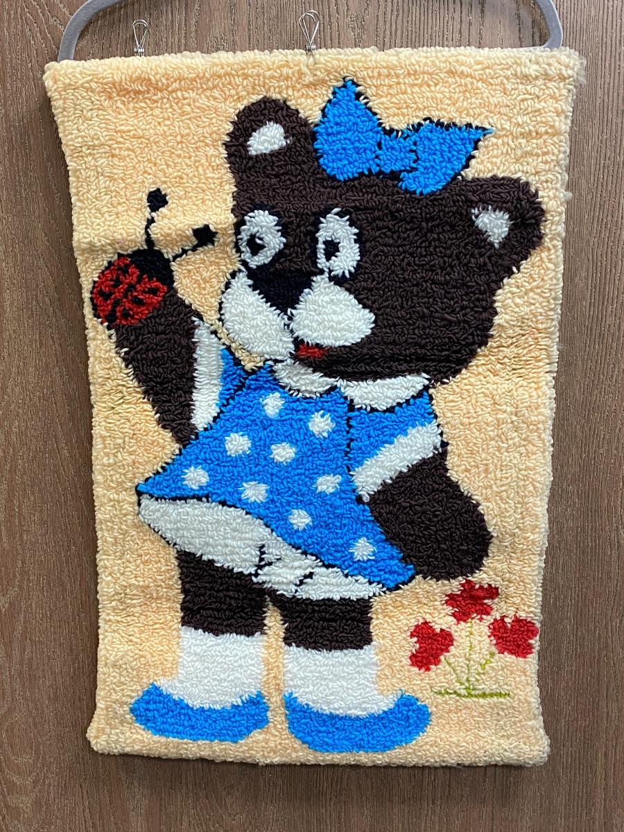 Vintage plush rug wall art. Features a teddy bear in blue polka dot dress holding a ladybug. Some discolor along the edge. Roughly 18"x27" size.