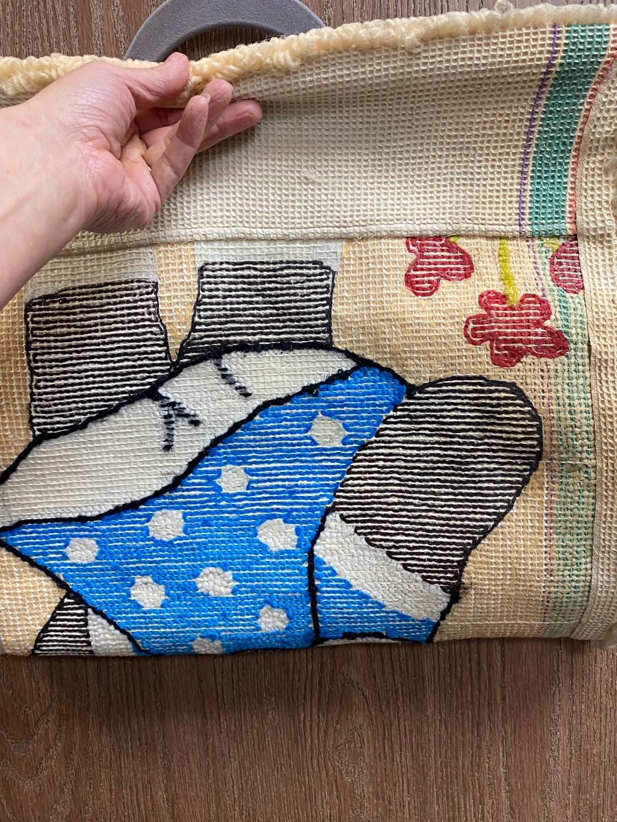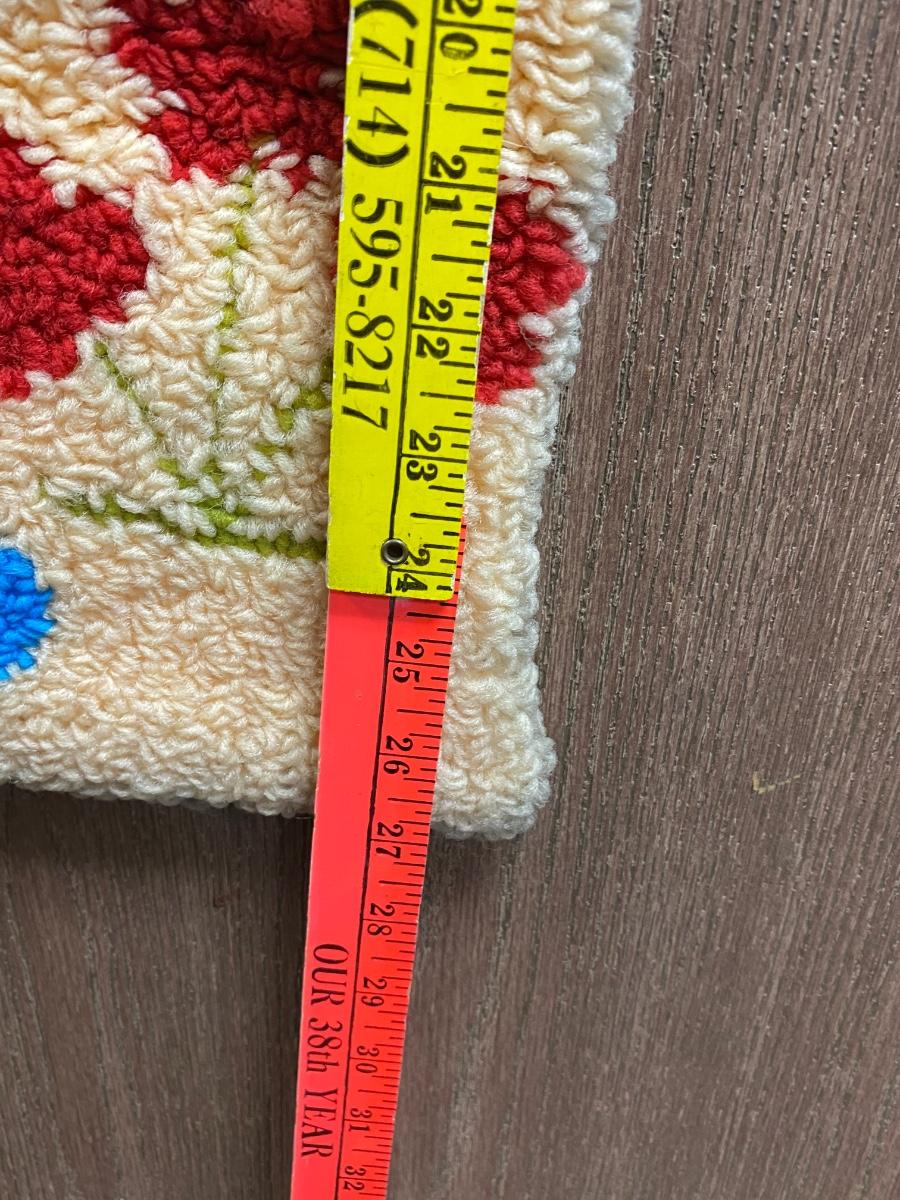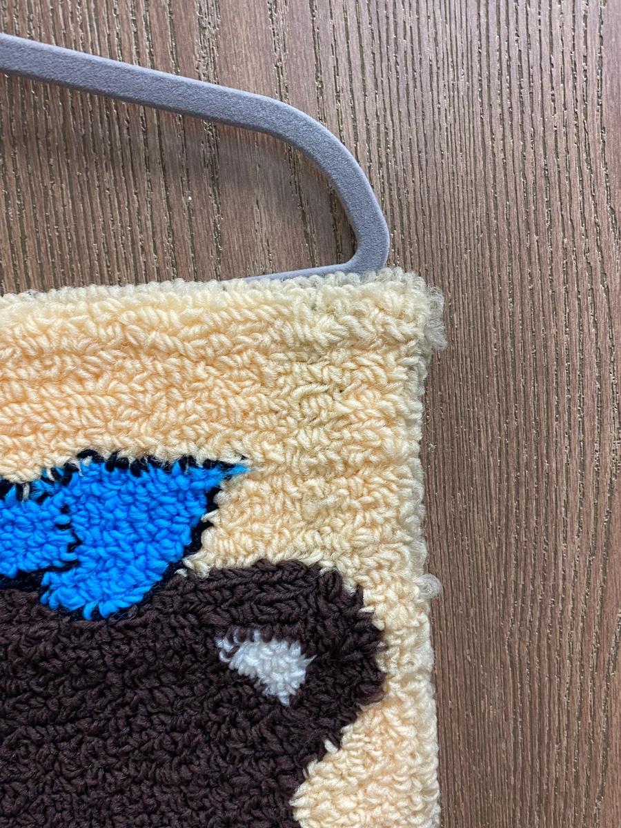 Vintage plush rug wall art. Features a teddy bear in blue polka dot dress holding a ladybug. Some discolor along the edge. Roughly 18"x27" size.