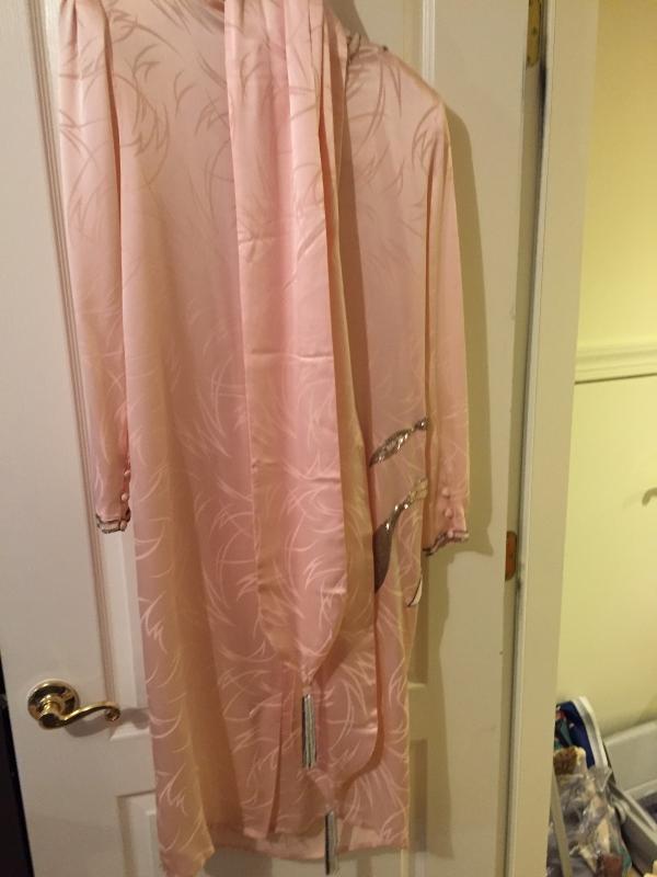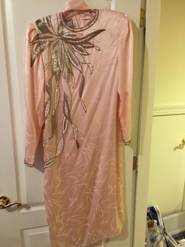 Lovely pink satin damask shift dress with heavy silver and white iridescent sequin and bead design. Inludes matching sash with beaded tassels. No size