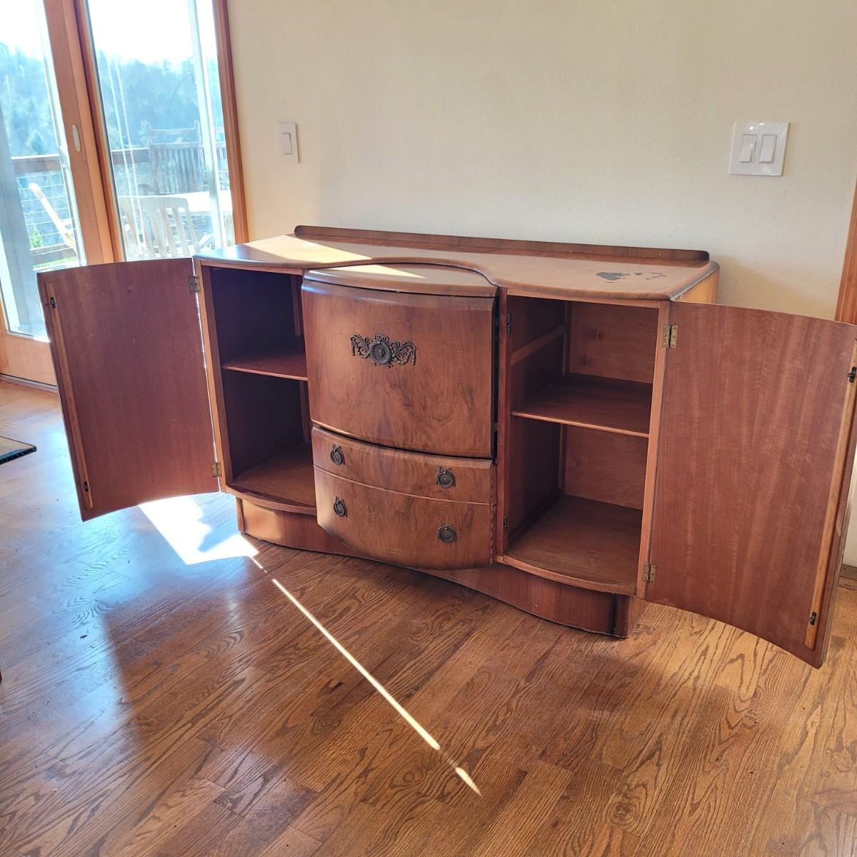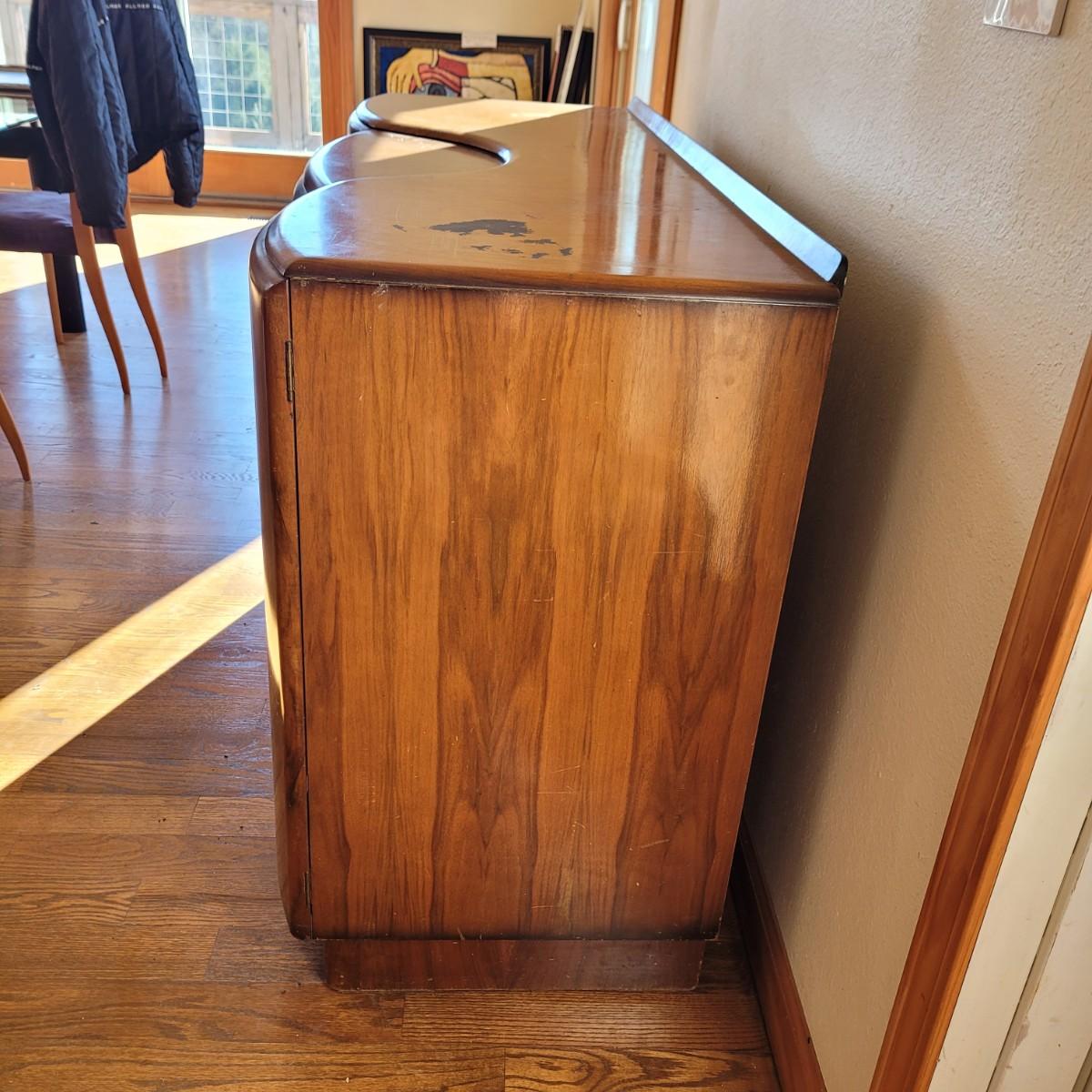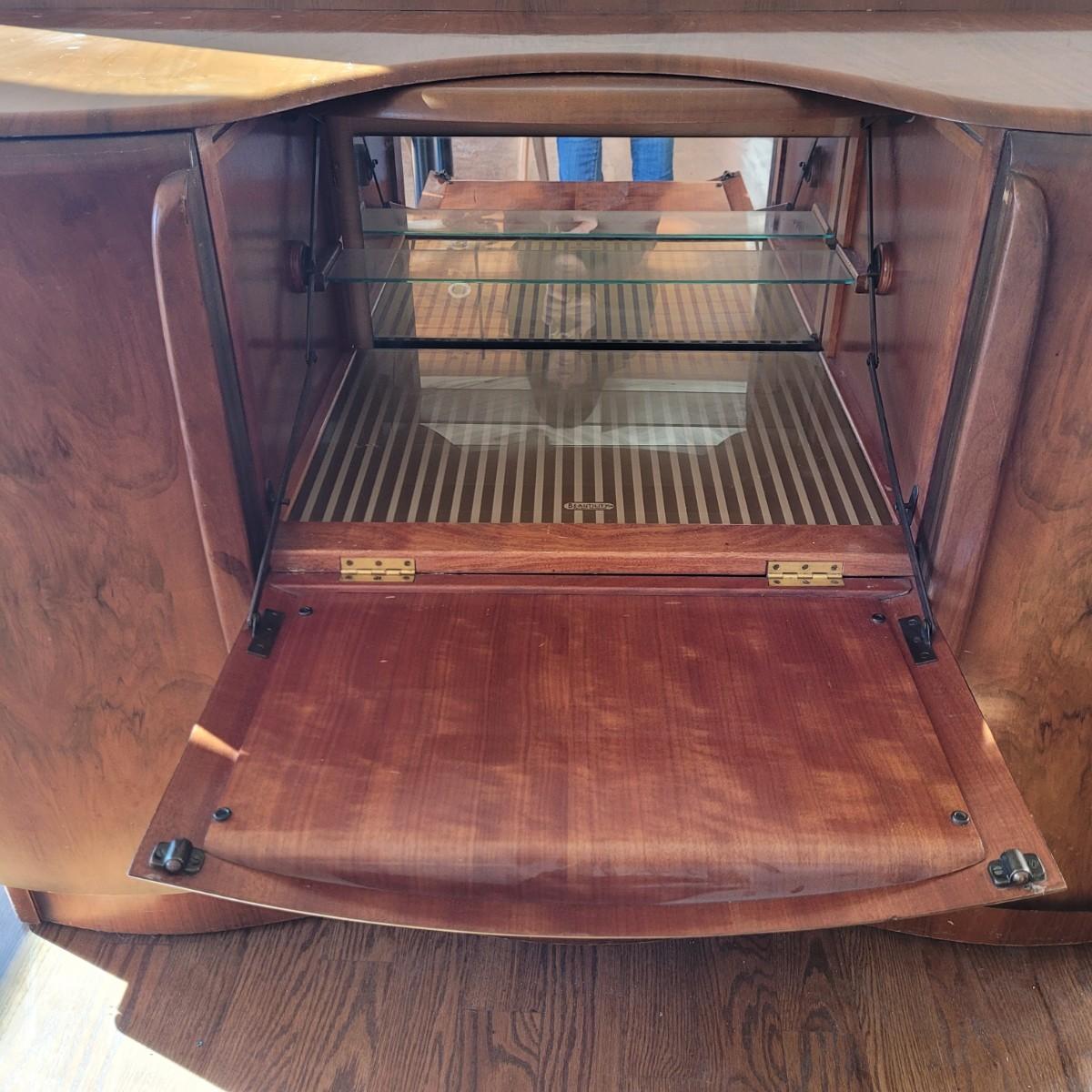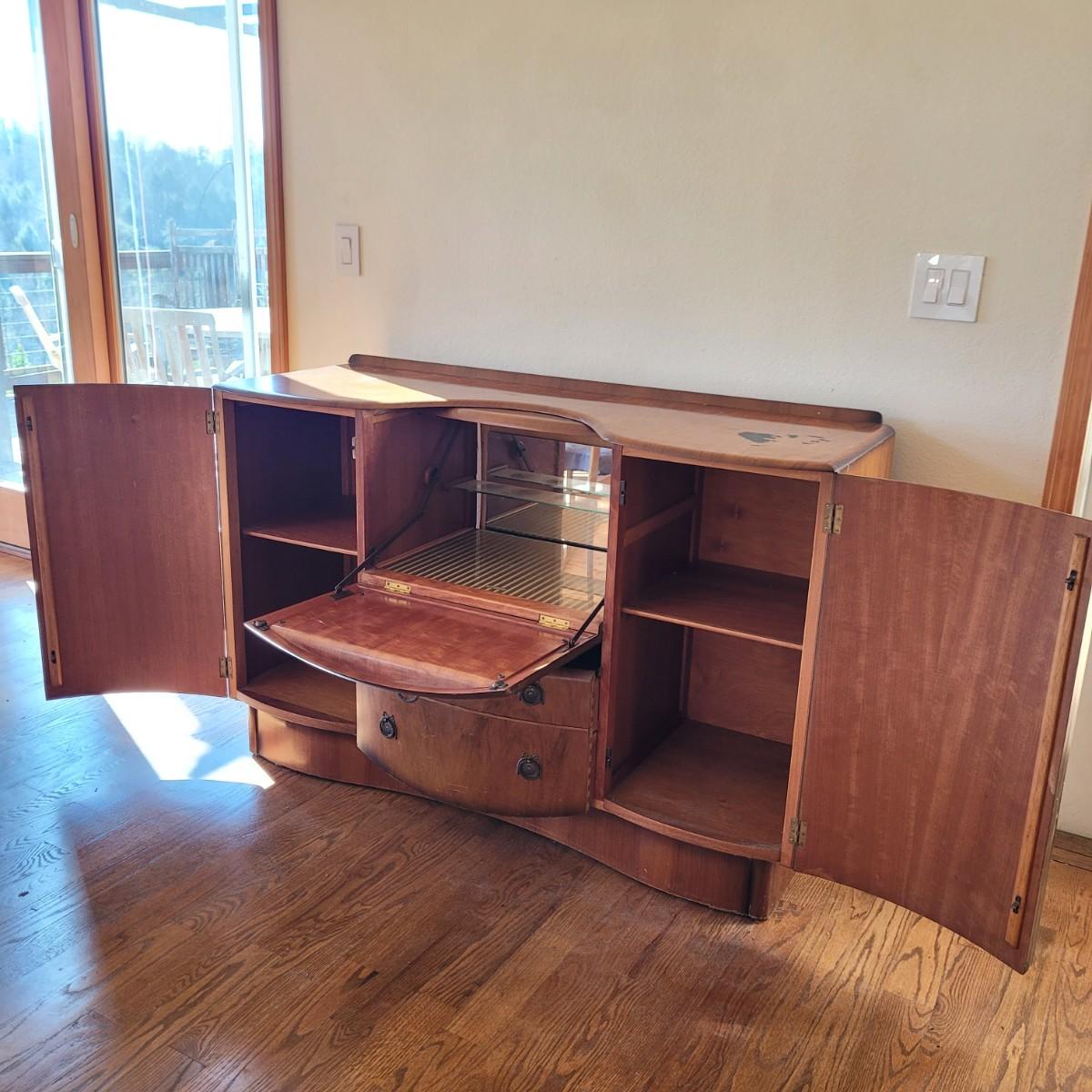A vintage cocktail cabinet in good condition but does have some scratches and blemishes. This cocktail cabinet is manufactured by Beautility and is constructed of what appears to be burl walnut. It features a pull down tray that opens a top piece for the cocktail cabinet. It has two large side cabinets and two dovetailed drawers. The hardware is ornate brass pieces and measures approximately 54" x 21" x 36". Local pickup only. Winning bidder must bring assistance to help move and load this item due to its weight and/or size