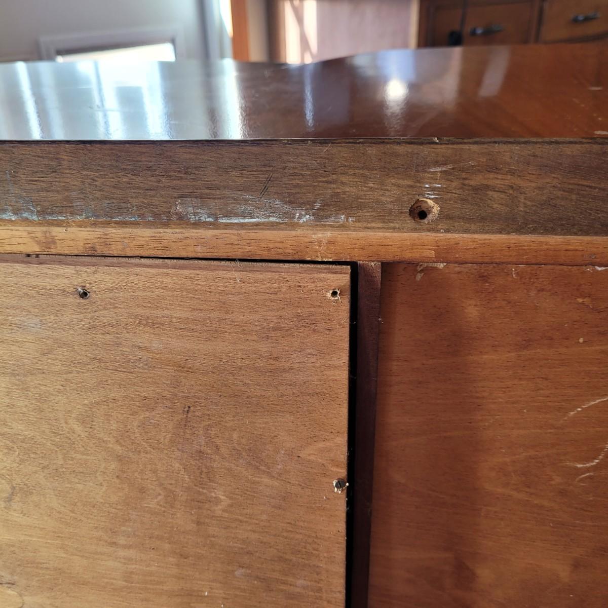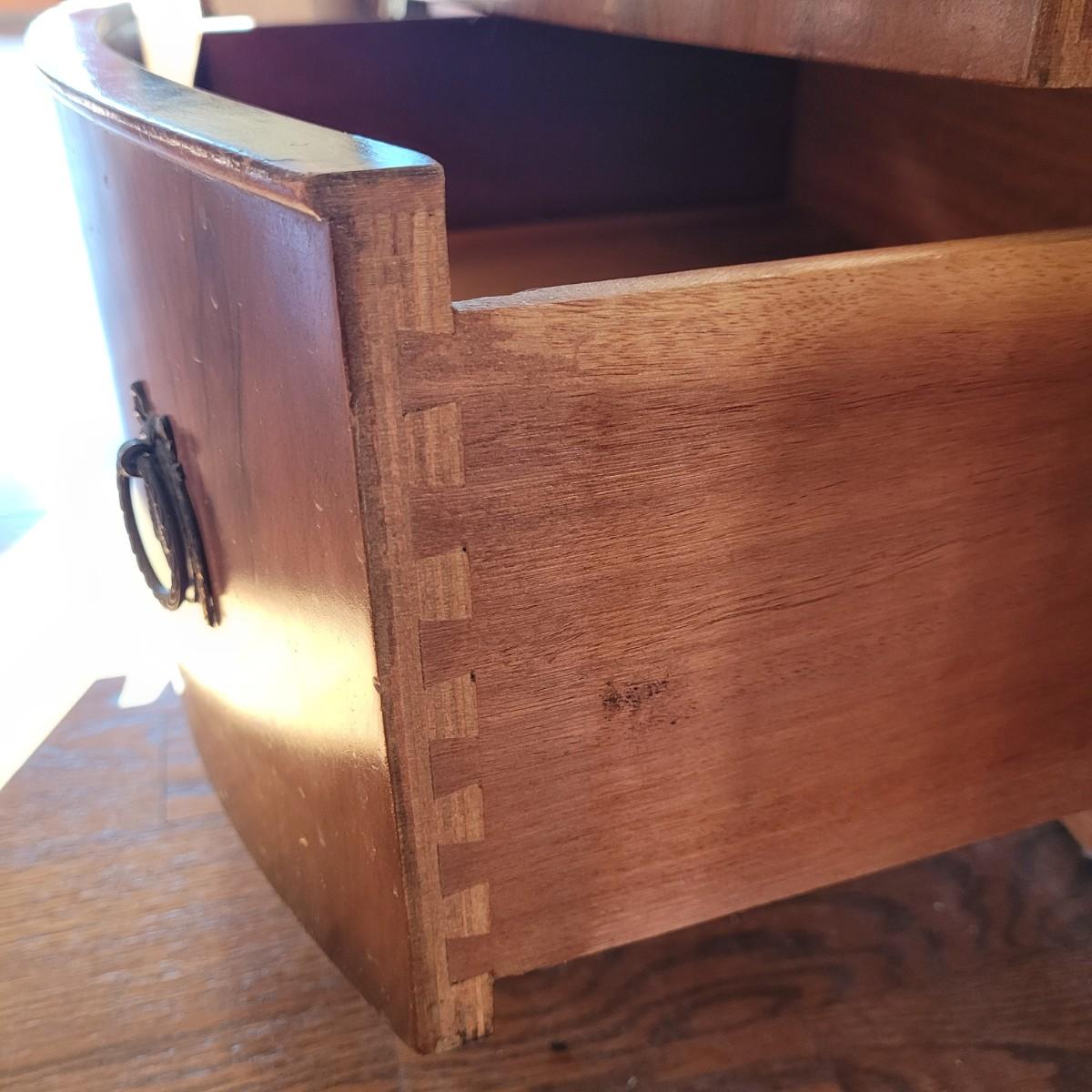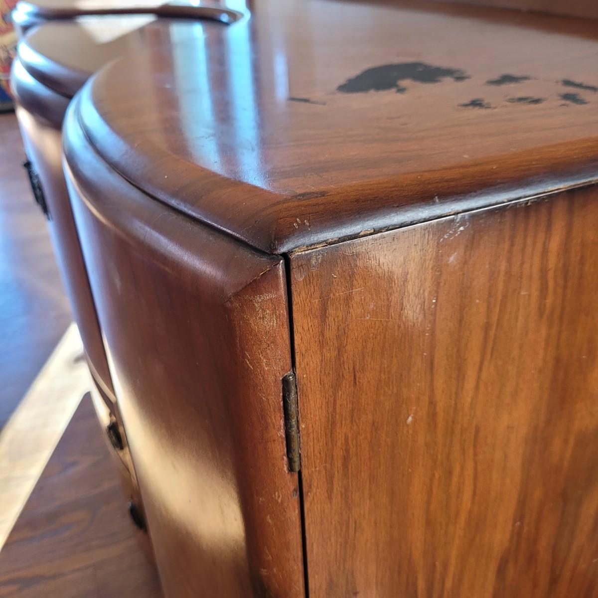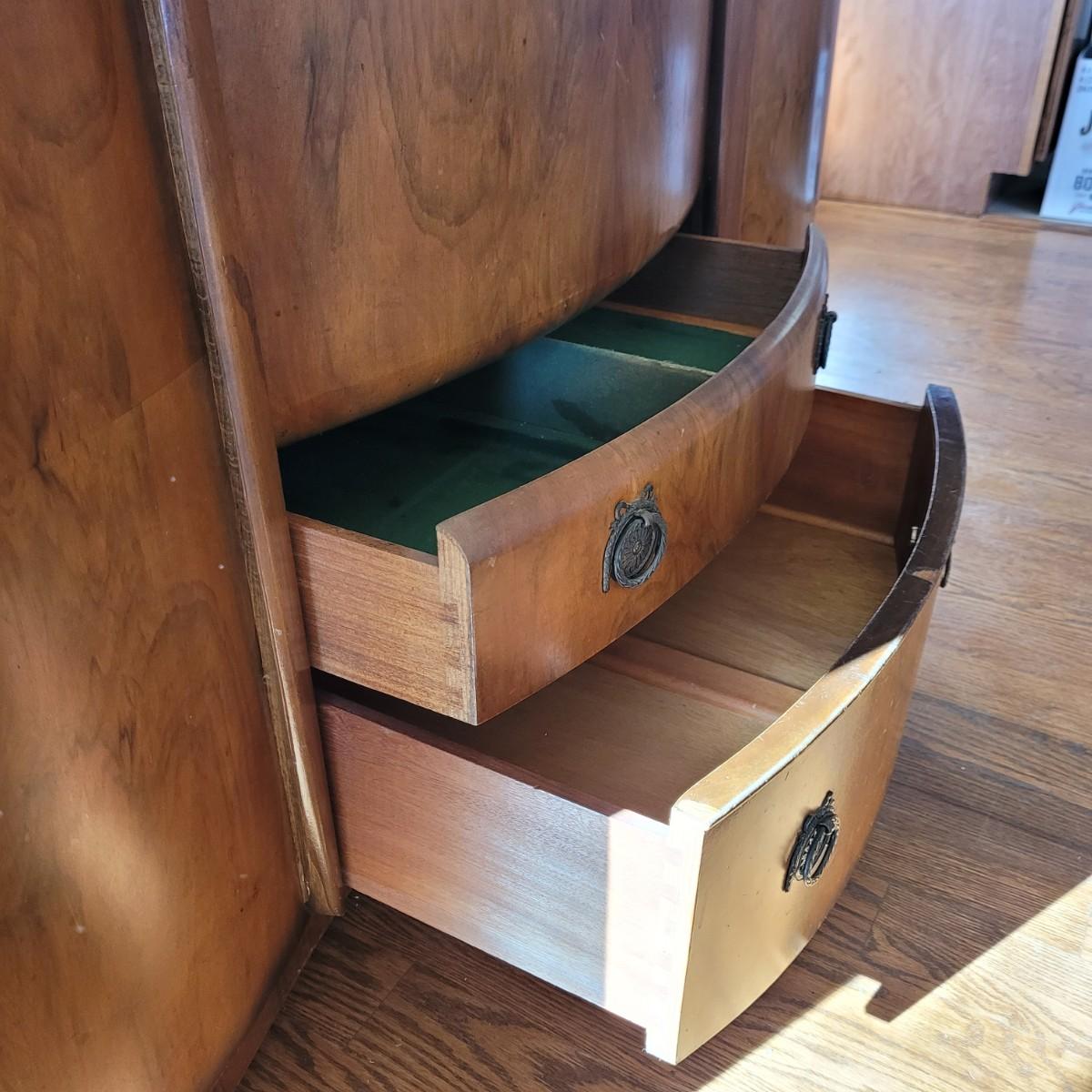 A vintage cocktail cabinet in good condition but does have some scratches and blemishes. This cocktail cabinet is manufactured by Beautility and is constructed of what appears to be burl walnut. It features a pull down tray that opens a top piece for the cocktail cabinet. It has two large side cabinets and two dovetailed drawers. The hardware is ornate brass pieces and measures approximately 54" x 21" x 36". Local pickup only. Winning bidder must bring assistance to help move and load this item due to its weight and/or size