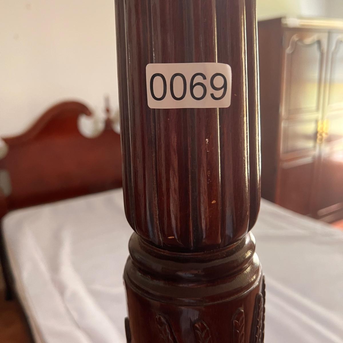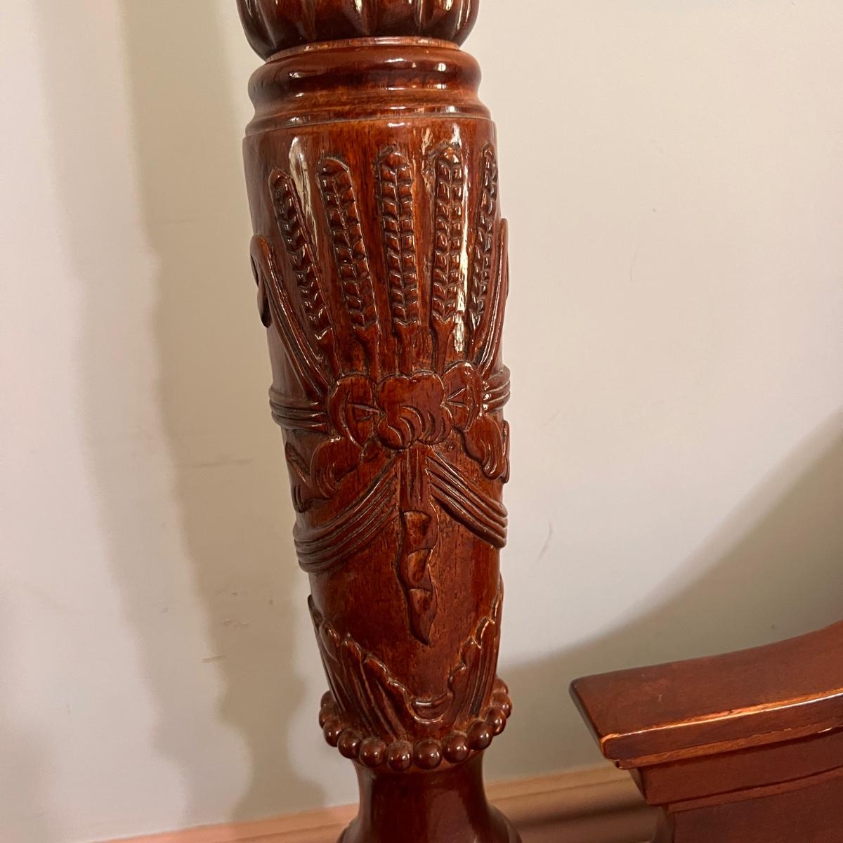 4 post rice carved bed in a traditional 18th century design. Commonly referred to as plantation beds, this bed stands on block collared feet. It has carved finials and beautiful reeded posts with rice carvings. There is some scuff wear as shown in the pictures. NOTE: The mattress base is not included. Its listed in lot #70. Also, you will need to disassemble it yourself so please bring the proper tools and vehicle to transport. This bed is solid wood and will probably be heavy.