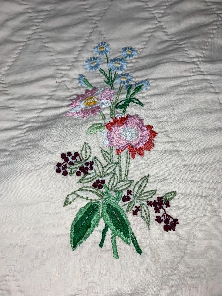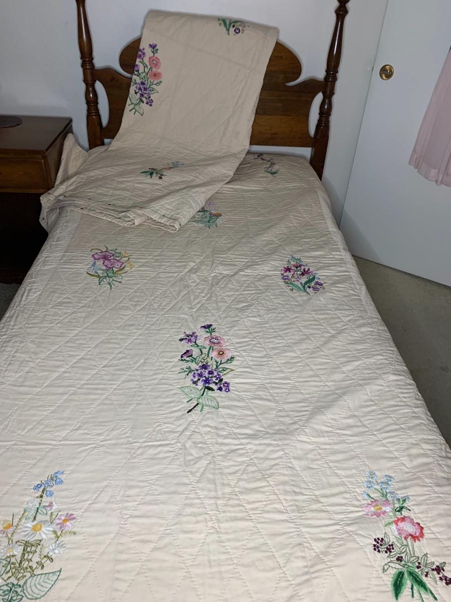 Pair of vintage embroidered twin size bedspreads. Good condition, no major tears or stains. Twin bed not included.