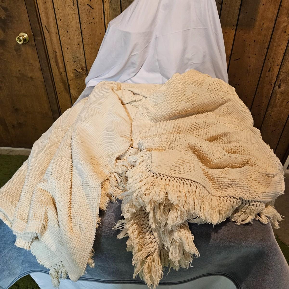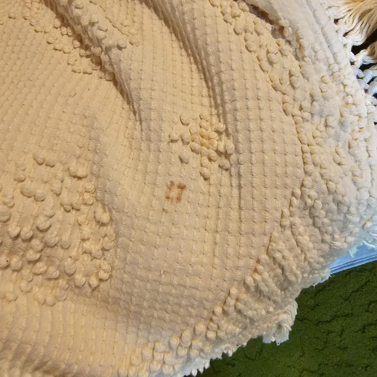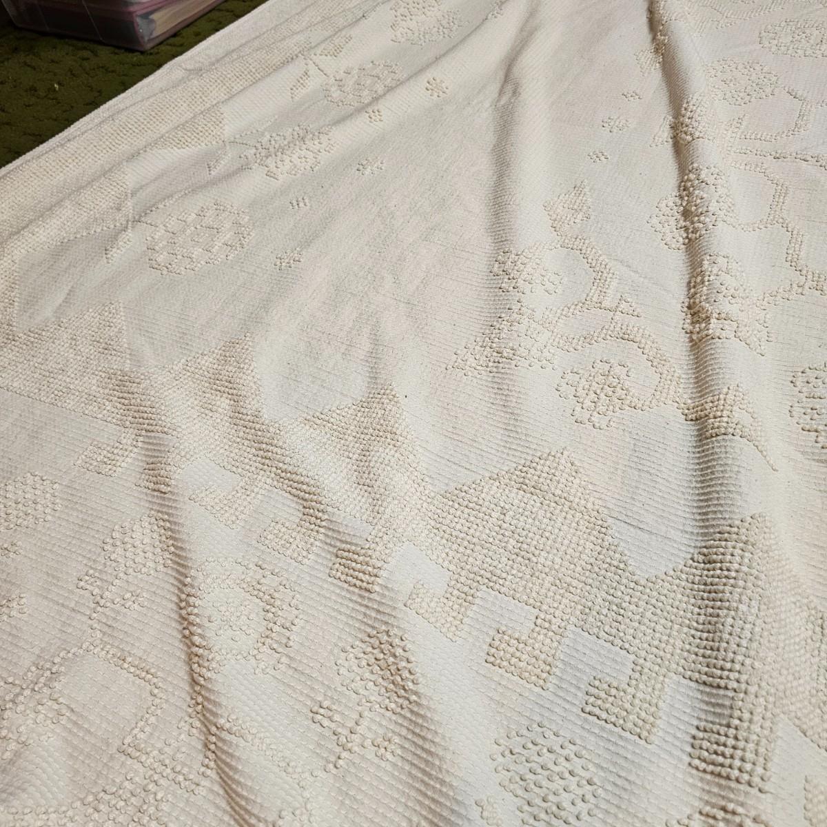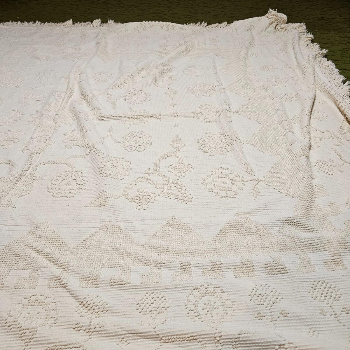 A vintage chenille bedspread in off white with decorative knotted fringe. Spreads measures 94" x 108", is by Bates, listed as George Washington's Choice. A few minor spots. Other items are a twin size Charter Club bedspread of Egyptian cotton, and a matching pillow sham. Spread is 64" x 90", sham is 24" x 31". Also a few spots, see photos for details. Shipping available.