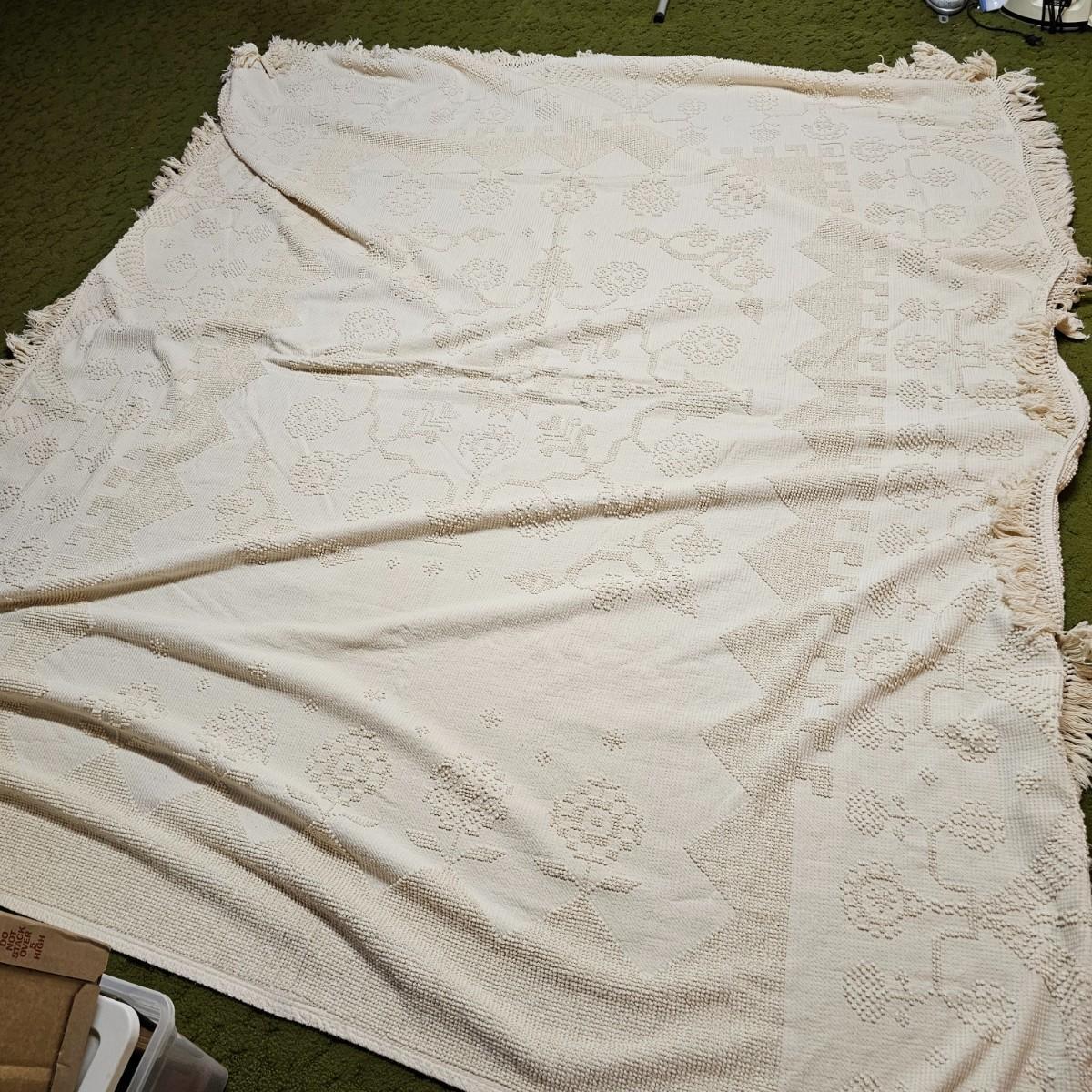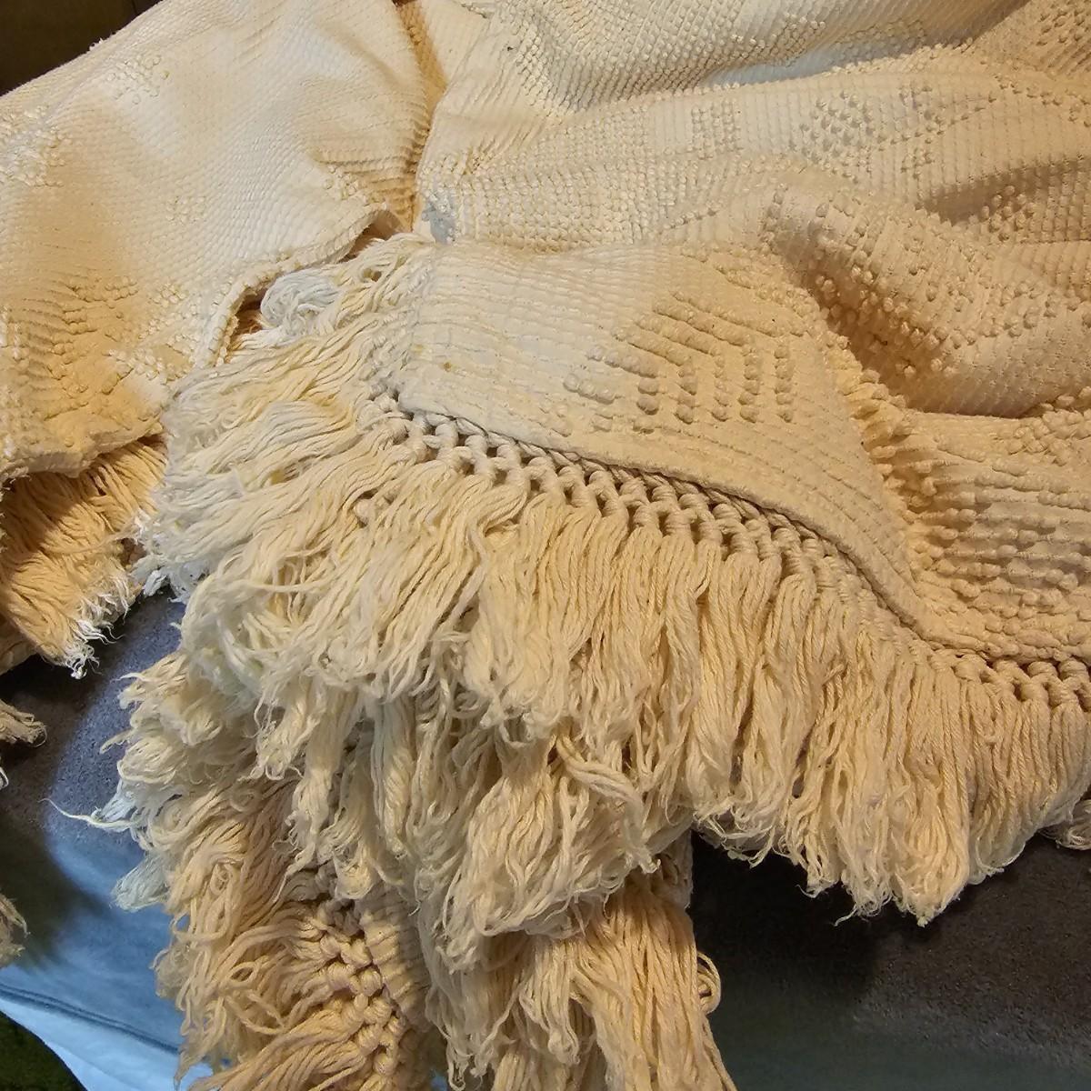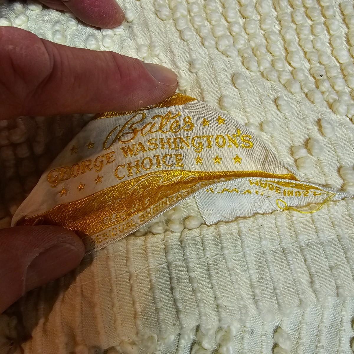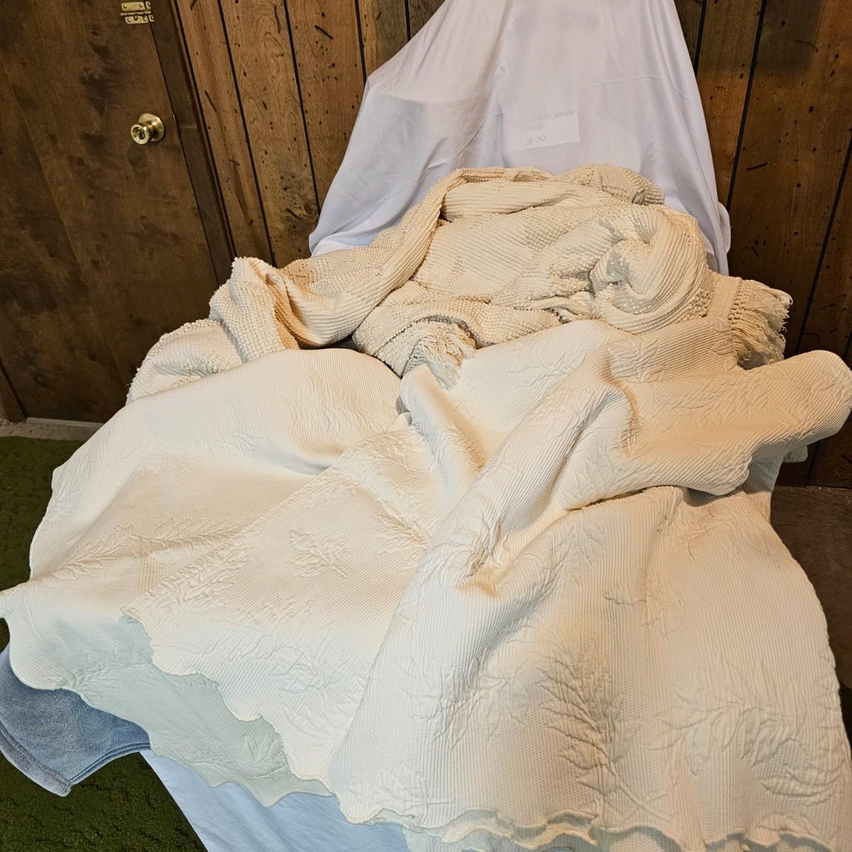 A vintage chenille bedspread in off white with decorative knotted fringe. Spreads measures 94" x 108", is by Bates, listed as George Washington's Choice. A few minor spots. Other items are a twin size Charter Club bedspread of Egyptian cotton, and a matching pillow sham. Spread is 64" x 90", sham is 24" x 31". Also a few spots, see photos for details. Shipping available.