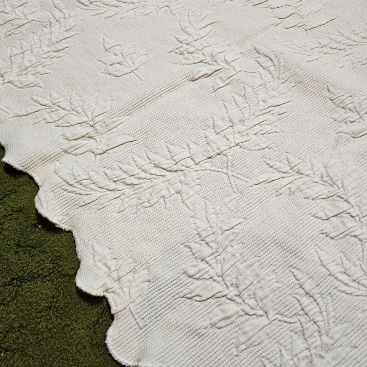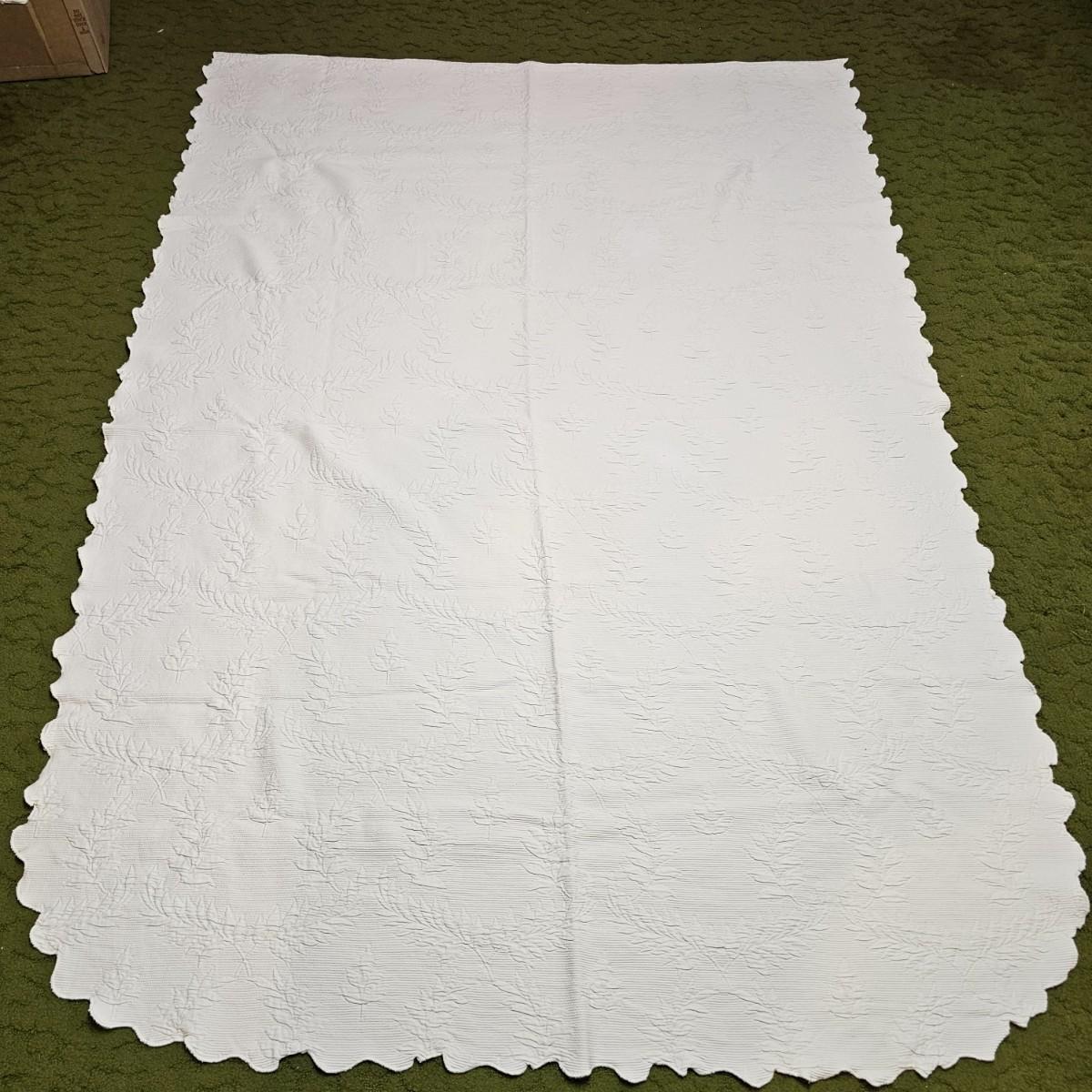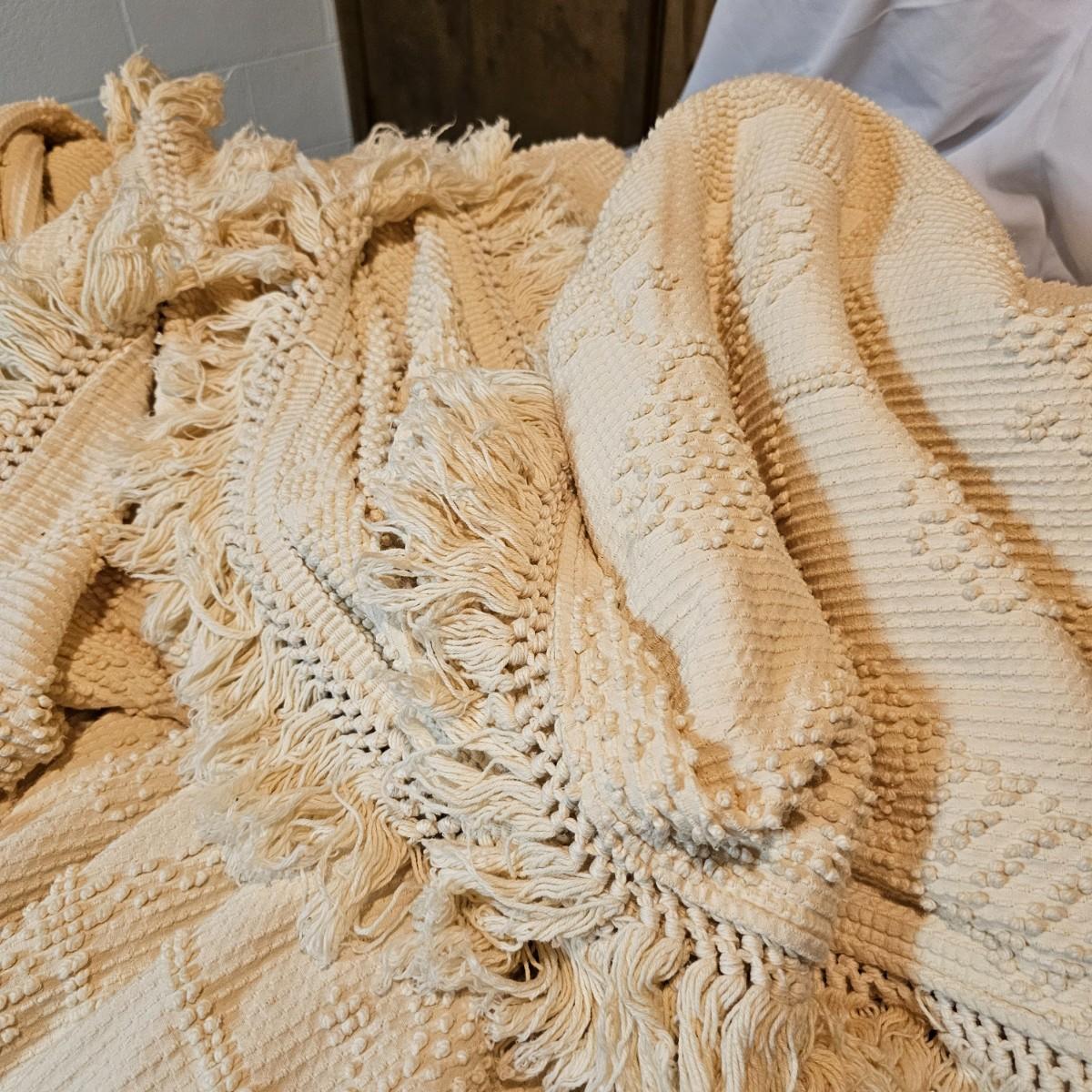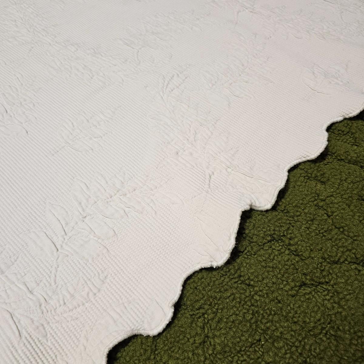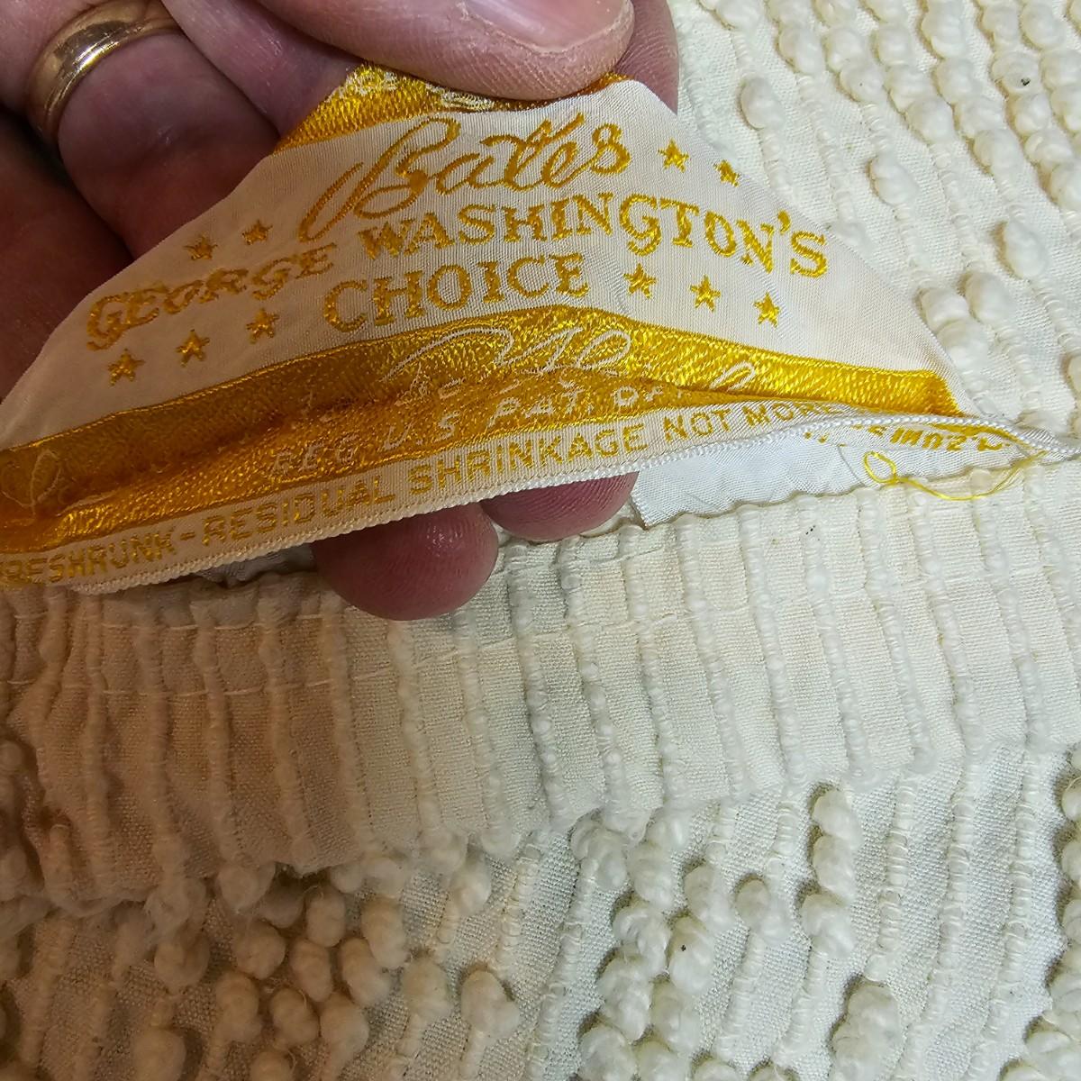 A vintage chenille bedspread in off white with decorative knotted fringe. Spreads measures 94" x 108", is by Bates, listed as George Washington's Choice. A few minor spots. Other items are a twin size Charter Club bedspread of Egyptian cotton, and a matching pillow sham. Spread is 64" x 90", sham is 24" x 31". Also a few spots, see photos for details. Shipping available.
