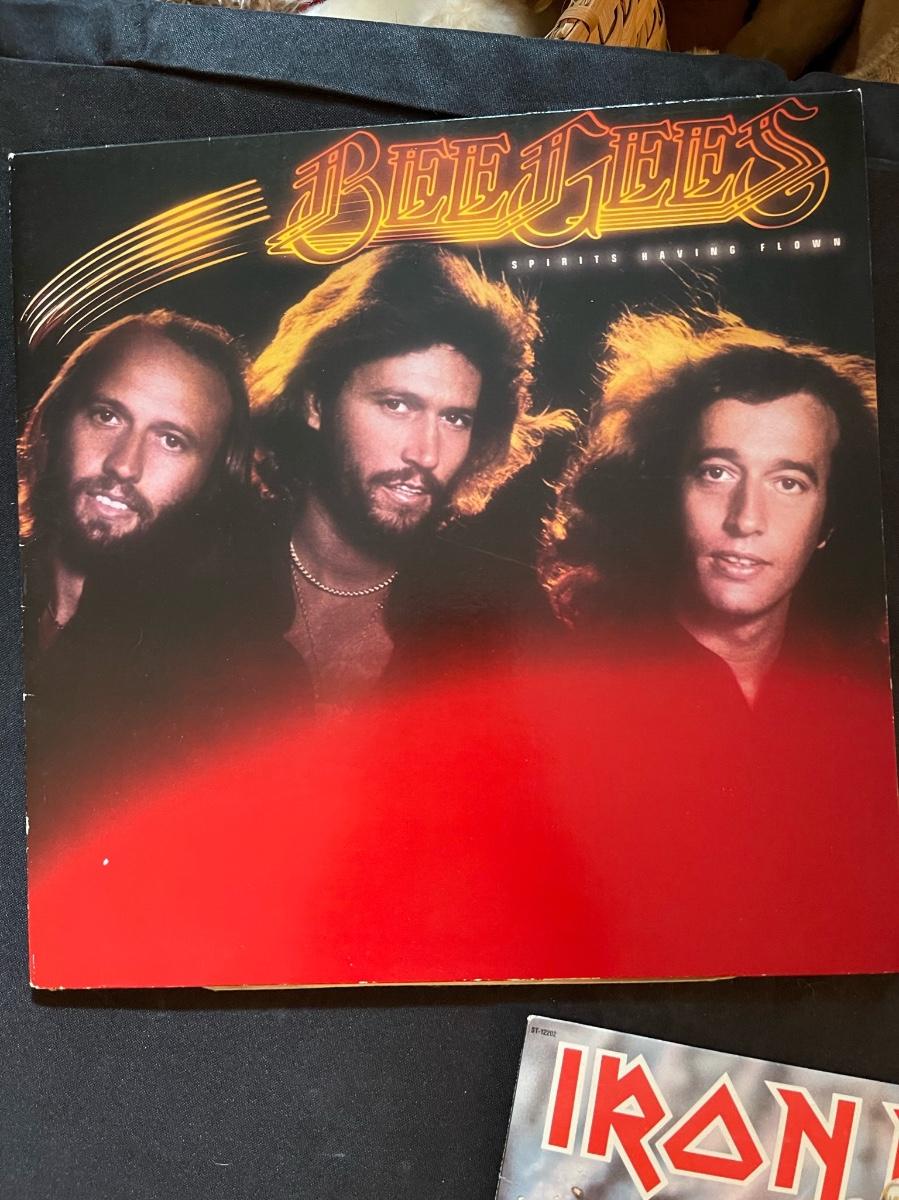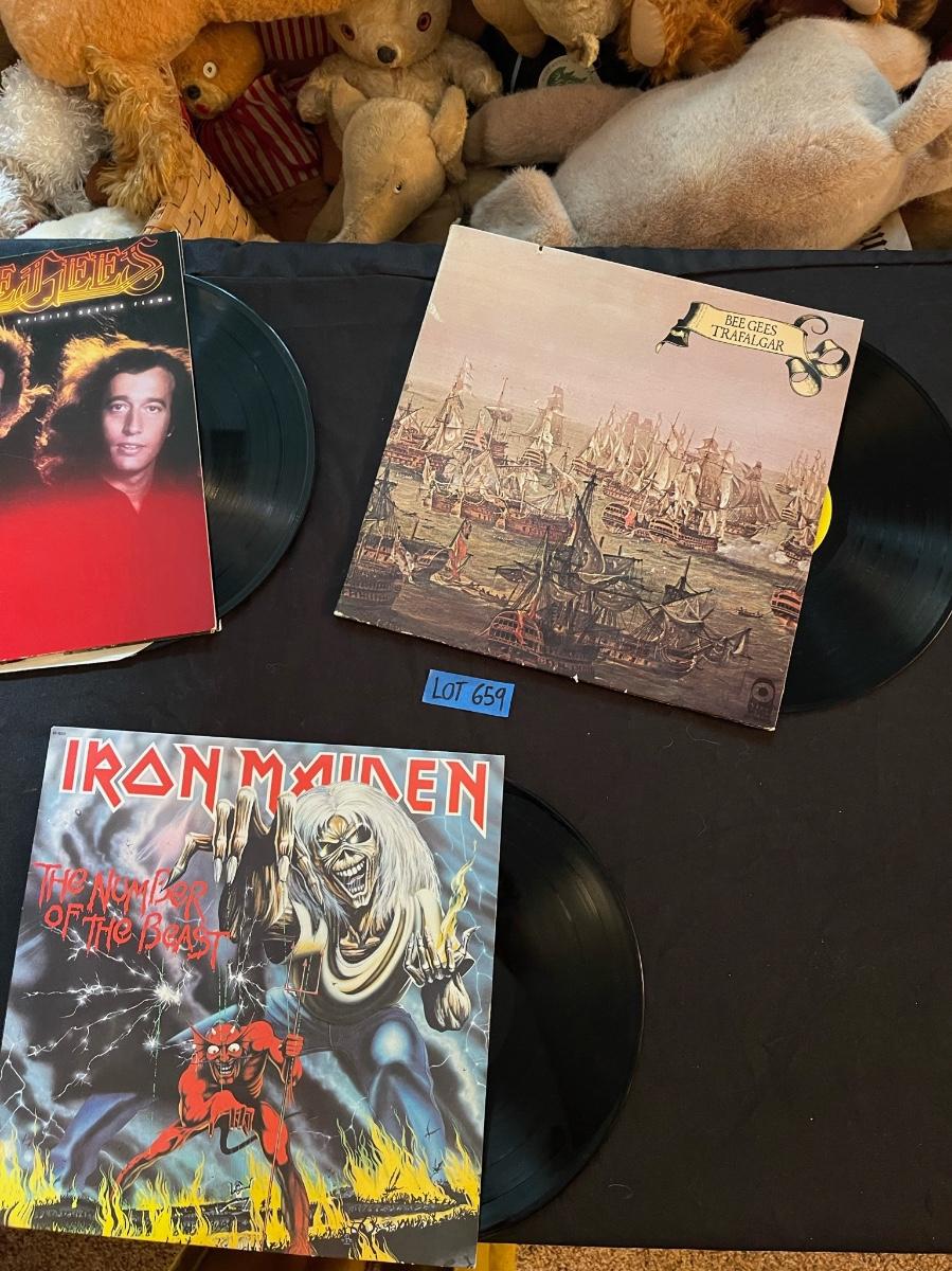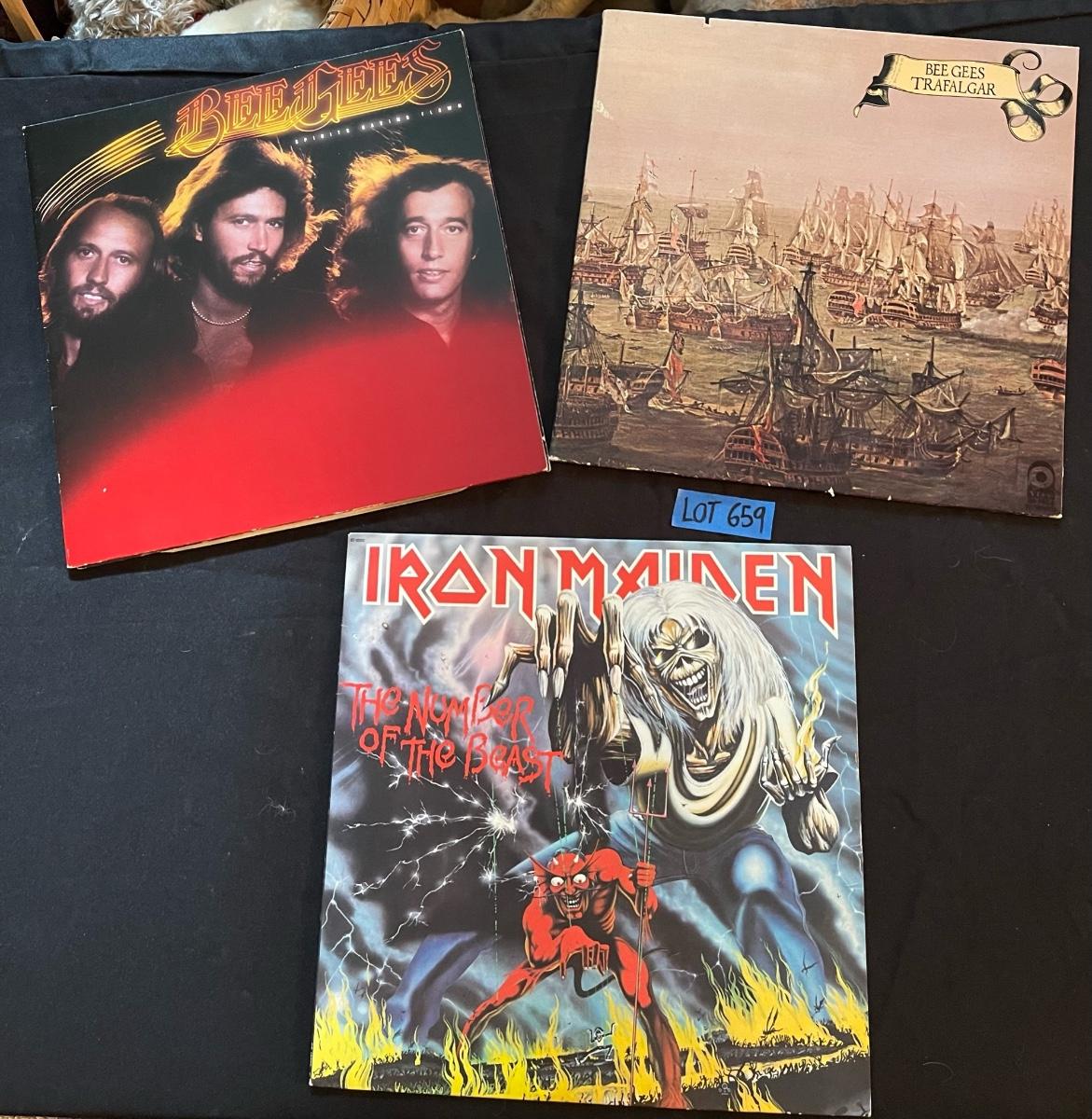 (2) Vintage Bee Gees Vinyls, Iron Maiden Vinyl.