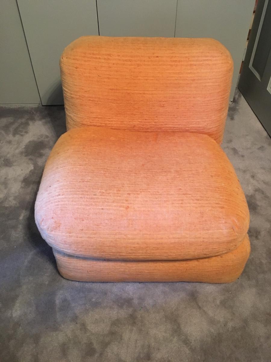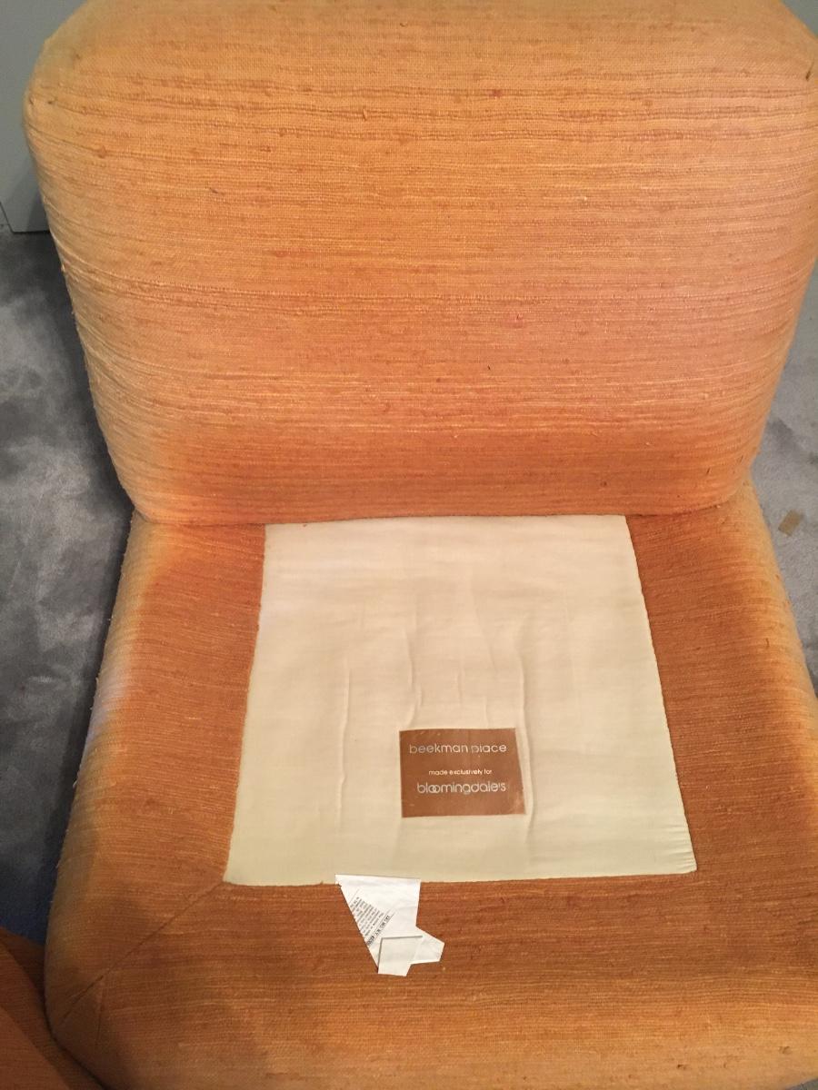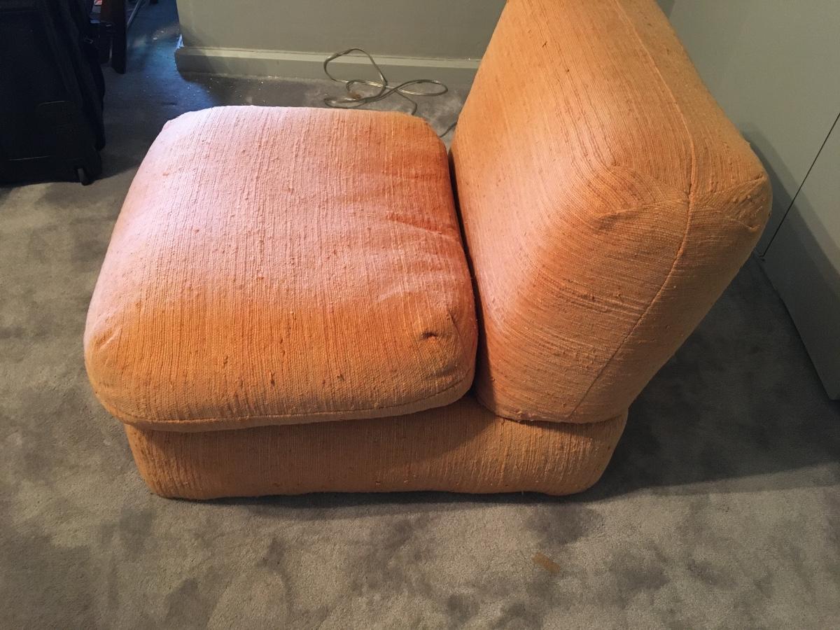 Armless chair with removable cushion. No rips or tears, some fading from sun.