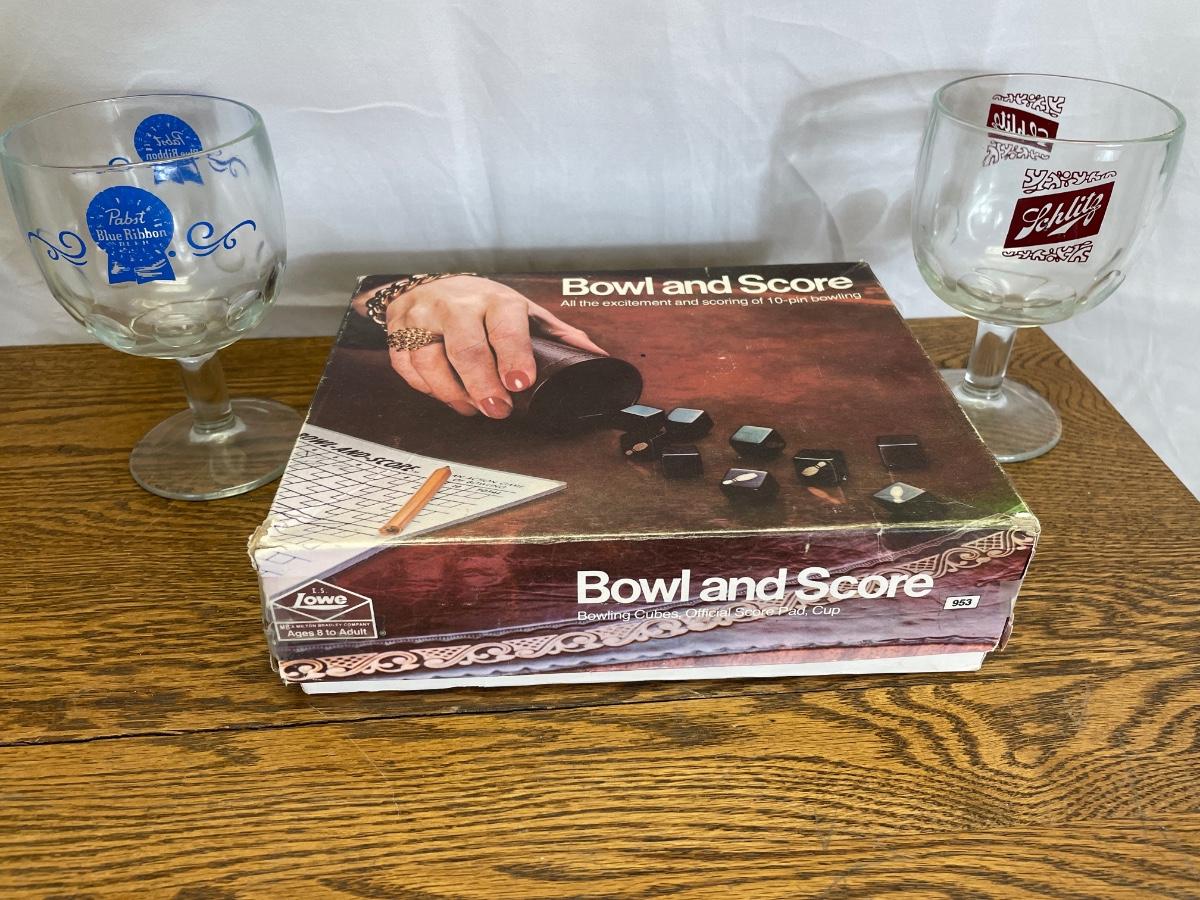 2 beer goblets and vintage bowl dice game