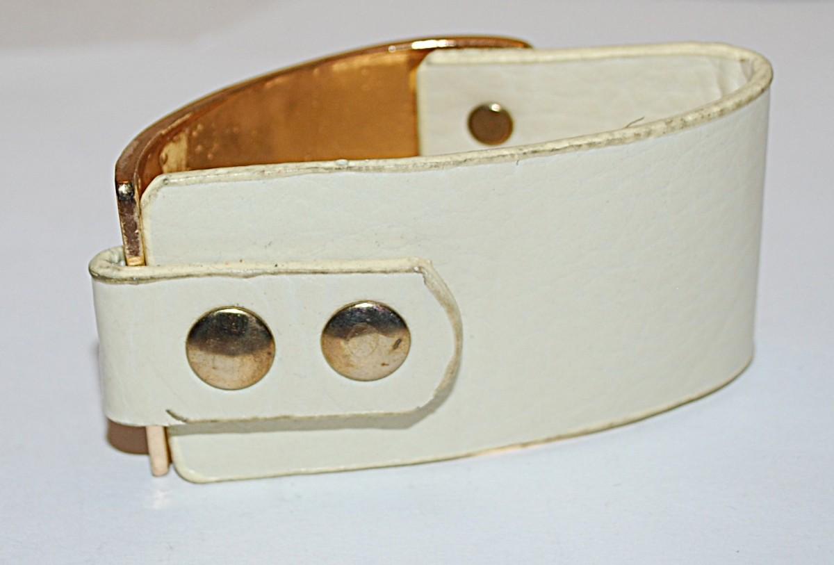 VINTAGE Beige Leather-Style CUFF BRACELET (2" Opening) with Brushed Gold Tone Side and 2 Snaps Closure
