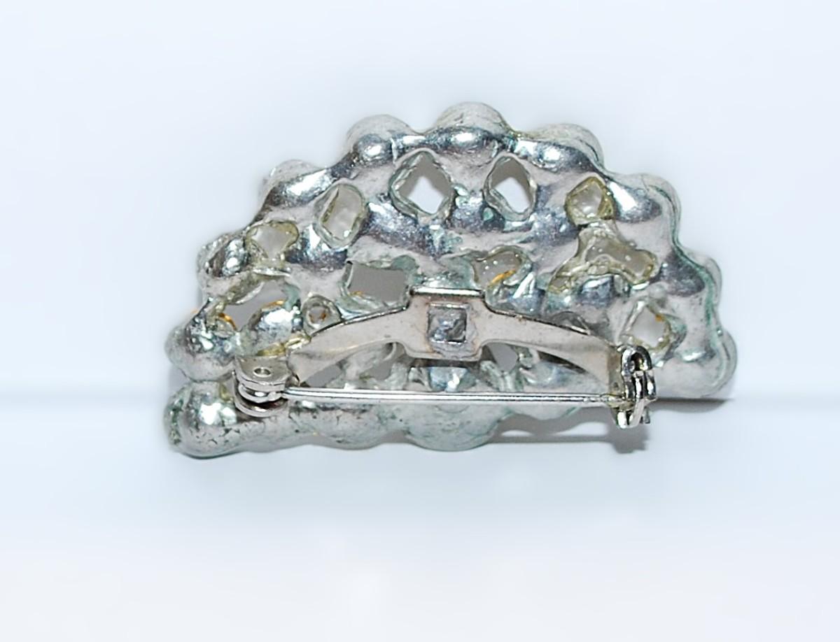 Vintage Bejeweled FAN BROOCH (1½" x ¾") with Single Faux PEARL and a Silver Tone Setting