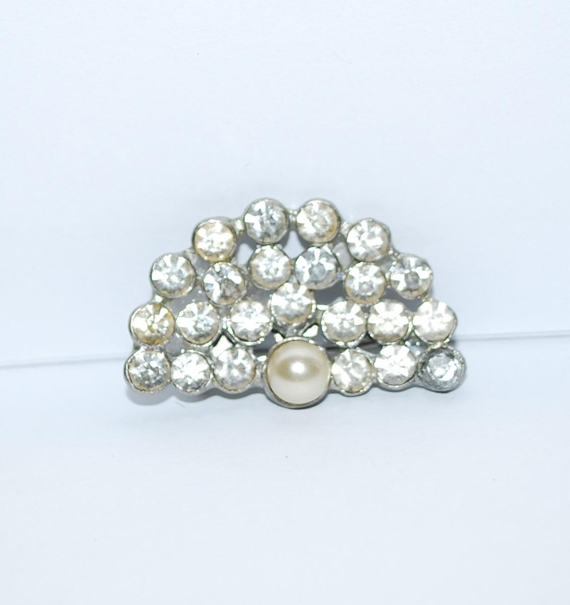 Vintage Bejeweled FAN BROOCH (1½" x ¾") with Single Faux PEARL and a Silver Tone Setting