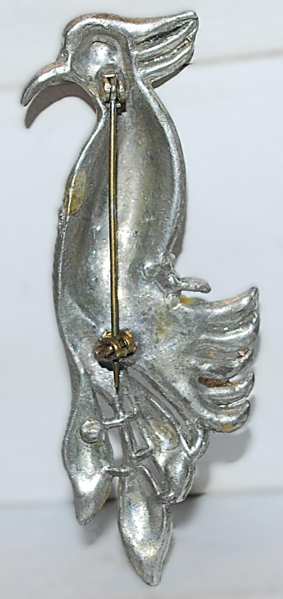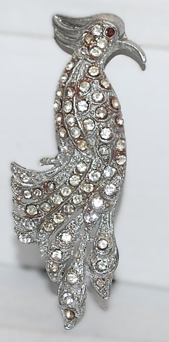 VINTAGE BEJEWELED PEACOCK-STYLE BIRD BROOCH (3" x 1") with RED Eye on a Solid Silver Tone Setting