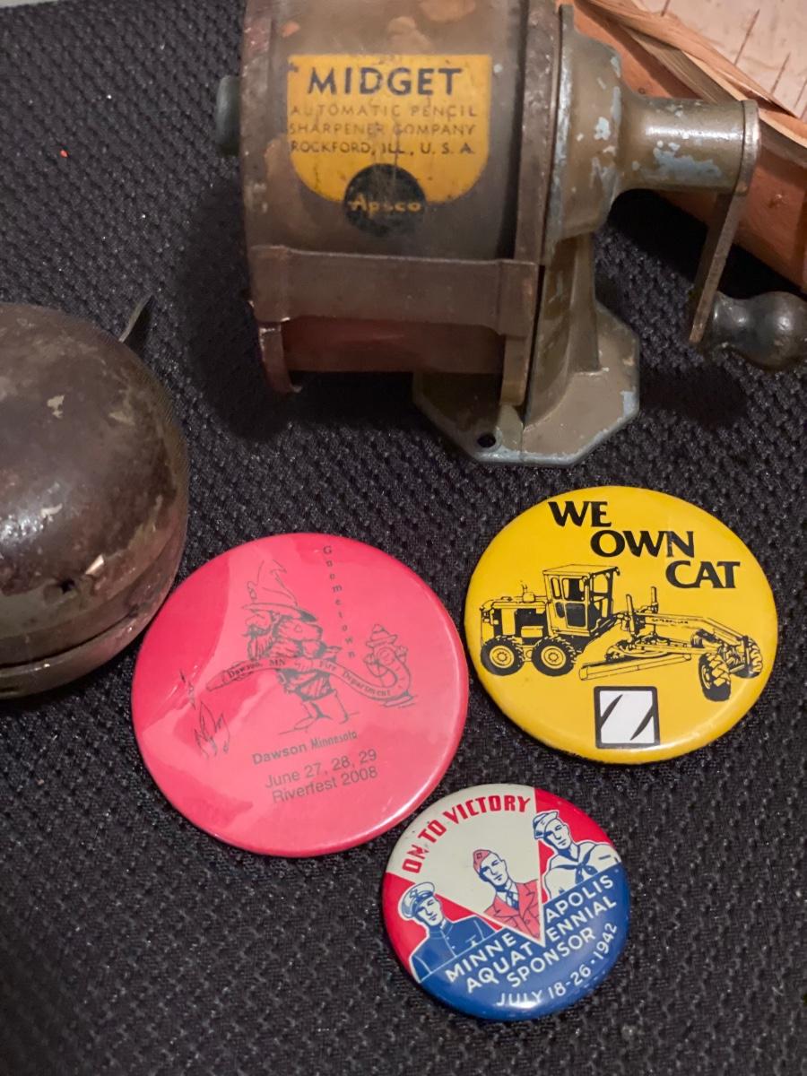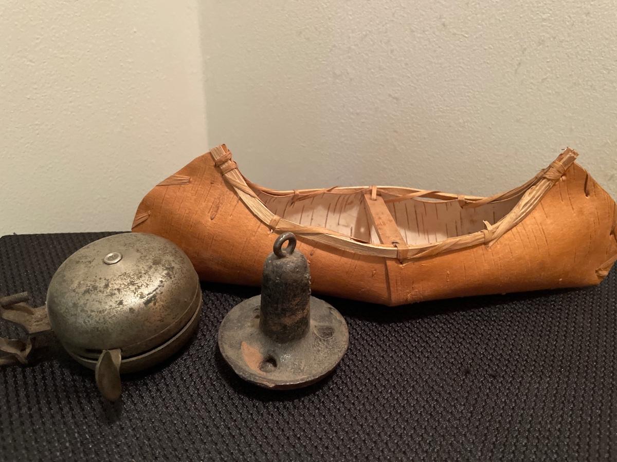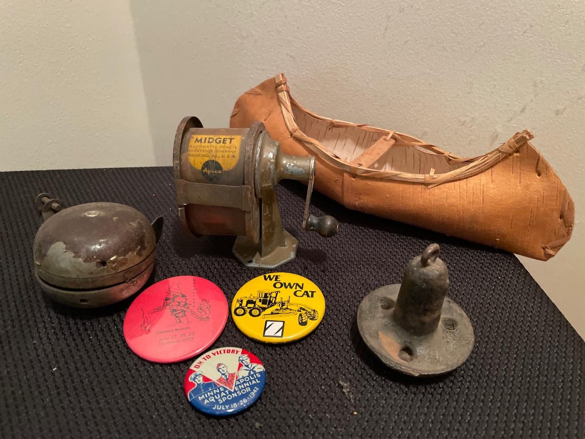 Vintage bell, anchor, pins, sharpener and paper canoe