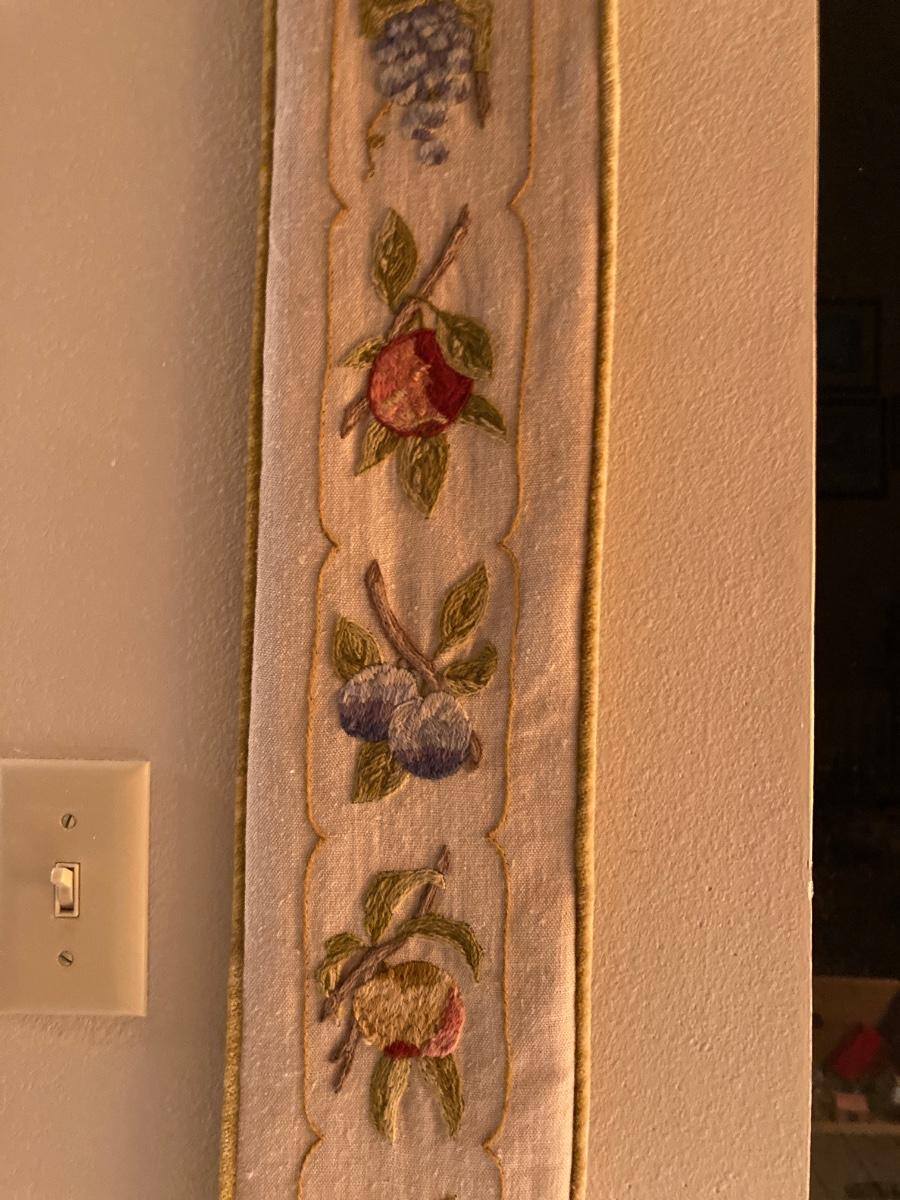Vintage bell pull embroidery fruits hand embroidered panel is 41 1/2 h X 6 w bell pull is 62” full length