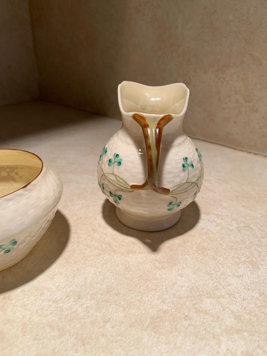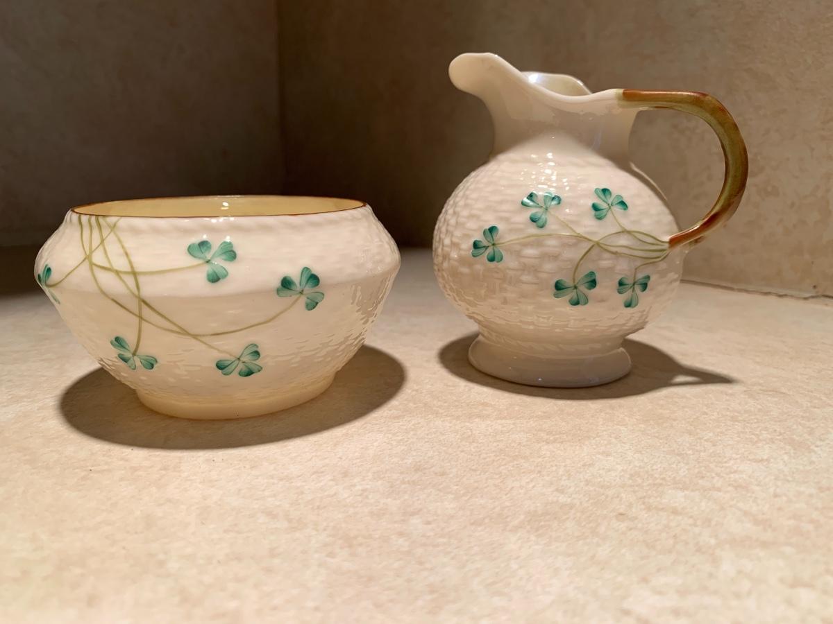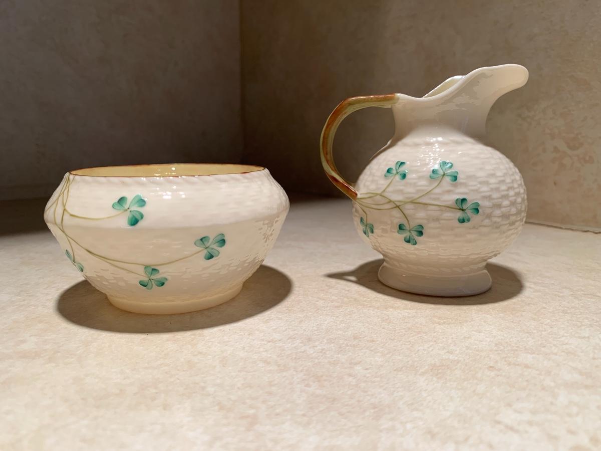 his vintage BELLEEK set features an open sugar bowl and creamer, both adorned with a beautiful shamrock pattern and basket weave texture. The set is made of porcelain and bone china.