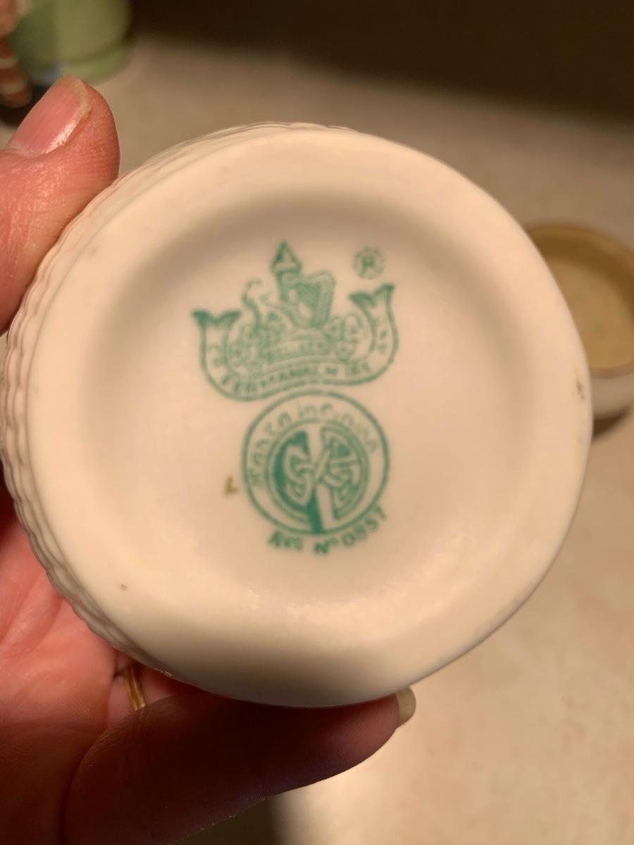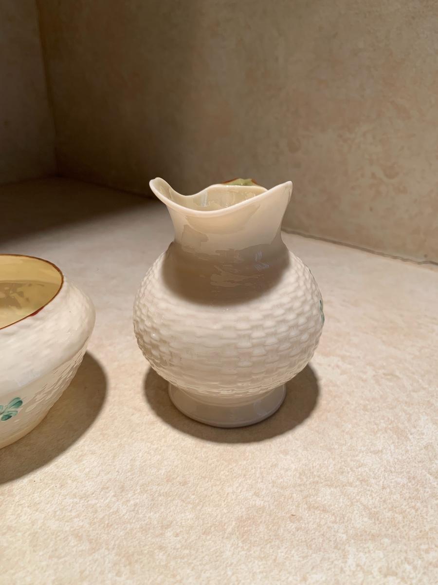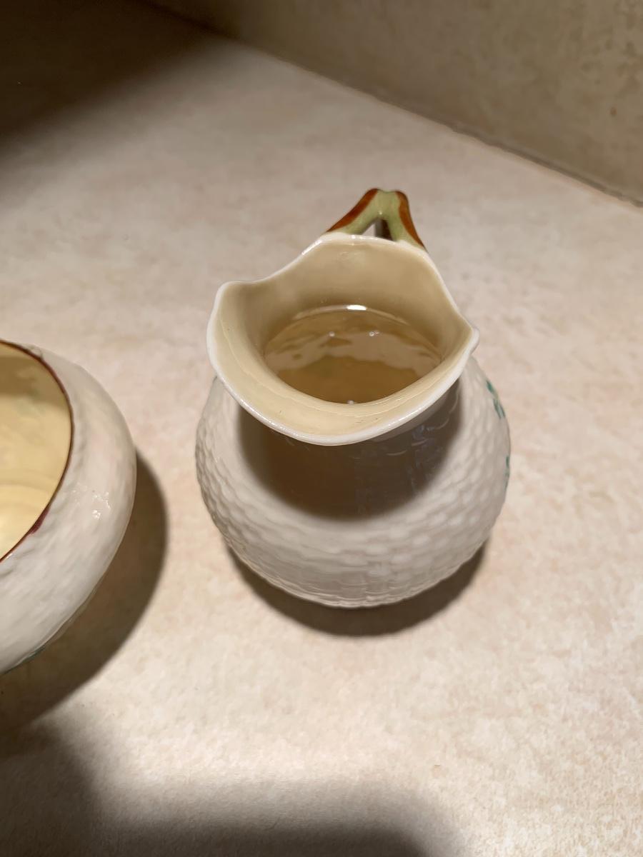 his vintage BELLEEK set features an open sugar bowl and creamer, both adorned with a beautiful shamrock pattern and basket weave texture. The set is made of porcelain and bone china.