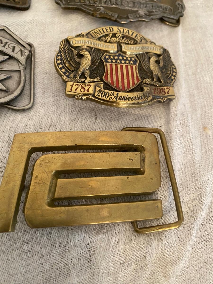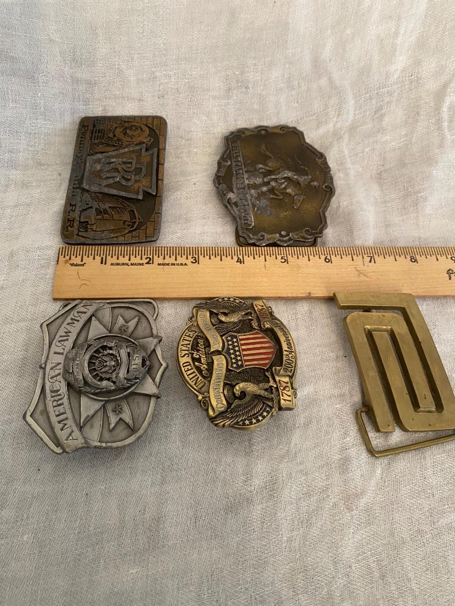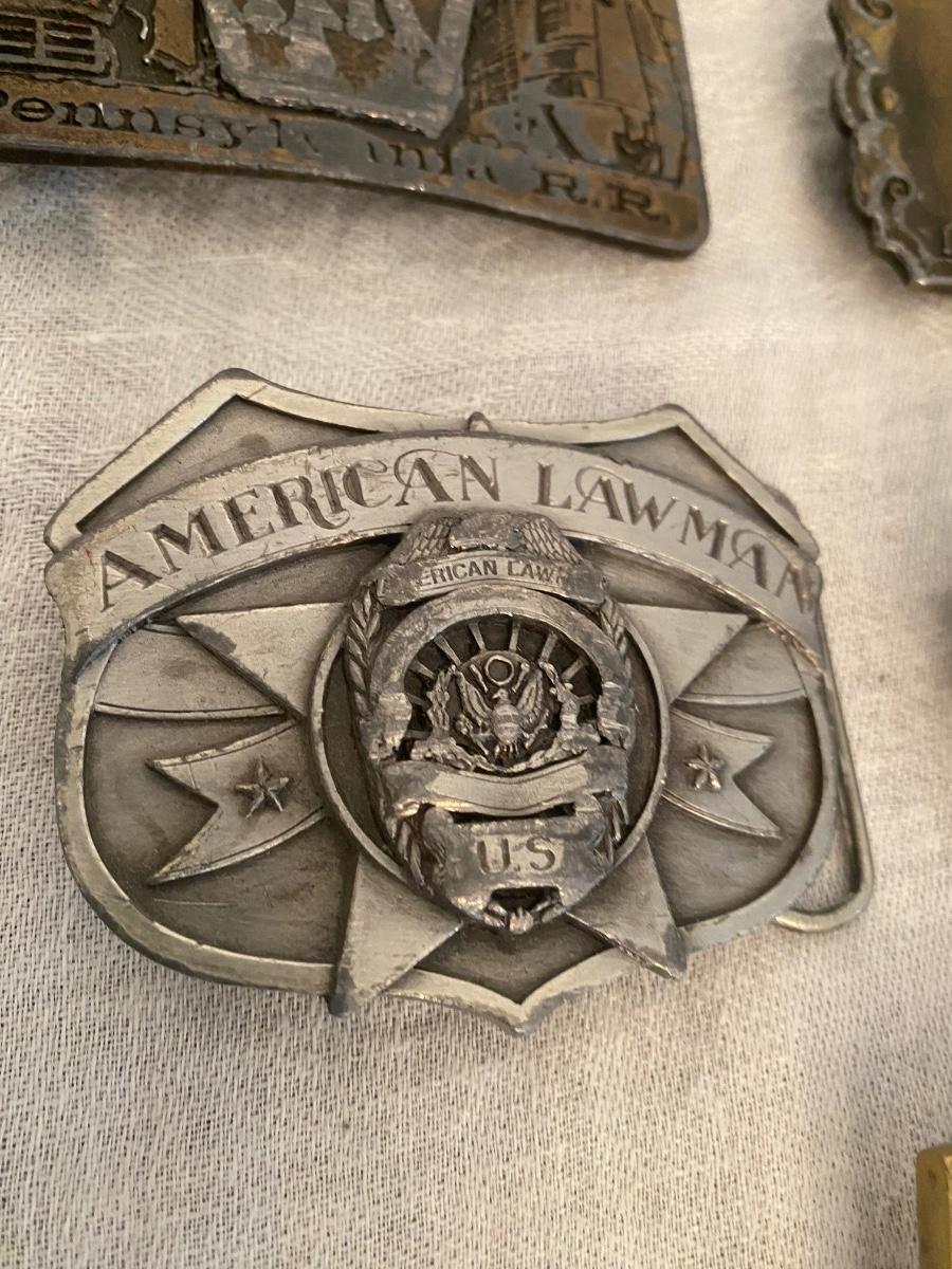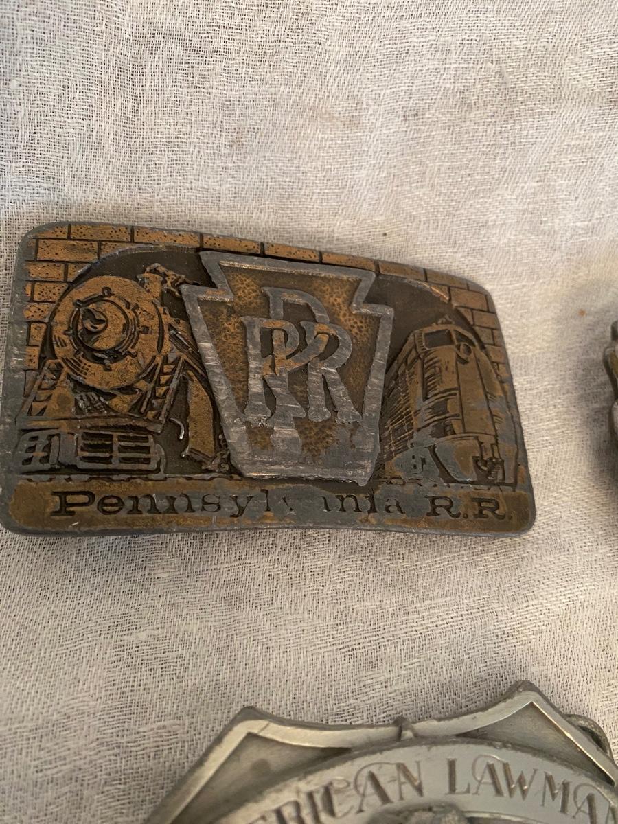 Assortment of belt buckles, including Penn Rail Road,American Lawman, US Constitution anniversary, Wells Fargo Pony Express,and Penn Central buckle.