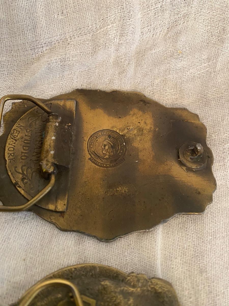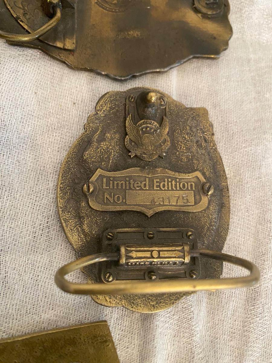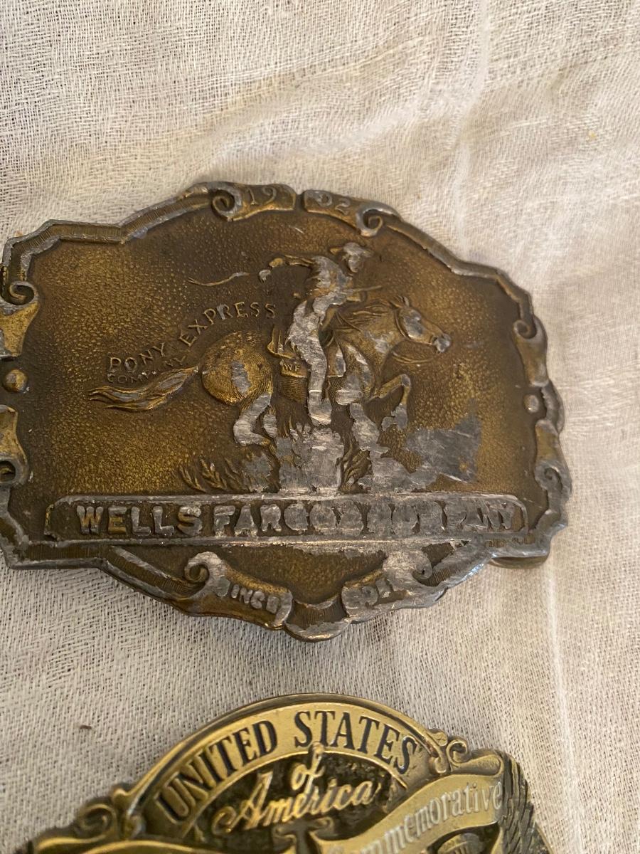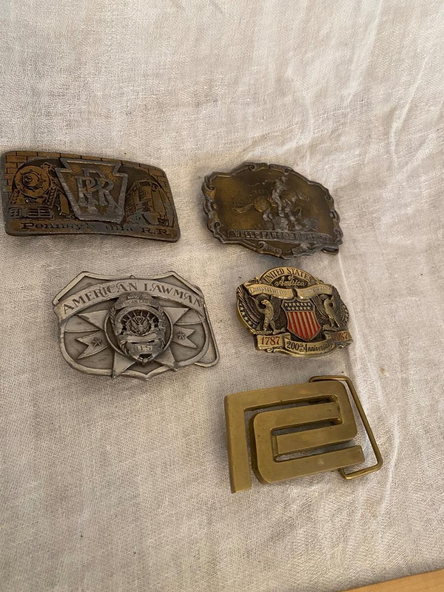 Assortment of belt buckles, including Penn Rail Road,American Lawman, US Constitution anniversary, Wells Fargo Pony Express,and Penn Central buckle.