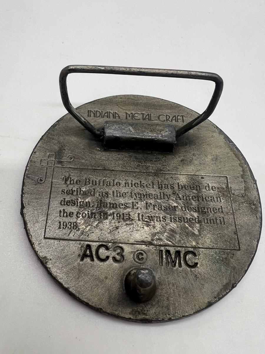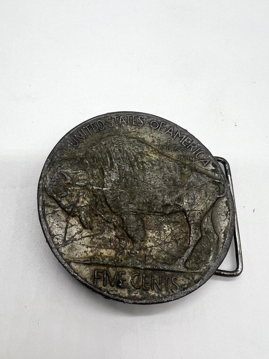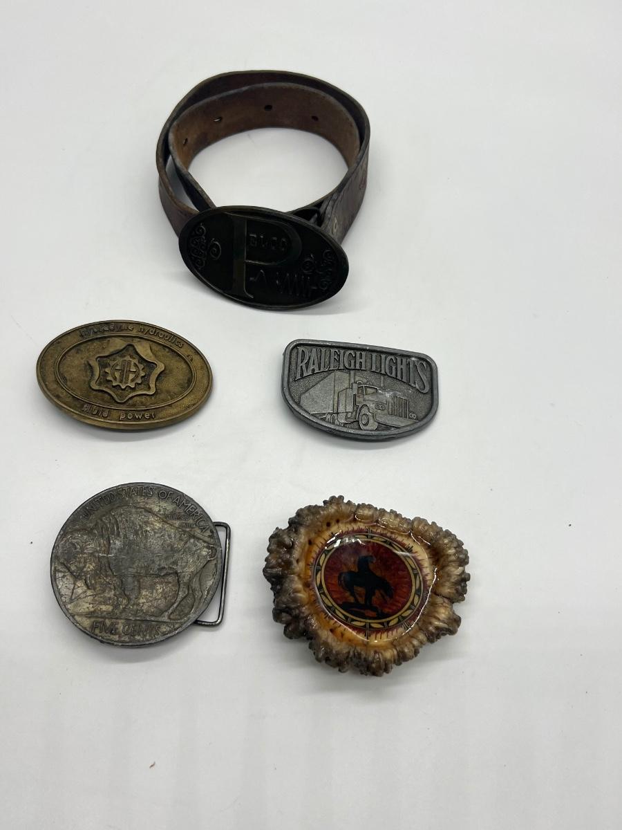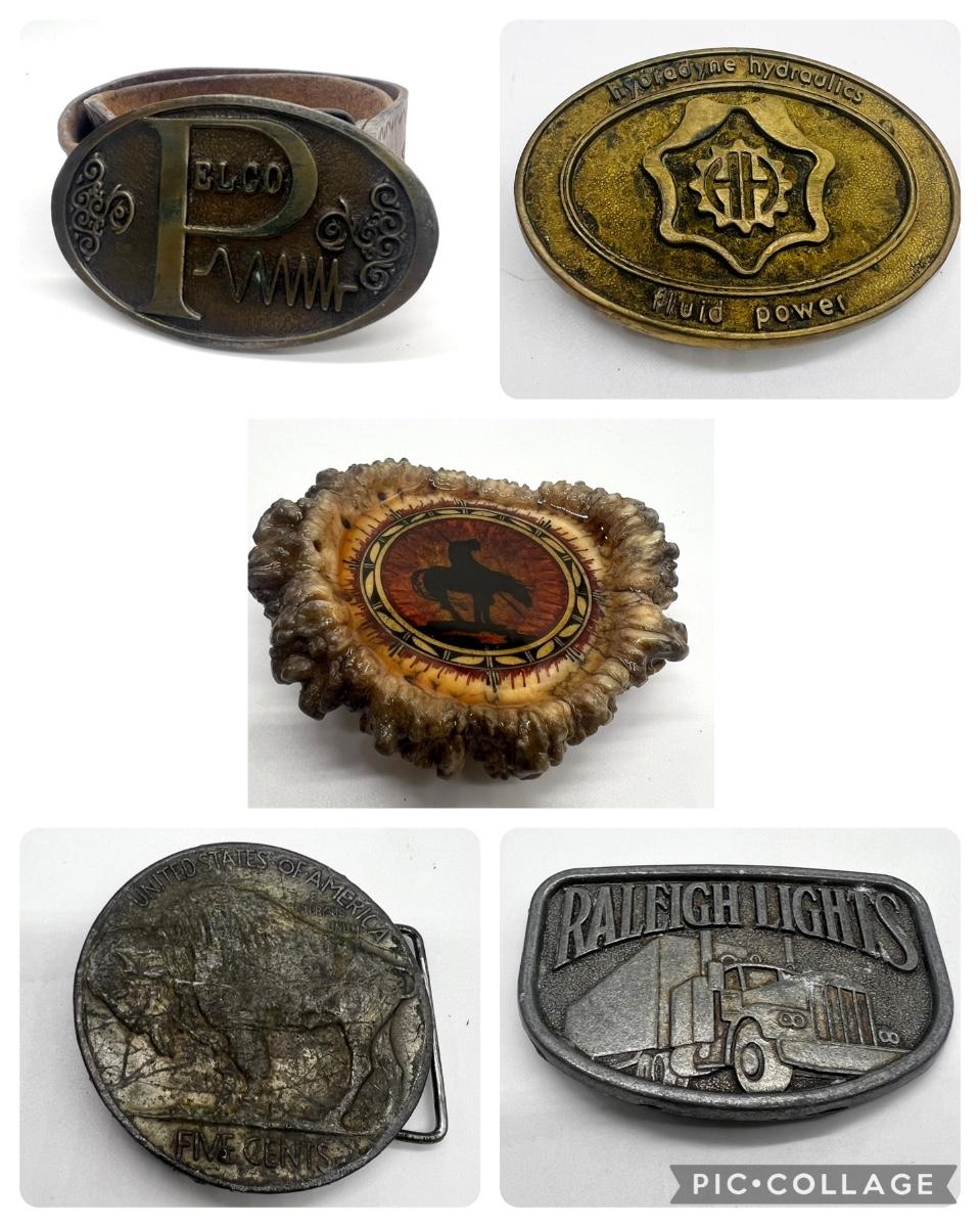 Five vintage Belt Buckle lot. VINTAGE 1970s PELCO security camera company, Vintage Elk Antler Rodeo Belt Buckle, Vintage metal Pewter RALEIGH LIGHTS belt buckle, Buffalo nickel coin belt, buckle Indiana metal craft and Hydradyne hydraulics fluid power solid brass belt buckle.