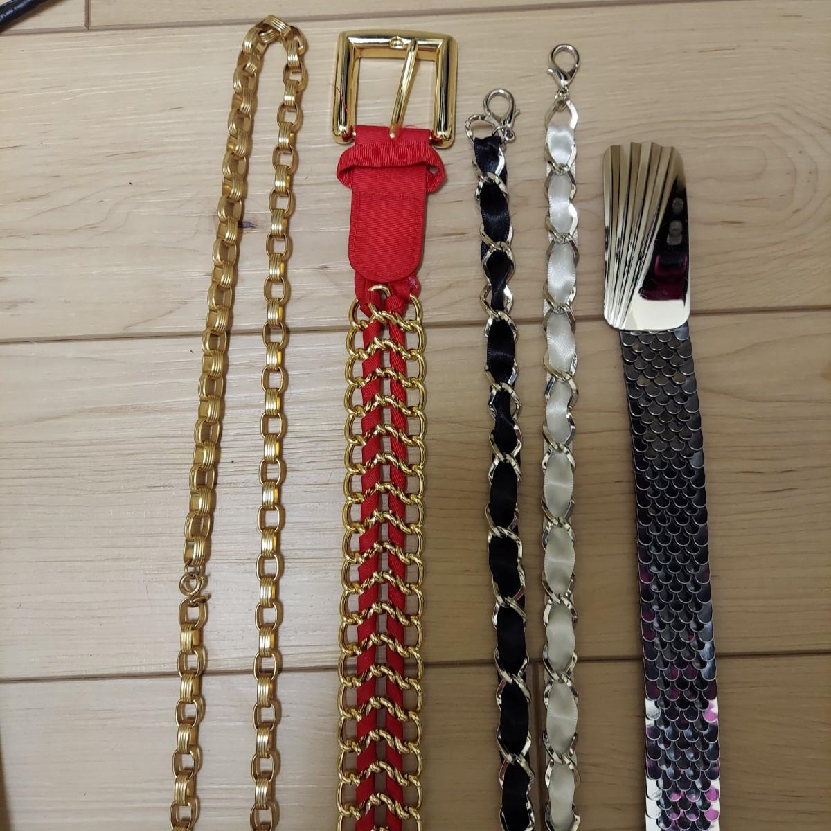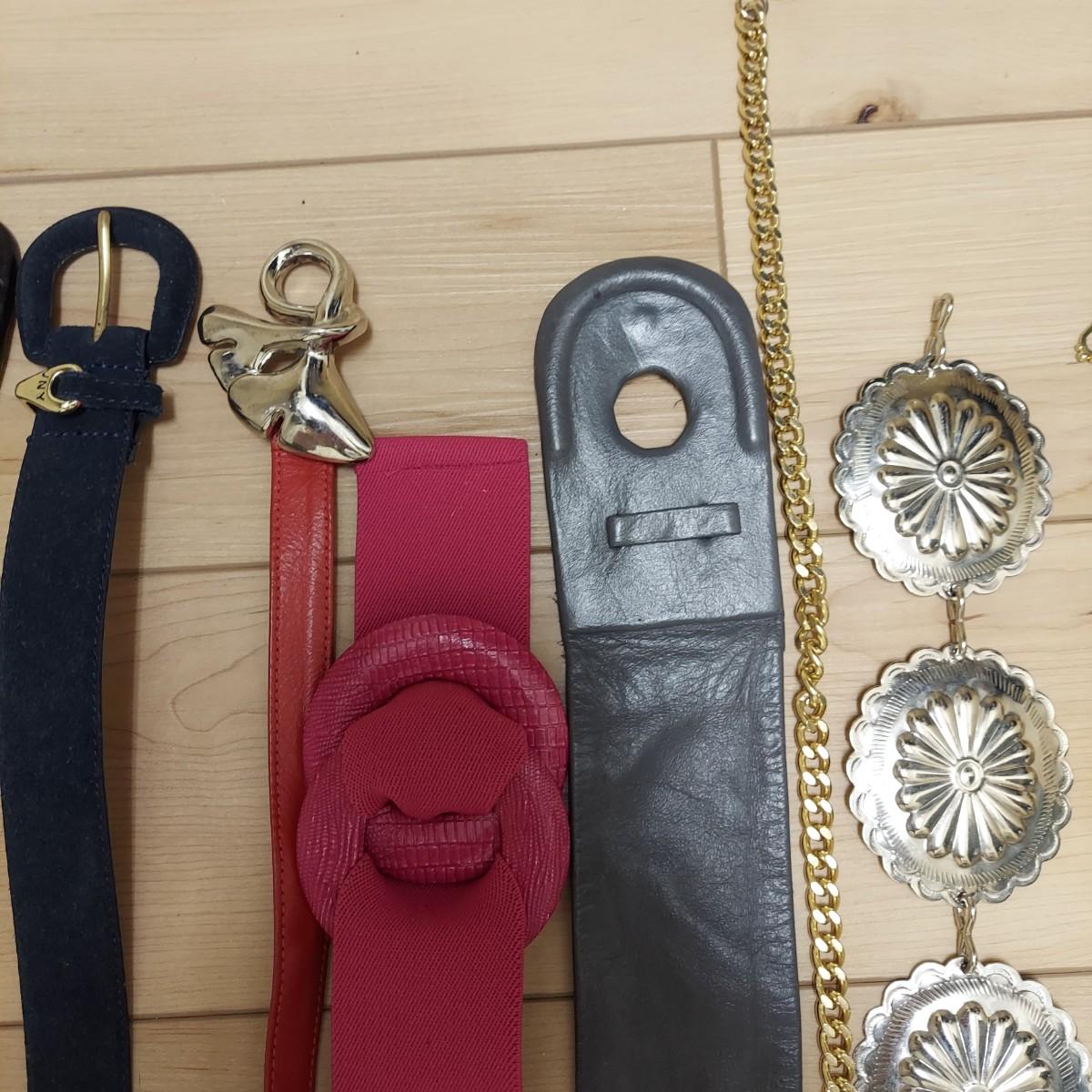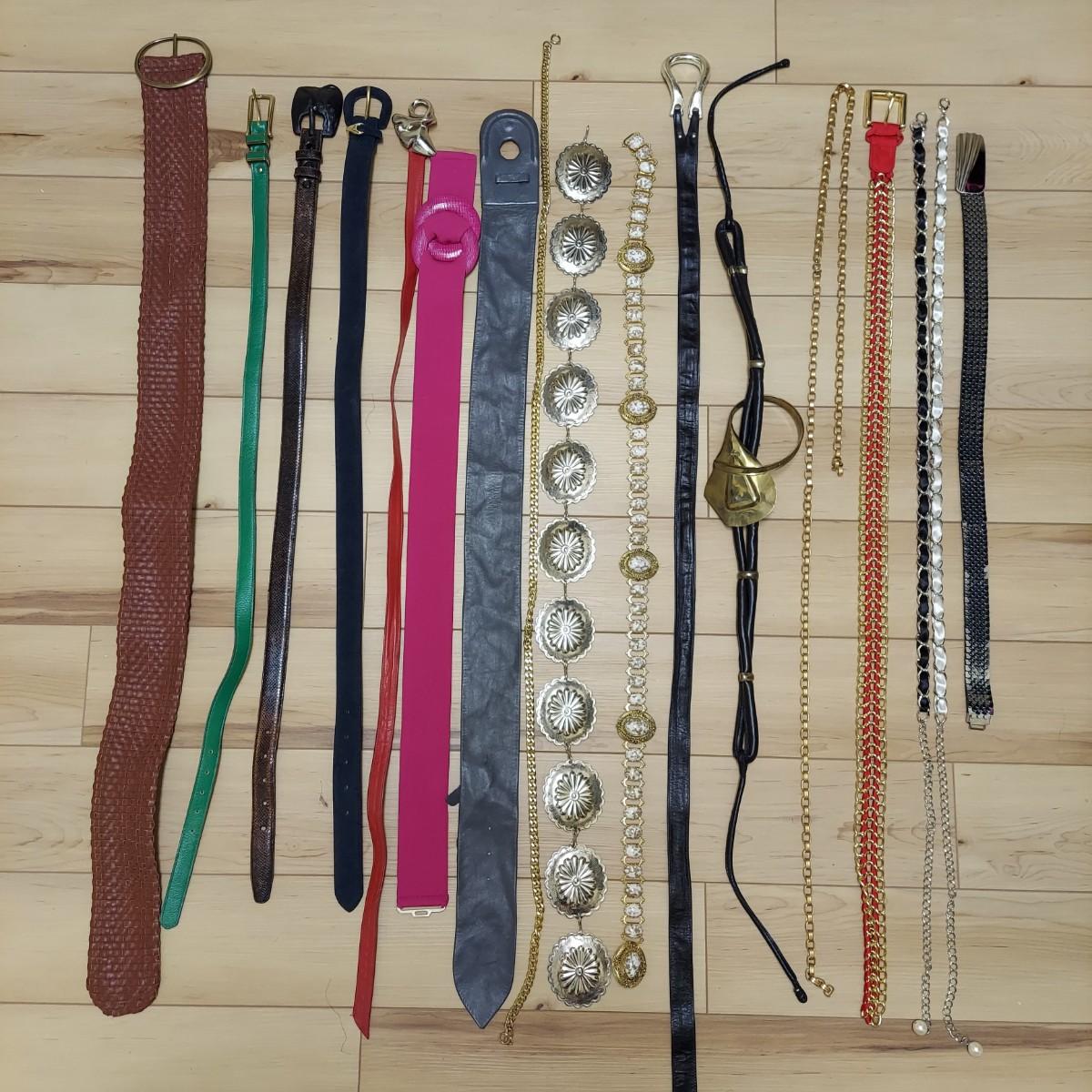 Various styles of vintage belts. Some may be more current but most appear to be vintage. There are many chain styles as well as several that have interchangeable belts and buckles. Most fit small to medium. Shipping available.