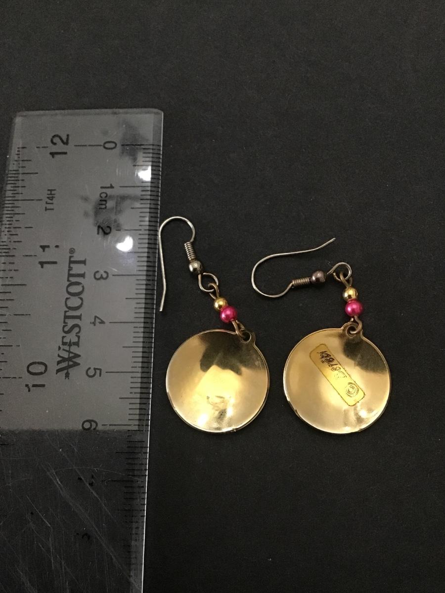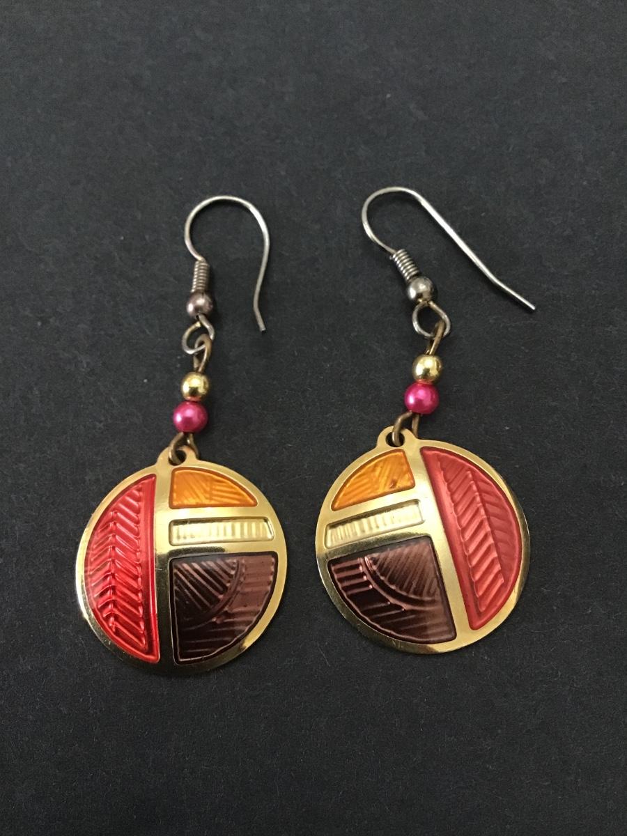 Vintage Berebi red Orange, yellow abstract, enamel gold tone, hook dangle earrings
