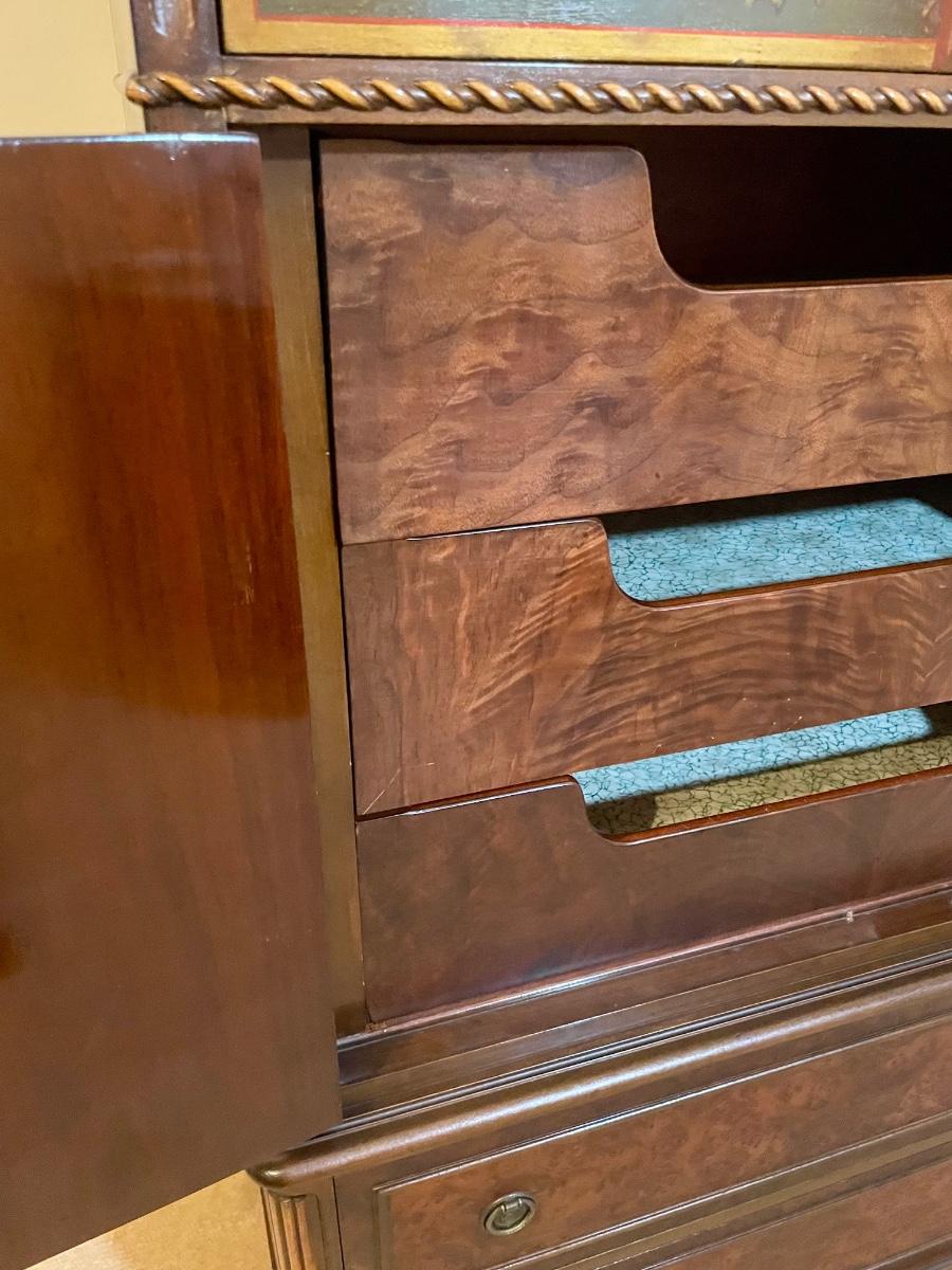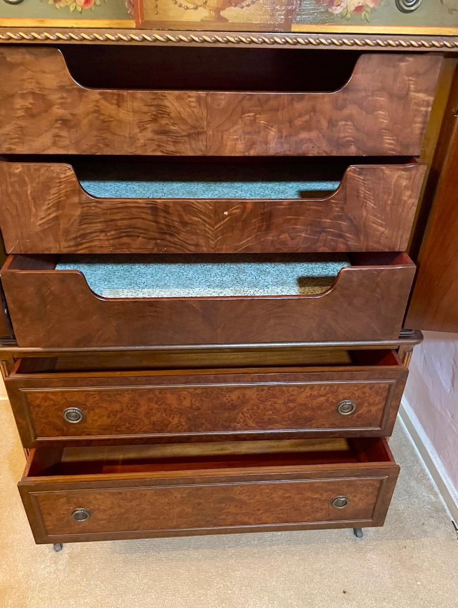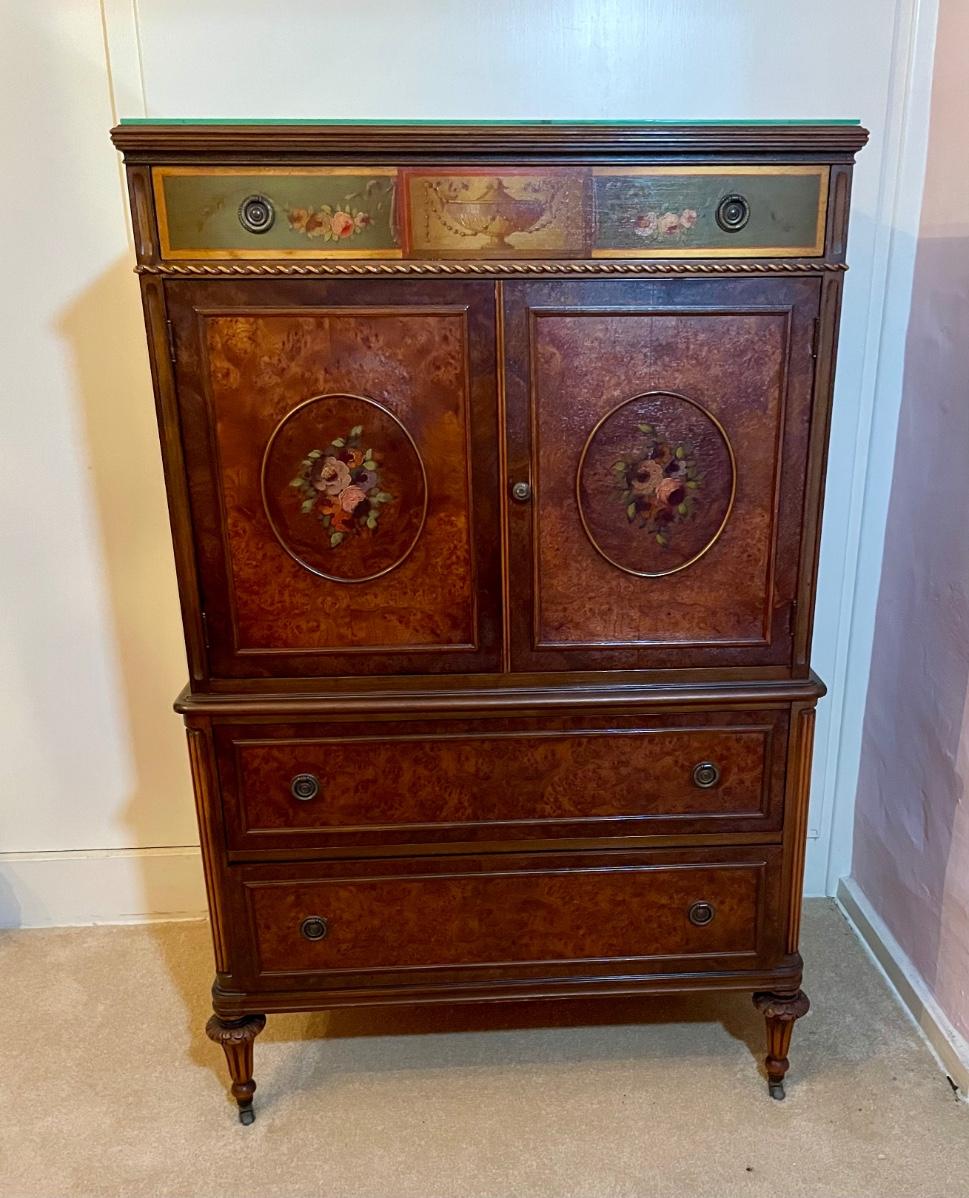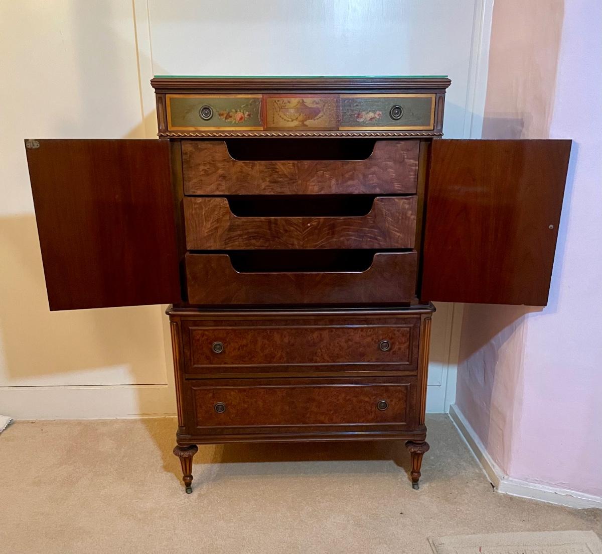 Vintage Berkey and Gay Tall Boy Painted Dresser Inlay Burl Wood and Mahogany
