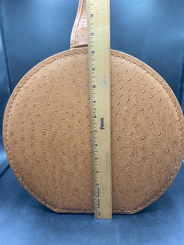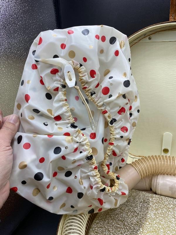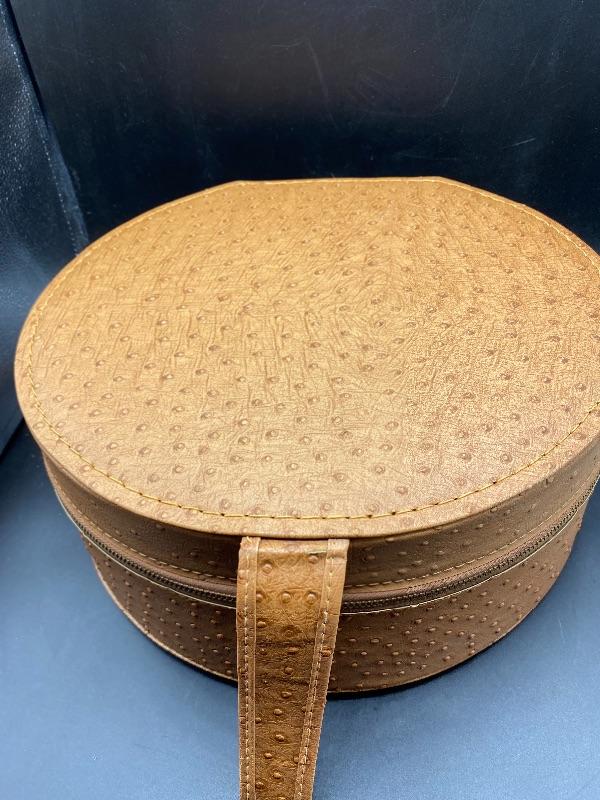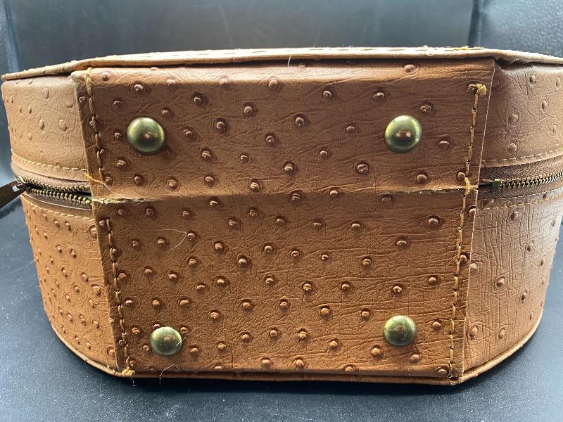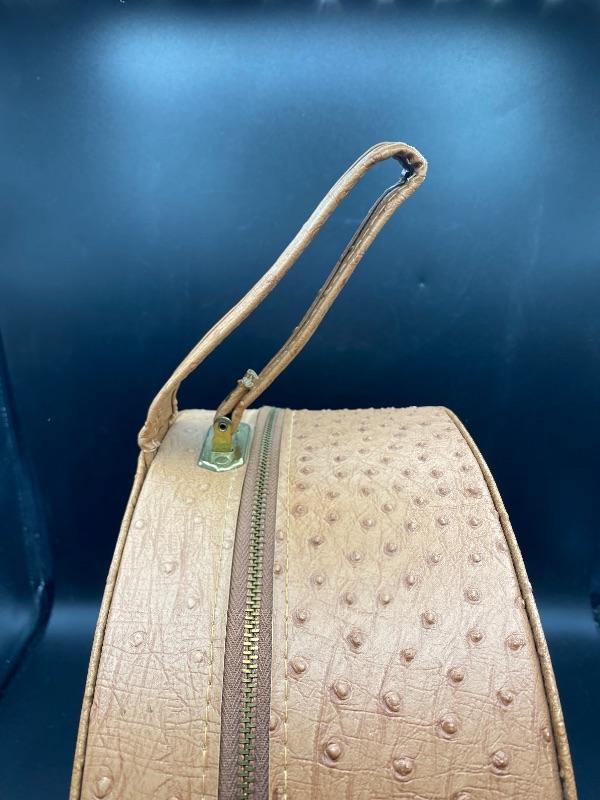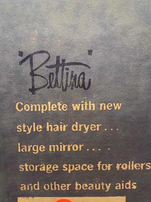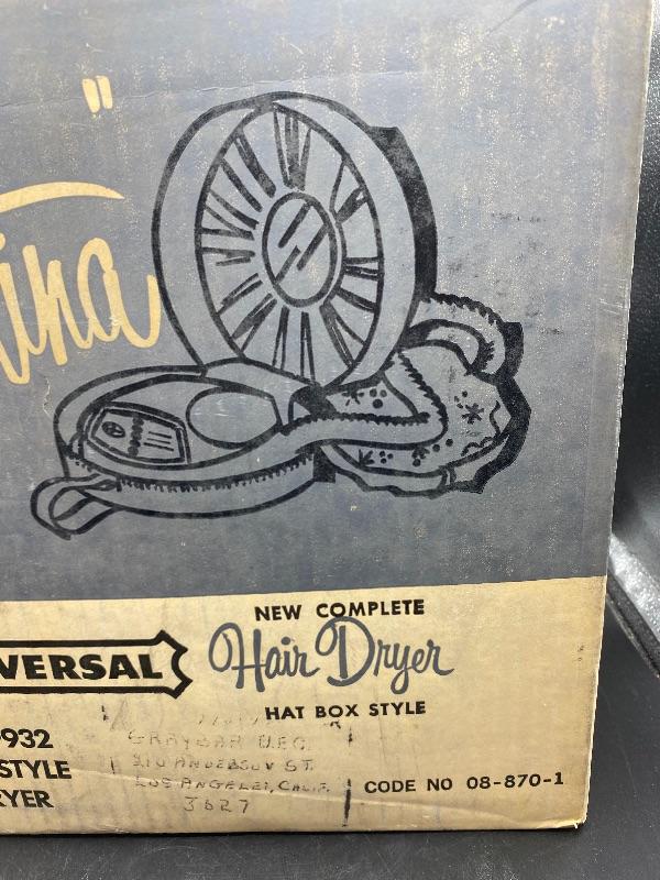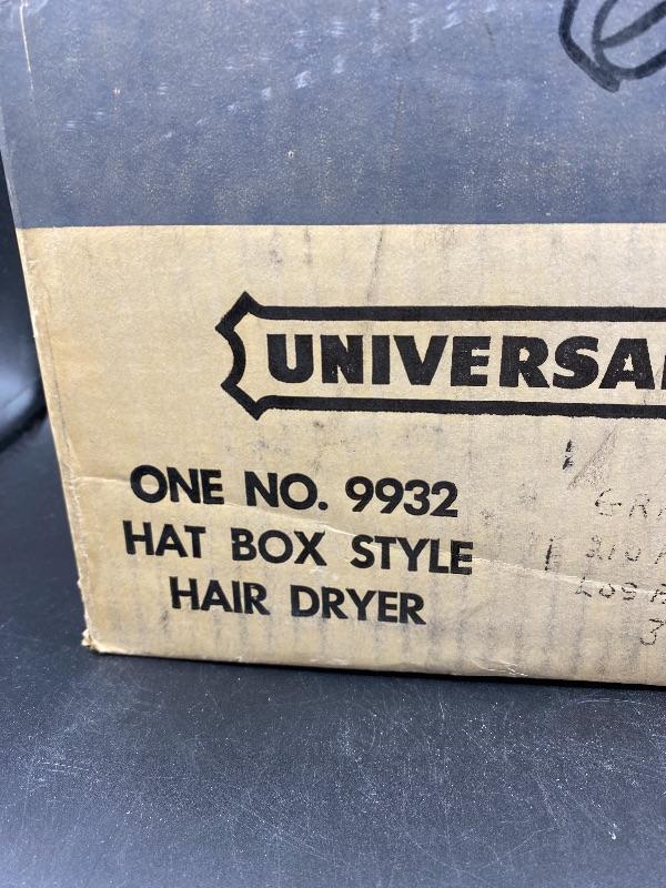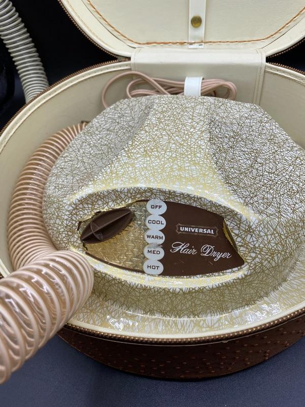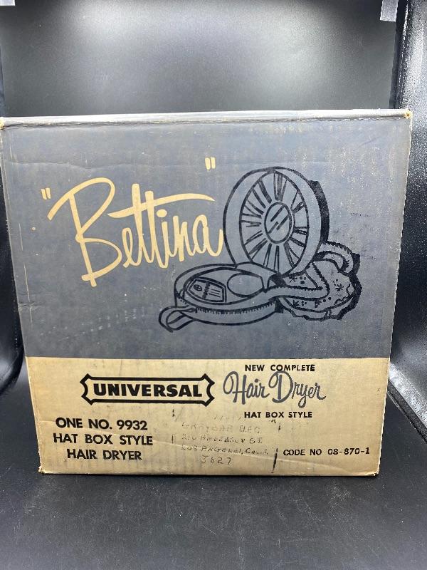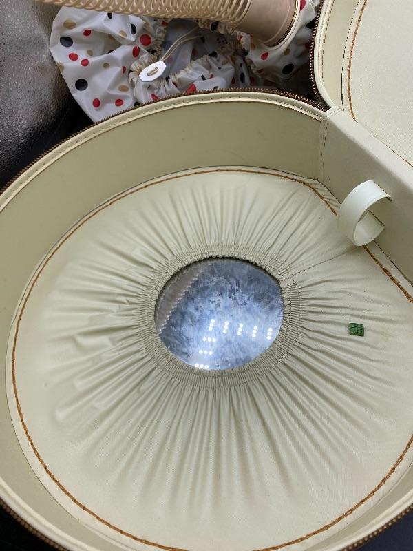 Vintage Bettina hat box style hair dryer. Comes in original box. This hair dryer is probably the neatest I have ever seen. Comes in a tan faux ostrich hat box. Box has a single handle, zipper closes. Inside is the dryer unit. You can remove the dryer from hat box easily, there is a mirror underneath. Dryer has two hoses with it. I plugged it in and it works, I went through the heat settings and you can feel it getting warmer with each setting. It looks unused, the bonnet is in great condition, no yellowing or dirt around the opening.