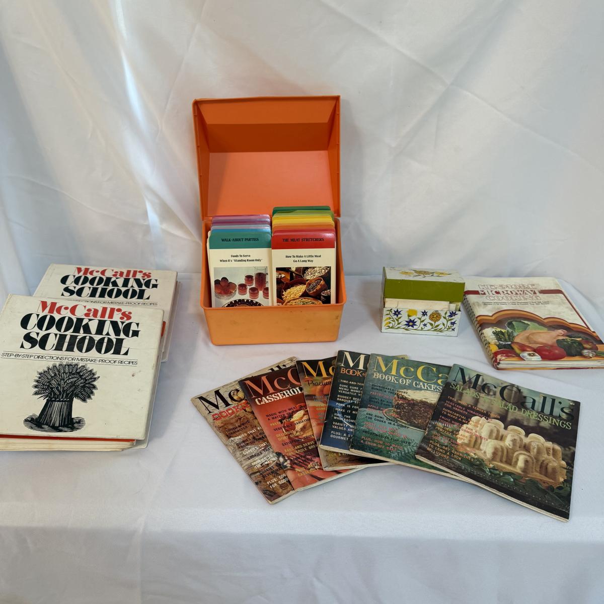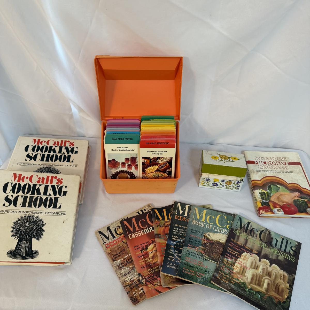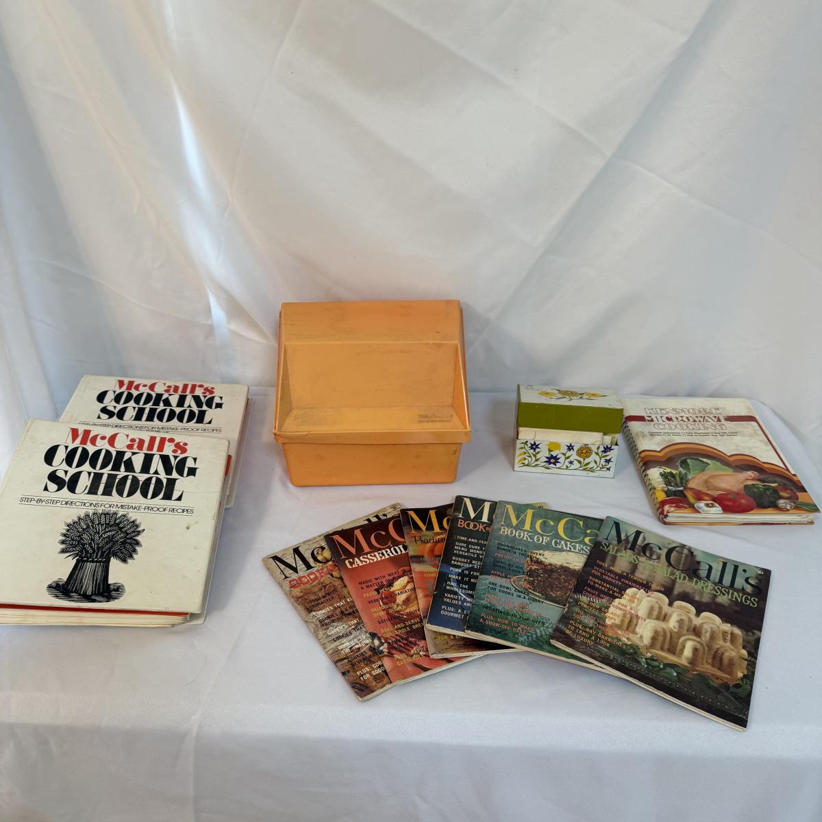 This lot contains an exceptional collection of vintage cookbooks including a Betty Crocker recipe card box that is from 1975 that measures 9.5” x 8” x 8”H, as well as personal recipe box brimming with handwritten recipes, this measures 5.25” x 3.25” x 4”H. Also included are two McCall’s Cooking School books as well as six McCall’s different themed cooking magazines. Lastly we have a Kenmore Microwave Cooking book. Shipping available.