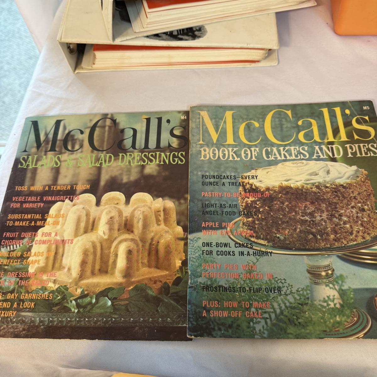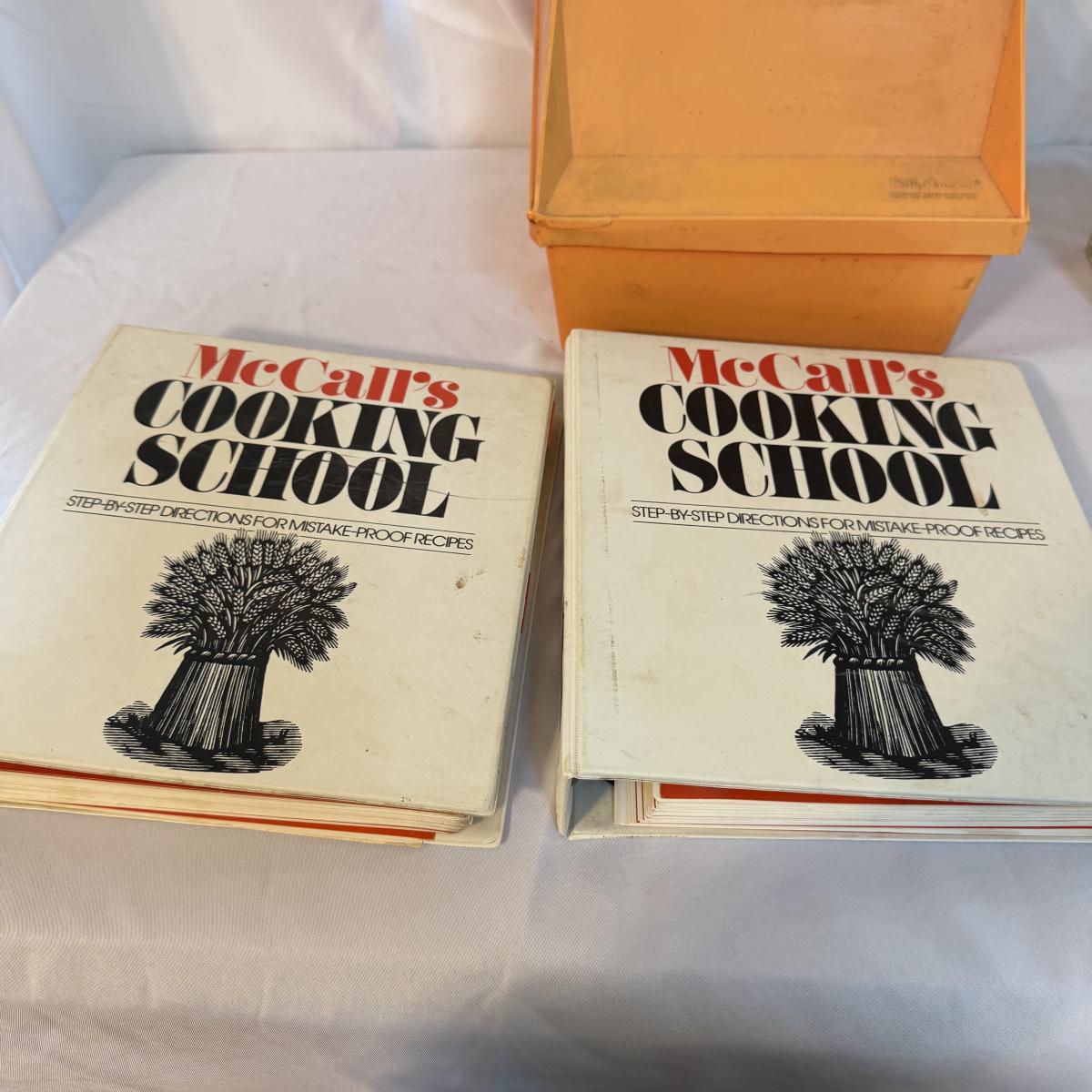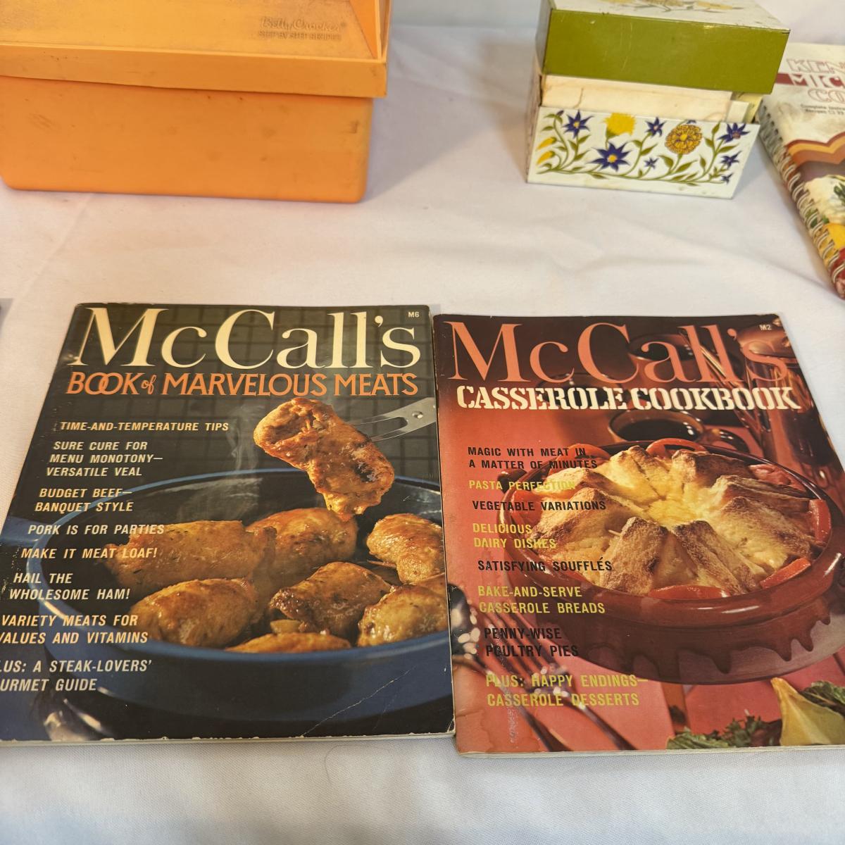 This lot contains an exceptional collection of vintage cookbooks including a Betty Crocker recipe card box that is from 1975 that measures 9.5” x 8” x 8”H, as well as personal recipe box brimming with handwritten recipes, this measures 5.25” x 3.25” x 4”H. Also included are two McCall’s Cooking School books as well as six McCall’s different themed cooking magazines. Lastly we have a Kenmore Microwave Cooking book. Shipping available.