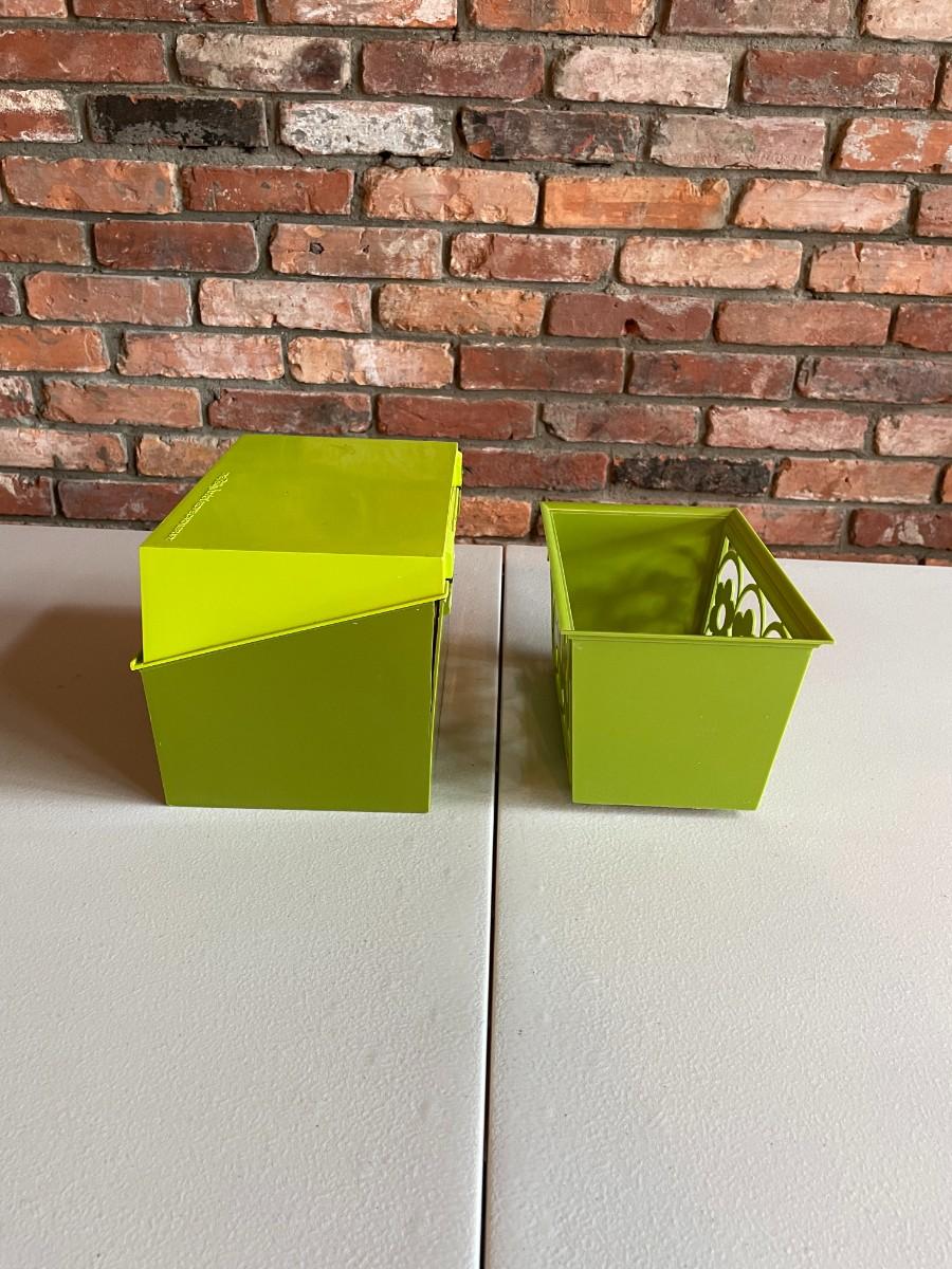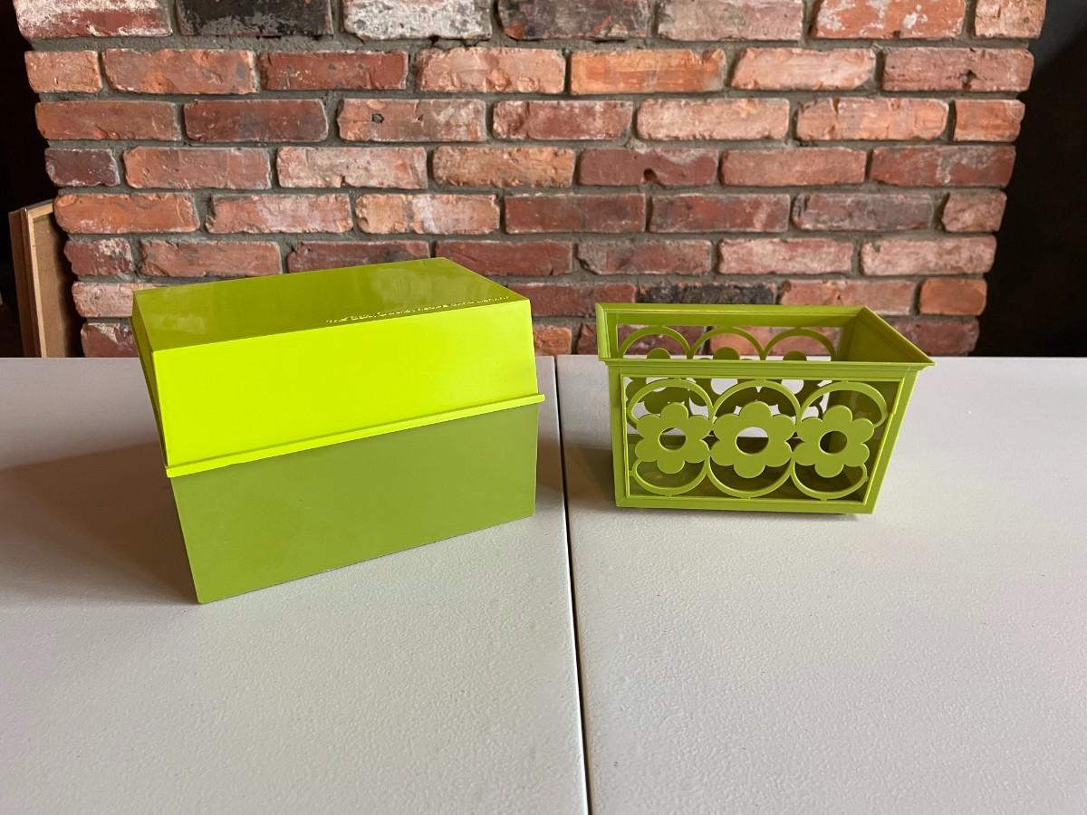 Recipes included in the storage box / container. Both items add a beautiful pop of color to your kitchen!