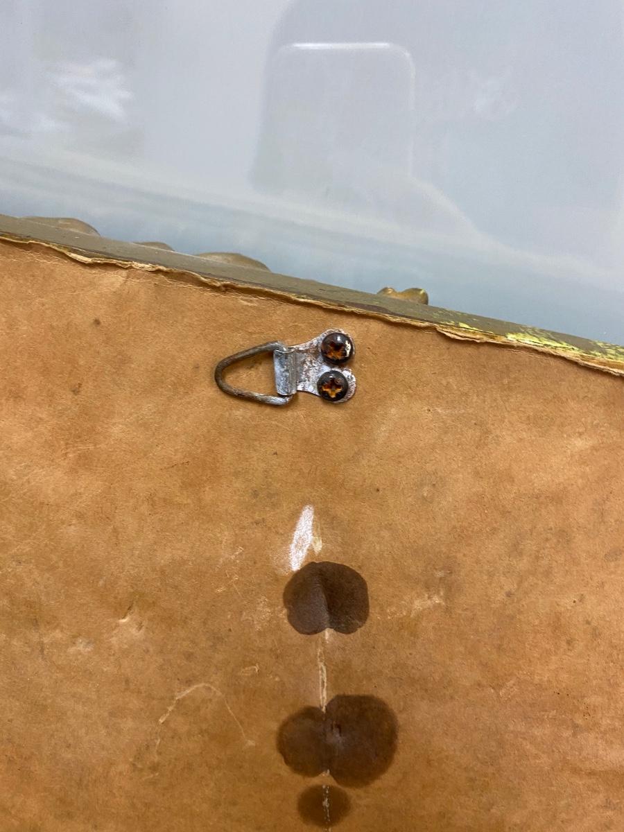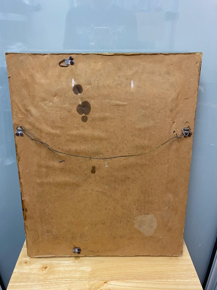 Vintage Beveled Glass Mirror with Ornate Black & Gold Frame. Very heavy. In good condition, some light wear. Has wire for hanging on back.