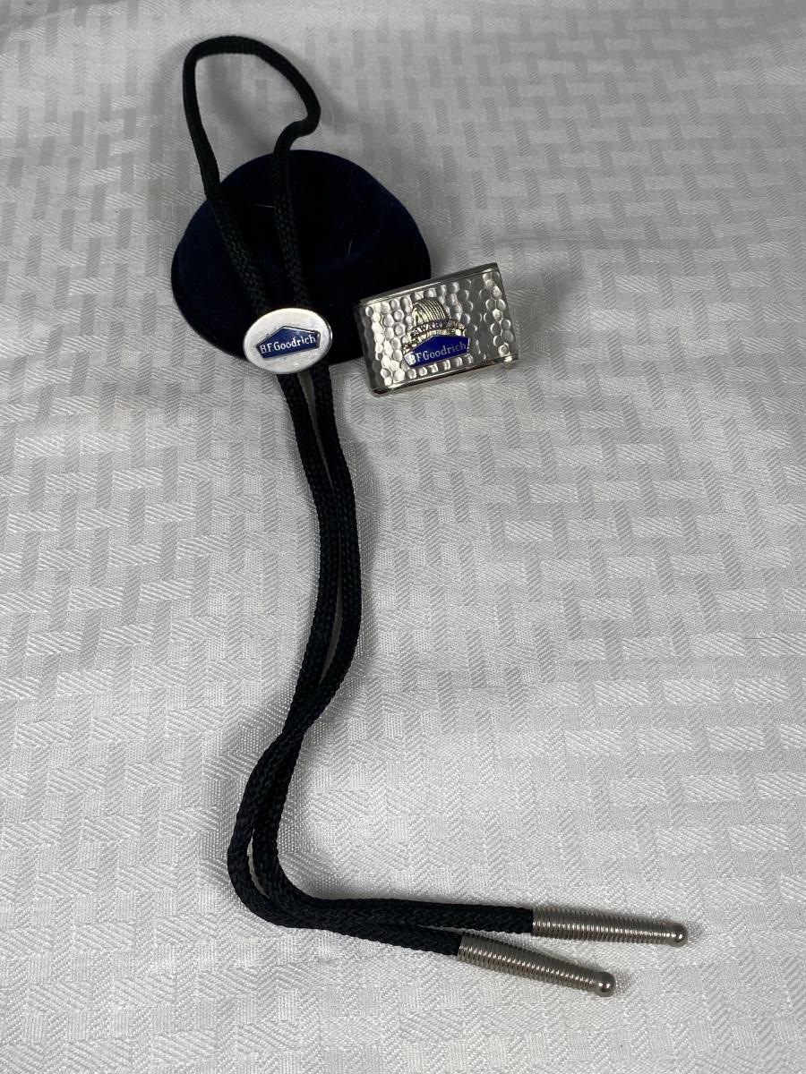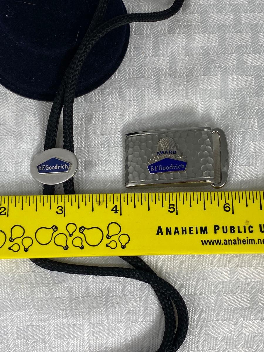 Vintage BF Goodrich Bolo Tie and Service Award Belt Buckle. Both in good condition, unsure of age.