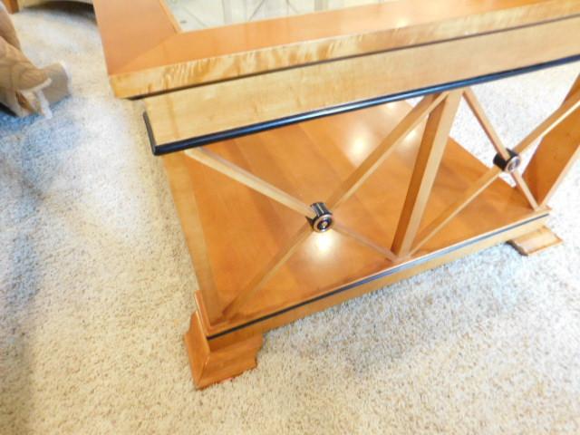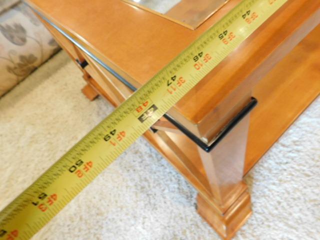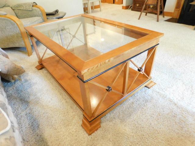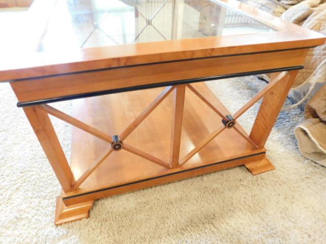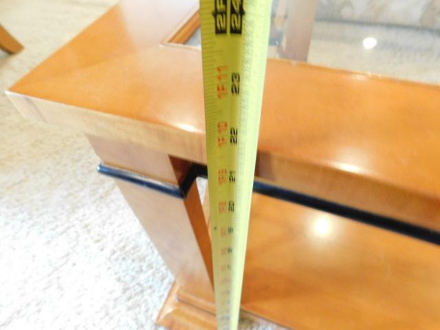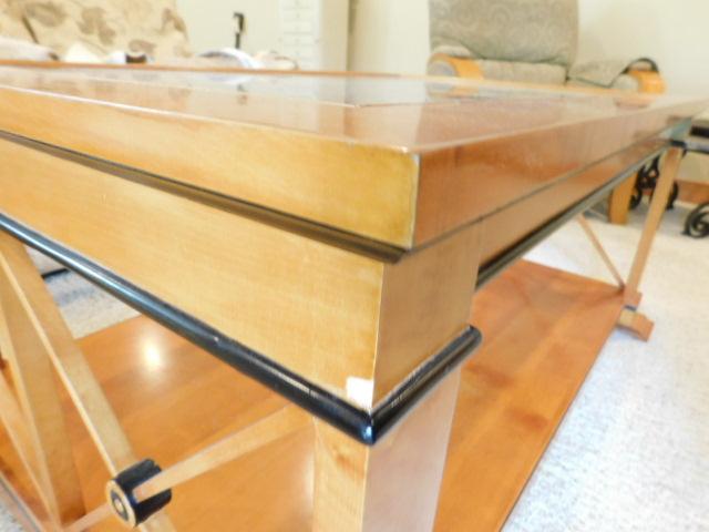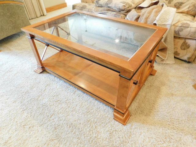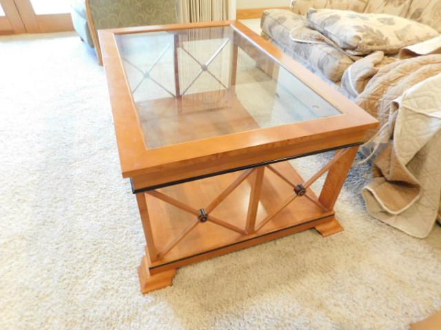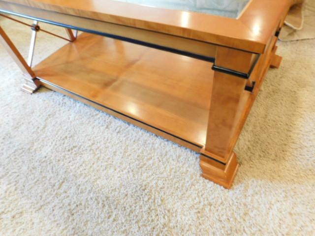 Vintage Biedermeier Design Coffee Table with Glass Top has small chip on finish as shown. Downstairs item