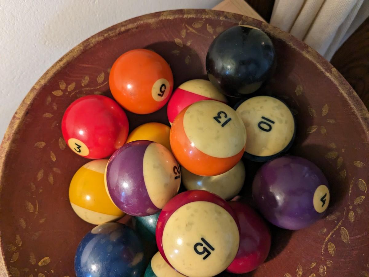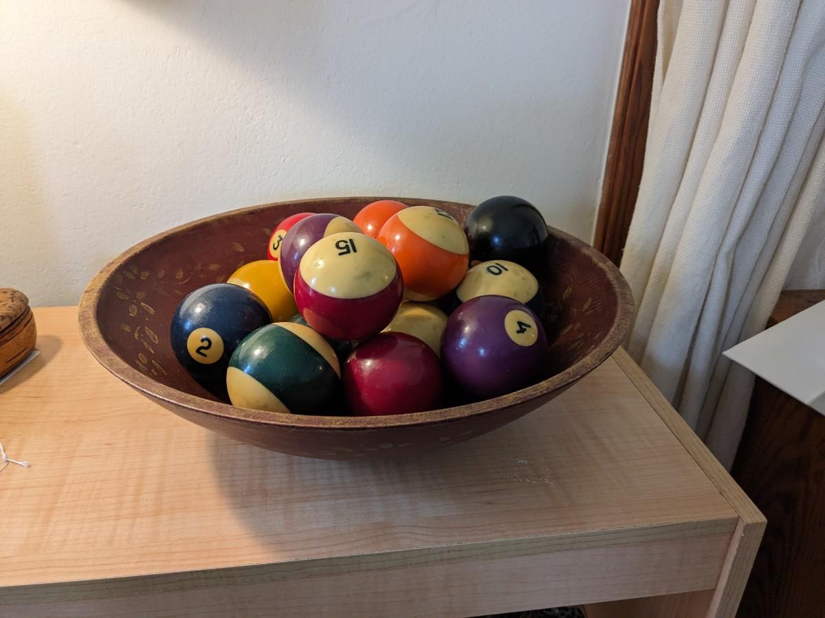 Vintage Billiard Balls with Rosemaling Wood Bowl